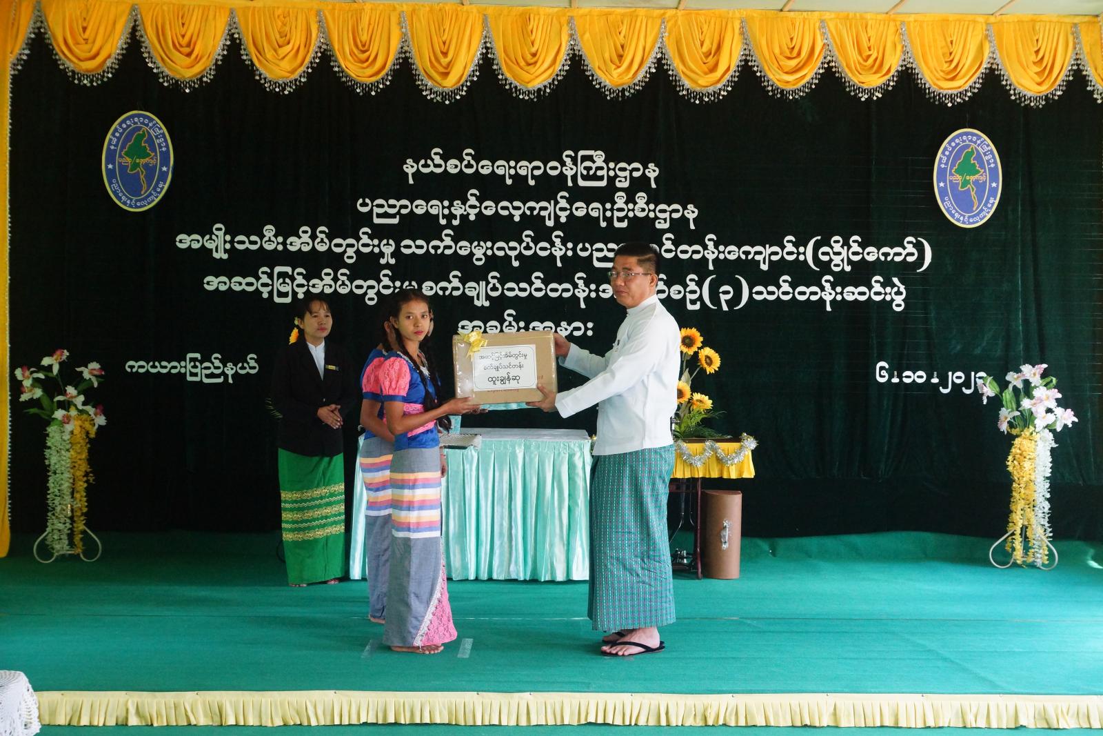 ဆက်လက်ပြီး ပြည်နယ်ဝန်ကြီးချုပ်က အဆင့်မြင့်အိမ်တွင်းမှု စက်ချုပ်သင်တန်း အမှတ်စဉ်(၃)၌ သင်တန်းထူးချွန်ဆုရ သင်တန်းသူတစ်ဦးအား ဂုဏ်ပြုဆုပေးအပ်ချီးမြှင့်ပြီး ကျောင်းအုပ်ကြီးက မြို့နယ်အလိုက် သင်တန်းသူများအား သင်တန်းဆင်းအောင်လက်မှတ်များကို ပေးအပ်ခဲ့သည်။