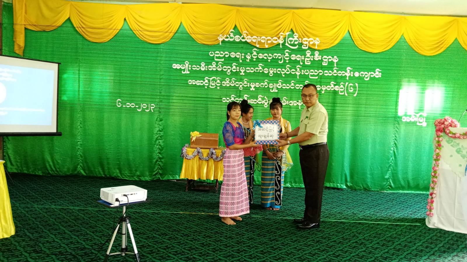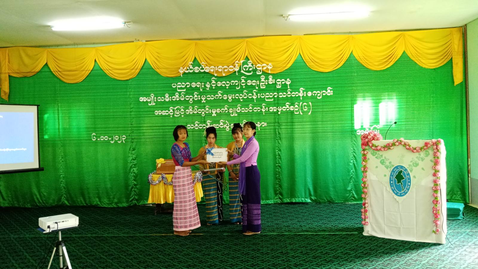 ထို့နောက် ခရိုင်စီမံအုပ်ချုပ်ရေးအဖွဲ့ ဥက္ကဋ္ဌ ဦးအောင်ဇော်ထက်က ထူးချွန်ဆု ရရှိသူ မမေလှိုင်ဖြိုးအား အပ်ချုပ်စက်တစ်လုံးပေးအပ်ချီးမြှင့်ခဲ့ပြီး ခရိုင်မိခင်နှင့်ကလေးစောင့်ရှာက်မှု ကြီးကြပ်ရေးအဖွဲ့ခေတ္တ ဥက္ကဋ္ဌက သင်တန်းသူများအား အဆင့်မြင့်အိမ်တွင်းမှုစက်ချုပ်သင်တန်း အောင်လက်မှတ်များ ချီးမြှင့်ပေးခဲ့ရာ သင်တန်းသူများကိုယ်စား သင်တန်းသူတစ်ဦးက လက်ခံကာ ကျေးဇူးတင်စကားပြောကြားခဲ့ သည်။