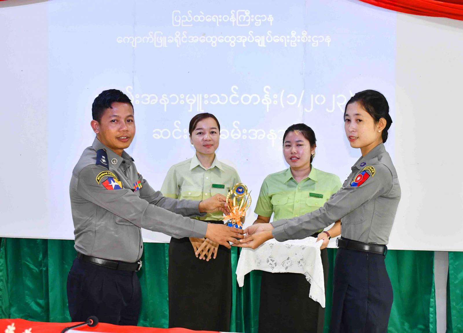 ရှေးဦးစွာ ခရိုင်စီမံအုပ်ချုပ်ရေးအဖွဲ့ဥက္ကဋ္ဌ၊ ခရိုင်အုပ်ချုပ်ရေးမှူး ဦးရဲလင်းမောင်က ယခုလို အခမ်းအနားမှူးသင်တန်းအား ပို့ချသင်ကြားပေးခြင်းအားဖြင့် သင်တန်းသား၊ သင်တန်းသူများသည် အခမ်းအနားမှူးတာဝန်များကို အခက်အခဲမရှိ လွယ်ကူစွာဆောင်ရွက်နိုင်မည်ဖြစ်ပြီး ခရိုင်/မြို့နယ်အတွင်းရှိ အခမ်းအနားများ၊ ဌာနဆိုင်ရာအစည်းအဝေးများ၊ ဘာသာရေးနှင့် သာသနာရေးဆိုင်ရာပွဲများ ကျင်းပသည့်အခါတွင် မလိုလားအပ်သည့် အမှားမျိုးမရှိစေရန် ဆင်ခြင်သုံးသပ်၍ အခမ်းအနားတစ်ခုလုံးကို အဆင်ပြေပြေ ချောချောမွေ့မွေ့ ပြီးမြောက်အောင် ဆောင်ရွက်ပေးနိုင်သည့် မြို့ဂုဏ်ဆောင် အခမ်းအနားမှူးကောင်းများ ထွက်ပေါ်လာမည်ဖြစ်ပါကြောင်း၊ သင်တန်းမှရရှိခဲ့သည့် အတွေ့အကြုံကောင်းများကို အခမ်းအနားများဆောင်ရွက်ရာတွင် စနစ်တကျ လက်တွေ့အသုံးချစေလိုကြောင်း စသည့်ရည်ရွယ်ချက်များဖြင့် သင်တန်းဖွင့်လှစ်ရခြင်းဖြစ်ကြောင်း ဖွင့်လှစ်ရခြင်း၏ အကျိုးကျေးဇူးများနှင့်ပတ်သက်၍ ရှင်းလင်းပြောကြားသည်။ ထို့နောက် သင်တန်းတွင် ထူးချွန်စွာဆောင်ရွက်နိုင်ခဲ့သည့် ပထမ၊ ဒုတိယ၊ တတိယဆုရရှိခဲ့ကြသော ဆုရ သင်တန်းသူများ၊ သင်တန်းအောင်မြင်စွာ တက်ရောက်ပြီးမြောက်ခဲ့ကြသော သင်တန်းသူများနှင့် သင်တန်းနည်းပြဆရာမများကို တာဝန်ရှိသူများက ဂုဏ်ပြုဆုများ၊ သင်တန်းဆင်းလက်မှတ်များနှင့် ဂုဏ်ပြုဆုငွေများ အသီးသီး ပေးအပ်ချီးမြှင့်ခဲ့သည်။
