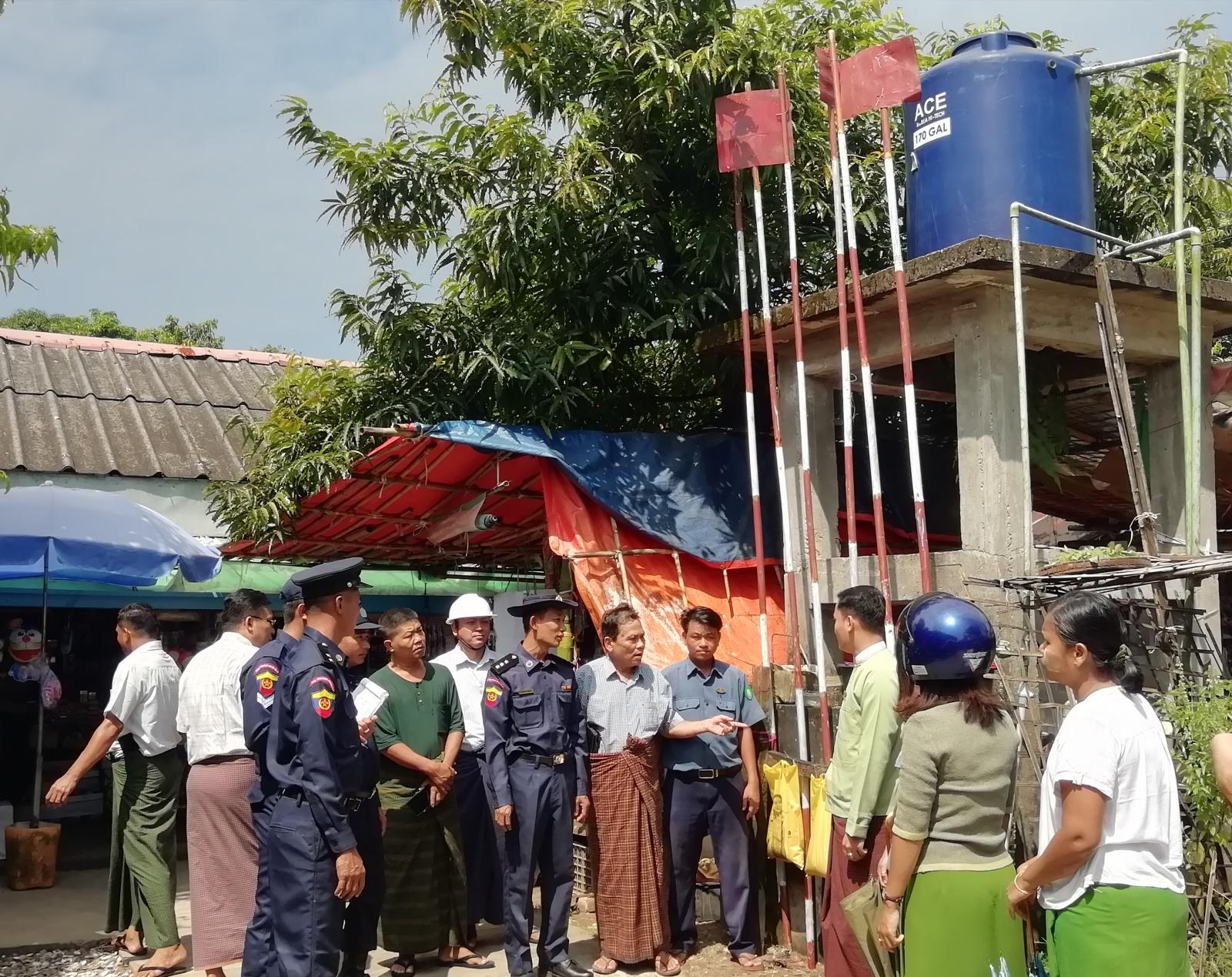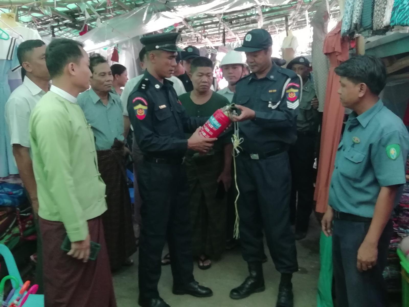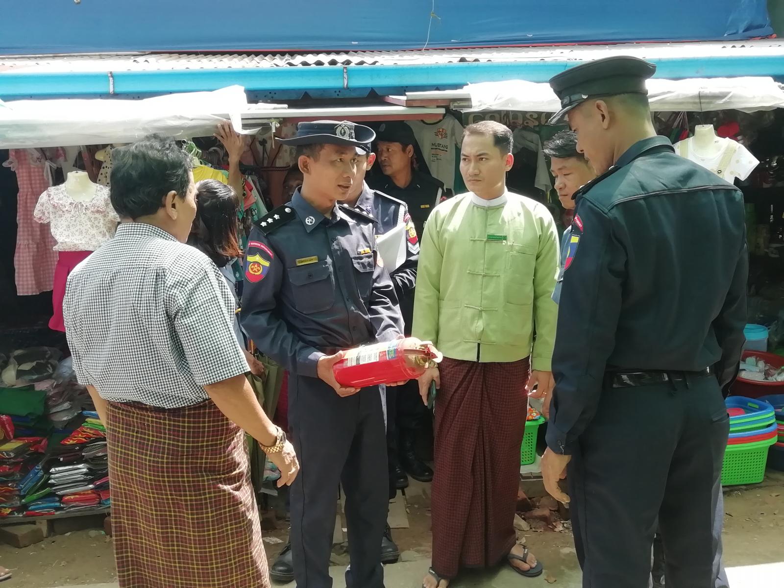 မြို့နယ်အထွေထွေအုပ်ချုပ်ရေးဦးစီးဌာနမှ ဒုတိယဦးစီးမှူး ဦးဇော်မျိုးဝင်း၊ မြို့နယ်မီးသတ်ဦးစီးဌာနမှ ဦးစီးမှူးဦးထိန်လင်းနှင့် မီးသတ်တပ်ဖွဲ့ဝင်များ၊ မြို့နယ်စည်ပင်သာယာရေးအဖွဲ့ အမှုဆောင်အရာရှိ ဦးမောင်စံသိန်းနှင့်ဝန်ထမ်းများ၊ စျေးအကျိုးတော်ဆောင်အဖွဲ့မှ တာဝန်ရှိသူများ၊ ရပ်ကွက်အုပ်ချုပ်ရေးမှူးများ၊ မြန်မာနိုင်ငံရဲတပ်ဖွဲ့ဝင်များ ပါဝင်သောအဖွဲ့က မြို့မစည်ပင်သာယာရေးစျေးအတွင်း မီးဘေးအန္တရာယ်ကြိုတင်ကာကွယ်နိုင်ရေးအတွက် မီးချိတ်၊ မီးကပ်၊ သဲအိတ်၊ ရေအိတ်နှင့် စျေးဆိုင်ခန်းများတွင် မီးသတ်ဆေးဘူးထားရှိ/မရှိတို့ကို စစ်ဆေးခဲ့ကြပြီး စျေးဆိုင်ခန်းပိုင်ရှင်များအား မီးဘေးအန္တရာယ် ကြိုတင်ကာကွယ်ရေးအတွက် လိုအပ်သည်များ အကြံပြုဆွေးနွေးခဲ့ကြောင်း သိရသည်။