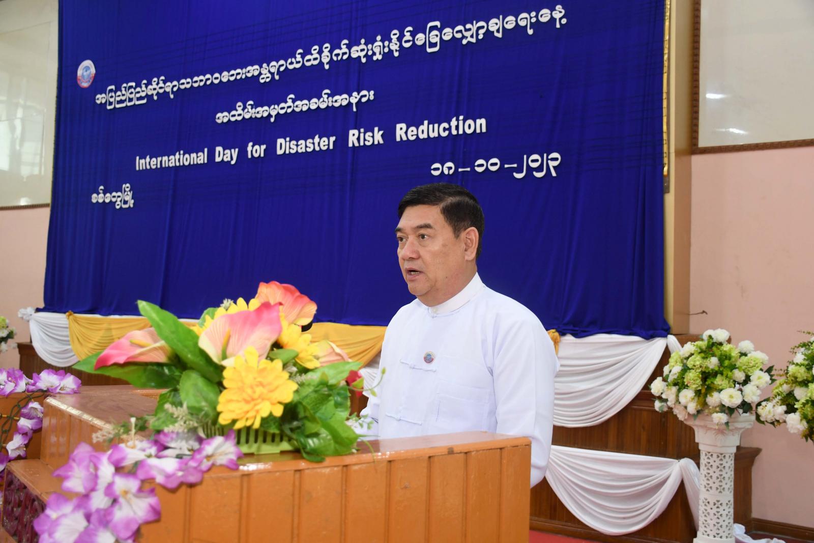 အခမ်းအနားတွင် ရခိုင်ပြည်နယ် သဘာဝဘေးအန္တရာယ်ဆိုင်ရာစီမံခန့်ခွဲမှုအဖွဲ့ဥက္ကဋ္ဌ၊ ရခိုင်ပြည်နယ်ဝန်ကြီးချုပ် ဦးထိန်လင်းက ယခုနှစ် အပြည်ပြည်ဆိုင်ရာ သဘာဝဘေးအန္တရာယ်ထိခိုက်ဆုံးရှုံးနိုင် ခြေလျှော့ချရေးနေ့အတွက် သတ်မှတ်ထားသည့် ဆောင်ပုဒ်က ဘေးဒဏ်ကြံ့ကြံ့ခံနိုင်ဖို့ မညီမျှမှုတွေ တိုက်ဖျက်စို့ဖြစ်ကြောင်း၊ ဆိုလိုသည်မှာ မတူညီသည့်အခြေအနေများရှိကြသော နိုင်ငံများအကြား၊ မတူညီသည့်အခြေအနေရှိကြသော လူပုဂ္ဂိုလ်များအကြား မညီမျှသည့်အခြေအနေများကြောင့် ဘေးဒဏ် ကြံ့ကြံ့ခံနိုင်ရေးအတွက် အတားအဆီး၊ အခက်အခဲများရှိနေကြမှုများကို အားလုံးသော ကမ္ဘာ့နိုင်ငံများက ဝိုင်းဝန်းဖယ်ရှားကျော်လွှားကြပြီး ဘေးအန္တရာယ်များမှ ကြံ့ကြံ့ခံရင်ဆိုင်နိုင်သည့် ကမ္ဘာသူ ကမ္ဘာသားများ ဖြစ်ကြစေရေး ဆောင်ရွက်ကြရန်ရည်ရွယ်တိုက်တွန်းထားခြင်းဖြစ်ကြောင်း၊ သဘာဝဘေးအန္တရာယ်ဆိုင်ရာစီမံခန့်ခွဲမှု လုပ်ငန်းများကို ကမ္ဘာ့နိုင်ငံများ၊ အာဆီယံဒေသတွင်း နိုင်ငံများမှာ ကျယ်ကျယ်ပြန့်ပြန့် ဆောင်ရွက်နေကြသကဲ့သို့ မြန်မာနိုင်ငံမှာလည်း အမျိုးသားသဘာဝဘေး အန္တရာယ်ဆိုင်ရာစီမံခန့်ခွဲမှု ကော်မတီကဦးဆောင်ပြီး တိုင်းဒေသကြီး၊ ပြည်နယ်၊ ခရိုင်၊ မြို့နယ်အဆင့်အထိ သဘာဝဘေးအန္တရာယ်ဆိုင်ရာစီမံခန့်ခွဲမှုအဖွဲ့များကို ဖွဲ့စည်းလျက် သဘာဝဘေးအန္တရာယ်ဆိုင်ရာ စီမံခန့်ခွဲမှုလုပ်ငန်းများကို ပြဋ္ဌာန်းထားပြီးဖြစ်သည့် သဘာဝဘေးအန္တရာယ်ဆိုင်ရာစီမံခန့်ခွဲမှုဥပဒေနှင့်အညီ ဆောင်ရွက်လျက်ရှိကြောင်း၊ ရခိုင်ပြည်နယ်သည်လည်း တည်နေရာအနေအထားအရ သဘာဝဘေးအန္တရာယ်များ အထူးသဖြင့် မုတ်သုံဝင်ရောက်ချိန်မေလနှင့် မုတ်သုန်ဆုတ်ခွာချိန် အောက်တိုဘာလတို့တွင် မုန်တိုင်းအန္တရာယ် ကျရောက်ဖြစ်ပွားနိုင်ခြေမြင့်မားသော ပြည်နယ်တစ်ခုဖြစ်ကြောင်း၊ ယခုနှစ် မေလ ၁၄ ရက်နေ့က အလွန့်အလွန်အားကောင်းသော ဆိုင်ကလုန်းမုန်တိုင်း(မိုခါ)သည် ရခိုင်ကမ်းရိုးတန်းဒေသများကို စစ်တွေမြို့အနီးမှ ဖြတ်ကျော်ဝင်ရောက်ခဲ့သည့်အတွက် မုန်တိုင်းဖြတ်သန်းရာလမ်းကြောင်းတစ်လျှောက် မြို့နယ်(၁၀)မြို့နယ်တွင် ထိခိုက်ဆုံးရှုံးမှုများ များစွာရှိခဲ့ကြောင်း၊ မုန်တိုင်းနှင့်ပတ်သက်ပြီး နိုင်ငံတော်အကြီးအကဲ၏ လမ်းညွှန်မှုနှင့် အမျိုးသားသဘာဝဘေးအန္တရာယ်ဆိုင်ရာ စီမံခန့်ခွဲမှုကော်မတီနှင့်လုပ်ငန်းကော်မတီများ၊ ရခိုင်ပြည်နယ်အစိုးရအဖွဲ့နှင့် ပြည်နယ်အဆင့် ဌာနဆိုင်ရာများအတူလက်တွဲ ပူးပေါင်းကြိုတင်ပြင်ဆင်ဆောင်ရွက်မှုများ၊ တပ်မတော်၏လူအင်အား၊ ပစ္စည်းအင်အားထောက်ပံ့ပေးမှု များကြောင့် မုန်တိုင်းသည် ၂၀၀၈ ခုနှစ်ကဖြစ်ပေါ်ခဲ့သည့် နာဂစ်မုန်တိုင်းနှင့်လေတိုက်နှုန်းတူညီမ