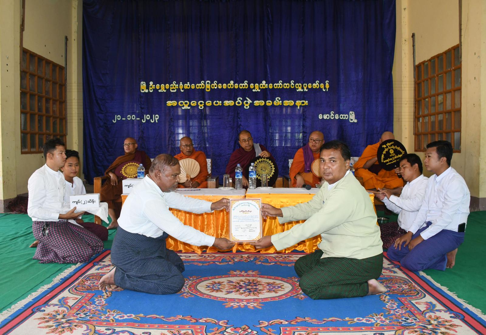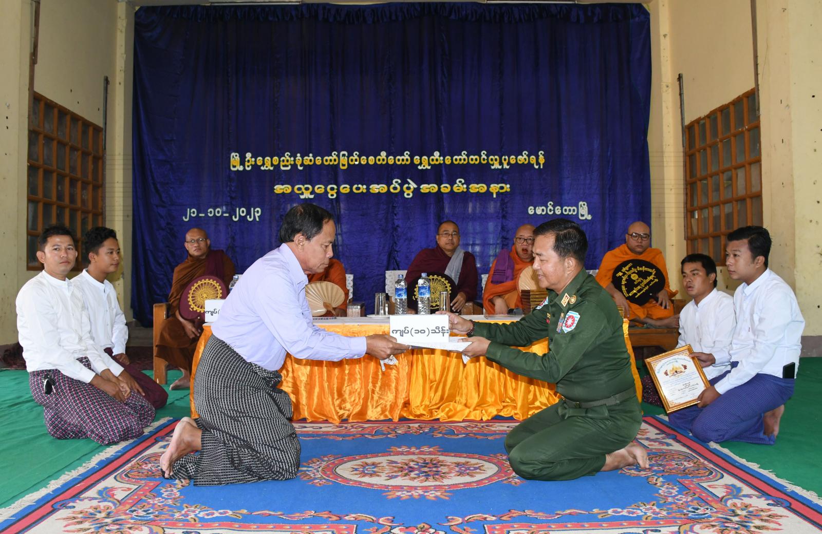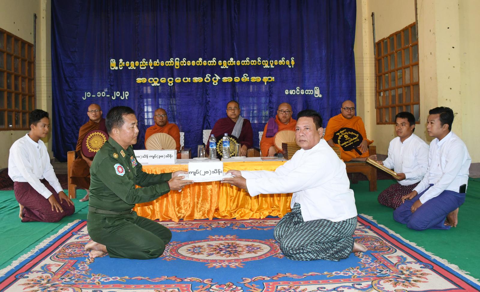 ရခိုင်ပြည်နယ်၊ မောင်တောခရိုင်၊ မောင်တောမြို့၌ မိုခါမုန်တိုင်းဘေးကြောင့် ပျက်စီးခဲ့သော မြို့ဦးရွှေစည်းခုံဆံတော်မြတ်စေတီ ရွှေထီးတော်အသစ်တင်လှူပူဇော်နိုင်ရန်အတွက် အလှူငွေများပေးအပ်ခြင်းကို ယနေ့နံနက် ၉ နာရီအချိန် သာသနာ့ဗိမာန်တော်ကြီးတွင် ကျင်းပပြုလုပ်ခဲ့သည်။