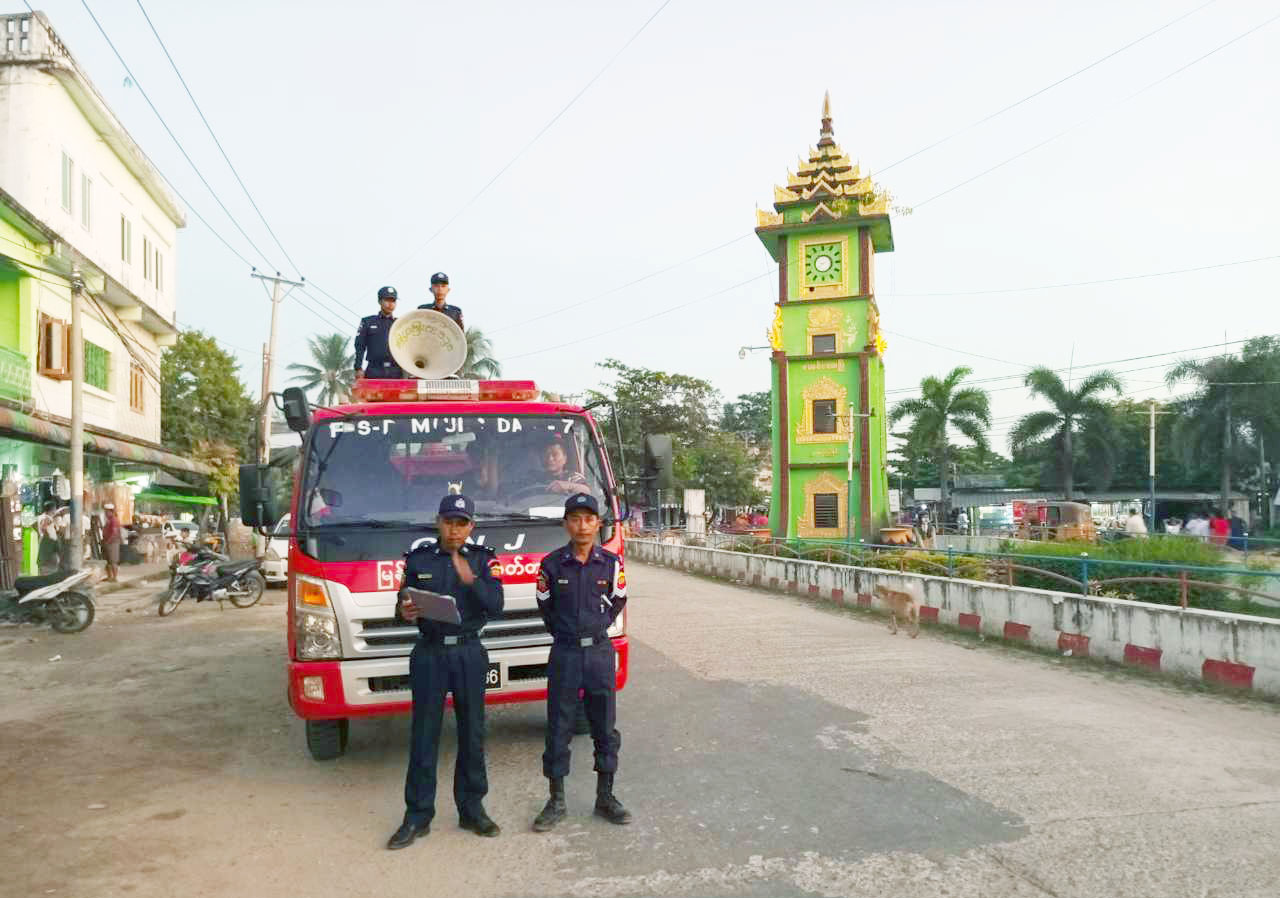 ရခိုင်ပြည်နယ် မောင်တောမြို့၌ မီးဘေးအန္တရာယ် ကြိုတင်ကာကွယ် အသိပညာပေးနှိုးဆော်ခြင်းကို မြို့နယ်မီးသတ်ဦးစီးဌာနမှ တပ်ဖွဲ့ဝင်များက ယမန်နေ့ညနေ ၆ နာရီ အချိန်ခန့် မြို့ပေါ်ရပ်ကွက်များ အတွင်း လိုက်လံနှိုးဆော်ခဲ့ကြသည်။