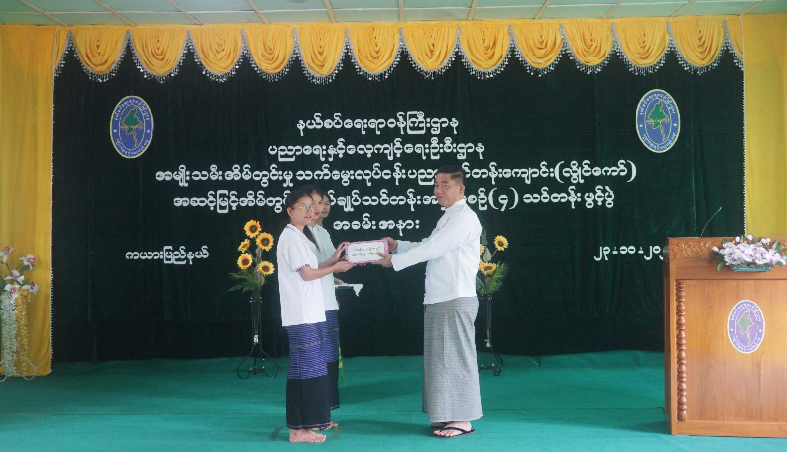 ယင်းနောက် ပြည်နယ်ဝန်ကြီးချုပ်က သင်တန်းကာလအတွင်း သင်တန်းသူများအတွက် ထောက်ပံ့ငွေ စုစုပေါင်းကျပ် (၁၆)သိန်း(၅)သောင်းကိုပေးအပ်ခဲ့ရာ သင်တန်းသူ(၂)ဦးက လက်ခံရယူခဲ့ပြီး သင်တန်းသူများအား ရင်းရင်းနှီးနှီး နှုတ်ဆက်စကားပြောကြားခဲ့သည်။