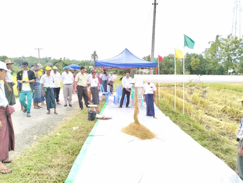 အခမ်းအနားတွင် ရမ်းဗြဲမြို့နယ် စိုက်ပျိုးရေးဦးစီးဌာန၊ မြို့နယ်ဦးစီးမှူး ဦးကျော်ဝင်းက မိုးစပါးစံကွက် ရိတ်သိမ်းမှုနှင့်ပတ်သက်၍ ရှင်းလင်းပြောကြားသည်၊ ထို့နောက် တောင်သူဦးင/မှိုင်း၏ စံပြလယ်ကွက်ဖြစ်သော ကွင်းအမှတ်(၇၁၂ )၊ ဦးပိုင်အမှတ်(၄၈/၂ )၊ ရိတ်သိမ်းဧက ဒသမ (၁၀) ဧကကို ရိတ်သိမ်းခဲ့ပြီး၊ အထွက်နှုန်းမှာ အစိုအထွက်နှုန်း(၁၁၀.၂၅)တင်းနှင့် အခြောက်အထွက်နှုန်း (၁၀၁.၄၃)တင်း ထွက်ရှိကြောင်းကို မြို့နယ်စိုက်ပျိုးရေးဦးစီးဌာနမှ သိရသည်။