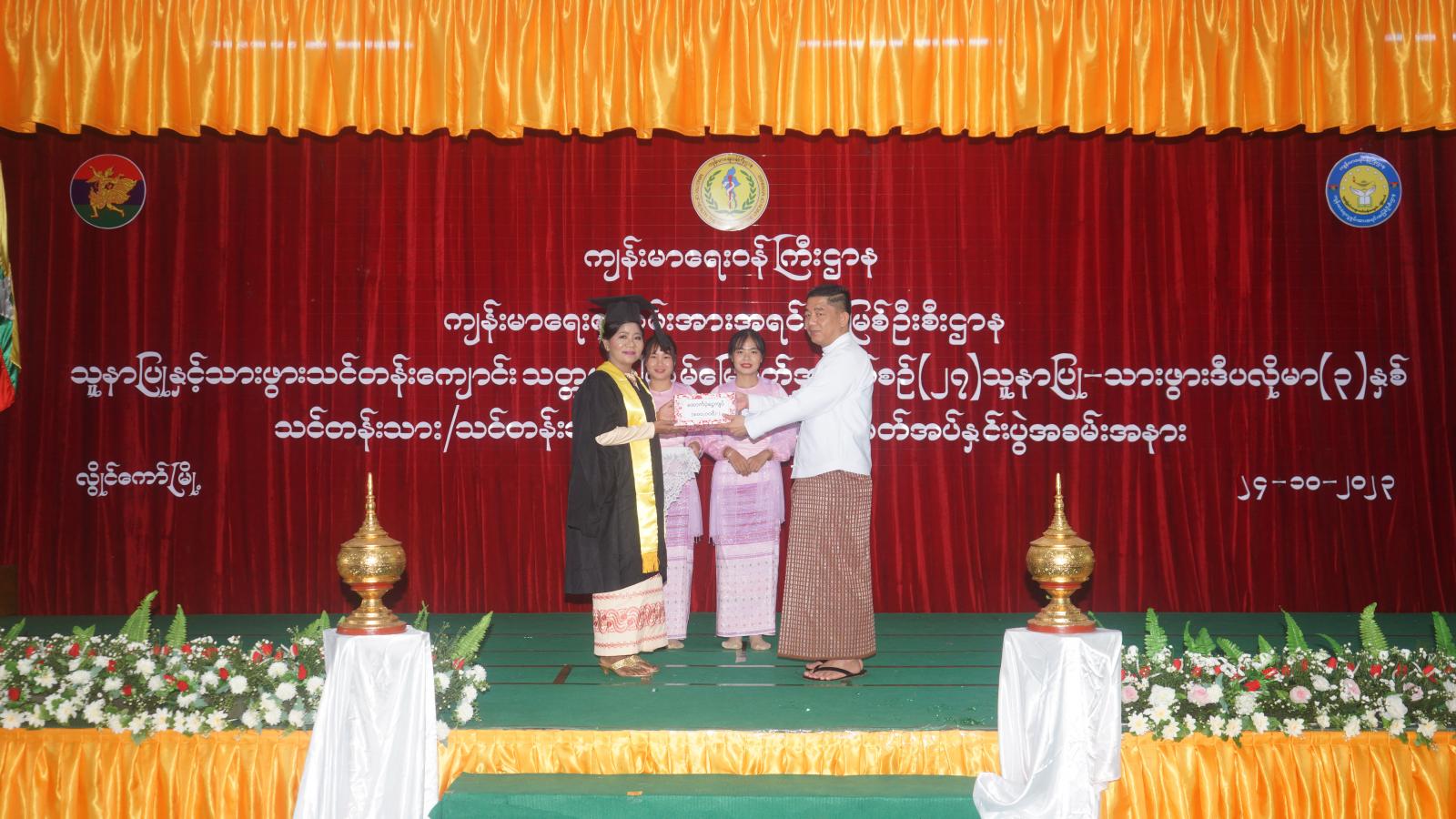 ဆက်လက်၍ သူနာပြု- သားဖွားသင်တန်းကျောင်း(လွိုင်ကော်) ကျောင်းအုပ်ကြီးက သင်တန်းသား၊ သင်တန်းသူ တစ်ဦးချင်းအား ဒီပလိုမာအောင်လက်မှတ်များ ပေးအပ်ခဲ့သည်။