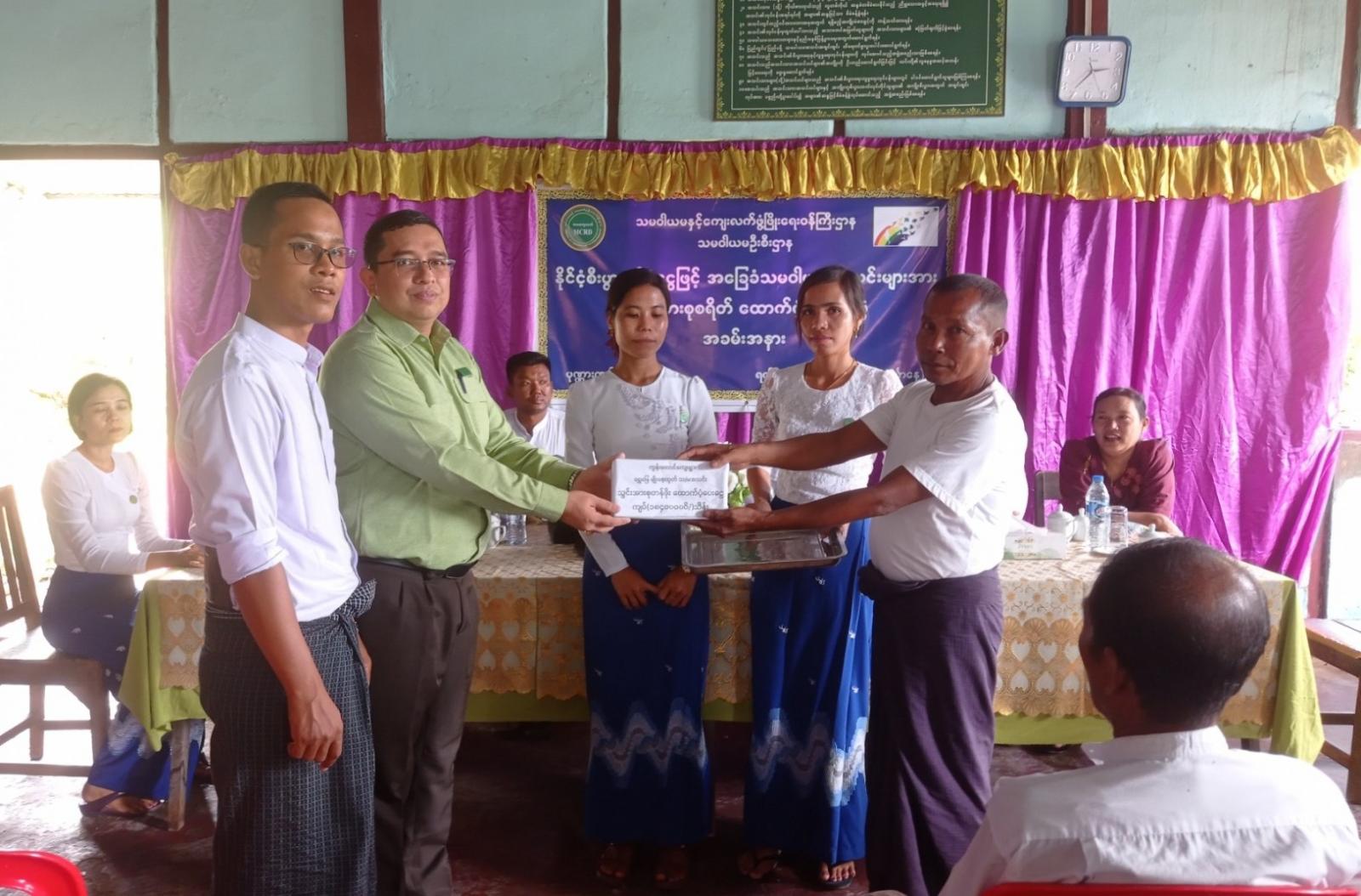 ထို့နောက် သမဝါယမကဏ္ဍ နိုင်ငံ့စီးပွားမြှင့်တင်ရန်ပုံငွေဖြင့် သွင်းအားစု စိုက်ပျိုးမည့် အခြေခံသမဝါယမအသင်း(၆)သင်းသို့ စီမံကိန်းကြီးကြပ်မှုကော်မတီဥက္ကနှင့်အဖွဲ့ဝင်များက သွင်းအားစု မတည်ရန်ပုံငွေများအား ထောက်ပံ့ပေးအပ်ခဲ့ကြသည်။
