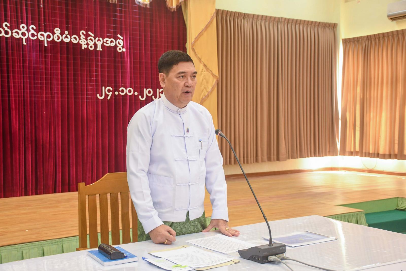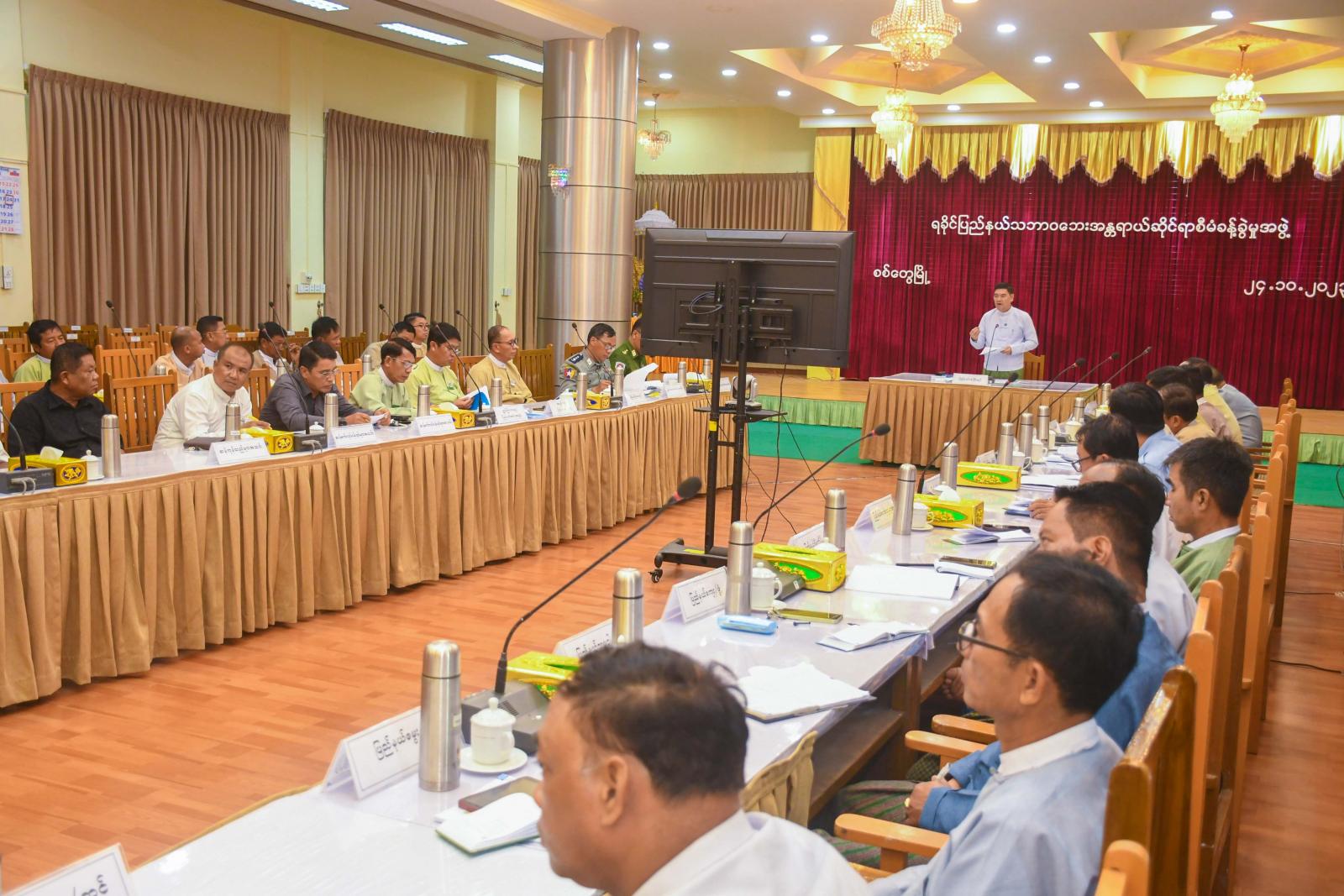 ဦးစွာ ရခိုင်ပြည်နယ်ဝန်ကြီးချုပ် ဦးထိန်လင်းက ယခုနှစ်သည်ယခင်နှစ်များနှင့် နှိုင်းယှဉ်လျှင် မိုးစပါးစိုက် ဧကလည်း အချိန်မှီပြည့်မီအောင် စိုက်ပျိုးနိုင်ခဲ့ကြောင်း၊ မိုခါမုန်တိုင်းကြောင့် ပျက်စီးသွားသောလယ်ယာမြေများအတွက် အထွက်နှုန်းတိုးပြီး အထွက်နှုန်းကောင်းသည့် မျိုးစပါးများကိုလည်း နိုင်ငံတော်ကပံ့ပိုးကူညီထားပါကြောင်း၊ အထွက်နှုန်းကောင်းသော မျိုးစပါးများကို စနစ်တကျစိုက်ပျိုး နိုင်ခဲ့ခြင်းကြောင့် လက်ရှိအနေအထားတွင်လည်း အားရစရာများကောင်းသည်ဟု သတင်းစကားများကြား သိရပါကြောင်း၊ လက်ရှိတွင် စိုက်ပျိုးထား သော မိုးစပါးများကိုအချိန်မှီရိတ်သိမ်းခြင်း၊ ခြွေလှေ့ခြင်းနှင့် အမိုးအကာအောက်ရောက်ရှိအောင် ဆောင်ရွက်နိုင်ရန်ကိစ္စတို့သည် အရေး ကြီးနေပါကြောင်း၊ ယခုအချိန်သည် တောင်သူများအတွက်လည်း များစွာအရေးပါသောအချိန်ဖြစ်ကြောင်း၊ မိမိတို့အနေဖြင့်စနစ်တကျဆောင်ရွက်ခြင်း မလုပ်ဆောင်နိုင်လျှင် အပင်ပန်းခံစိုက်ပျိုးထားသော လယ်ယာမြေဧကများ နိုင်ငံတော်ကထောက်ပံ့ပေးထားသော မျိုးစပါးများ၊ တောင်သူတစ်ဦးချင်း၏ လုပ်အားများ၊ ထို့အတူဌာနဆိုင်ရာအသီးသီး၏ ကူညီပံ့ပိုးမှုများသည် အရာမရောက်ဖြစ်မည့် အနေအထား ဖြစ်ကြောင်း၊ ထို့ကြောင့် မိုးစပါးများကို အချိန်မှီရိတ်သိမ်းခြွေလှေ့ပြီး အမိုးအကာအောက် ရောက်ရှိနိုင်ရန် အလွန်အရေးကြီးသည့်အတွက် ယခုအစည်းအဝေးကို ကျင်းပရခြင်းဖြစ်ကြောင်း၊ မိုးလေဝသနှင့်ဇလဗေဒဦးစီးဌာနကလည်း အောက်တိုဘာလ (၂၄) ရက်နေ့ မြန်မာ စံတော်ချိန် (၈:၃၀) နာရီတွင် တိုင်းတာချက်အရ ဘင်္ဂလားပင်လယ်အော်တွင် မုန်တိုင်းဖြစ်ပေါ်မည်ဖြစ်ကြောင်း ထုတ်ပြန်ထားပြီးဖြစ်ကြောင်း၊ မြန်မာနိုင်ငံသို့ မဝင်ရောက်နိုင်ဟု ခန့်မှန်းထားသော်လည်း မုန်တိုင်းအရှိန်ကြောင့် မိုးသည်းထန်စွာ ရွာသွန်းနိုင်သည့်အတွက် မိမိတို့ခရိုင်၊ မြို့နယ်များတွင် စိုက်ပျိုးထားသည့် မိုးစပါး၊ မိုးသီးနှံများနှင့်ပတ်သက်ပြီး ပျက်စီးဆုံးရှုံးမှုမရှိစေရန် စိုက်ပျိုးရေးဦးစီးဌာနမှ နှိုးဆော်ချက်များအတိုင်း ဆောင်ရွက်ရန်လိုအပ်မည်ဖြစ်ကြောင်း၊ ရင့်မှည့်နေသော မိုးစပါးစိုက်ခင်းများအား အမြန်ဆုံးရိတ်သိမ်းနိုင်ရန် လူအင်အားစီမံခန့်ခွဲမှုအပိုင်းတွင် အားနည်းချက်ရှိသည့် အတွက် စက်ယန္တရားများဖြင့် အချိန်မှီရိတ်သိမ်းနိုင်ရန် အရေးကြီးလာပါကြောင်း၊ အစိုးရပိုင်စက်များ၊ ဌာနပိုင်စက်များနှင့်ပုဂ္ဂလိကပိုင်စက်များဖြင့် ရိတ်သိမ်းသွားရမည်ဖြစ်ကြောင်း၊ ထိုစက်ယန္တရားများကို မြို့နယ် အသီးသီးတွင်ဖြန့်ခွဲထားခြင်းကြောင့် အမှန်လိုအပ်သည့်နေရာ၊ အရေးတကြီးလိုအပ်သည်နေရာများတွင် ပေါင်းစပ်ညှိနှိုင်းဆောင်ရွက်န