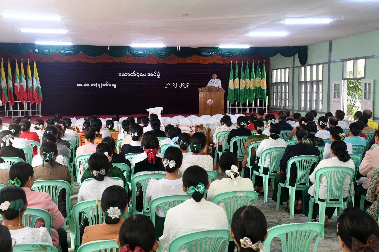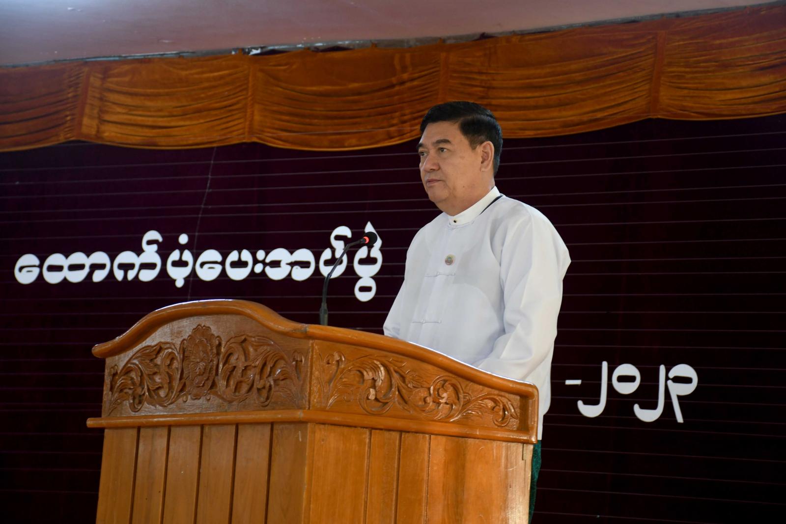 အခမ်းအနားတွင် ရခိုင်ပြည်နယ်ဝန်ကြီးချုပ် ဦးထိန်လင်းက ရခိုင်ပြည်နယ် အစိုးရအဖွဲ့အနေဖြင့် ဌာနဆိုင်ရာ ဝန်ထမ်းများကို စားရေရိက္ခာများ အထိုက်အလျောက် ထောက်ပံ့ပေးလျက်ရှိကြောင်း၊ ဌာနဆိုင်ရာဝန်ထမ်းများ သာမက ရခိုင်ပြည်နယ်၏ ပညာရေးတိုးတက်မြင့်မားစေရေးအတွက် ကြိုးပမ်းအားထုတ်လျက်ရှိကြသော ဆရာ၊ ဆရာမများနှင့် ပညာရေးဝန်ထမ်းများကိုလည်း အားပေးချီးမြှောက်သောအားဖြင့် ယခုကဲ့သို့ အခမ်းအနားဖြင့် ထောက်ပံ့ပေးခြင်းဖြစ်ကြောင်း၊ ရခိုင်ပြည်နယ်မှာ ဆိုင်ကလုန်းမုန်တိုင်း(မိုခါ)တိုက်ခတ်ပြီး နောက်တစ်နေ့တွင် နိုင်ငံတော်အကြီးအကဲကိုယ်တိုင် ရောက်ရှိလာပြီး မုန်တိုင်းတိုက်ခတ်ပြီပြီး ပြည်လည်ထူထောင်ရေး ဆောင်ရွက်သည့်အခါ နိုင်ငံတော်အကြီးအကဲက ယခင်အခြေအနေထက်သာလွန်ကောင်းမွန်သည့် အခြေအနေတစ်ရပ်ကို ရောက်အောင် ဆောင်ရွက်ရန် လမ်းညွှန်မှာကြားခဲ့ကြောင်း၊ ဦးစွာမှာကြားသည်မှာ ပညာရေးဖြစ်ကြောင်း၊ ကျောင်းများဖွင့်လှစ် သင်ကြားချိန်ရောက်ရှိမည်ဖြစ်သည့်အတွက် ကျောင်းများဖွင့်လှစ်သင်ကြားနိုင်ရေးချက်ချင်း ဆောင်ရွက်ခဲ့ကြခြင်းကြောင့် ဇွန်လ ၁ ရက်နေ့တွင်ကျောင်းများကို တစ်နိုင်ငံလုံးနည်းတူ ဖွင့်လှစ်နိုင်ခဲ့ကြောင်း၊ ထို့အတူ ကျန်းမာရေးလုပ်ငန်းများ၊ သာသနိကအဆောက်အအုံများကို ပြည်နယ်အစိုးရ အဖွဲ့၊ တပ်မတော်၊ ဌာနဆိုင်ရာဝန်ထမ်းများ၊ လူမှုရေးအဖွဲ့အစည်းများ၊ ပြည်သူများနှင့် လူမှုအလွှာ အသီးသီးက ပြည်သူများပူးပေါင်းပါဝင်ဆောင်ရွက်မှုကြောင့် အချိန်တို့အတွင်းမှာ ပြန်လည်ထူထောင်ရေးလုပ်ငန်း များကို ဆောင်ရွက်နိုင်ခဲ့ခြင်းဖြစ်ကြောင်း၊ အချိန်တိုအတွင်းမှာ လျှပ်စစ်မီးရရှိအောင်၊ လမ်းများဖွင့်လှစ် နိုင်အောင် ဆောင်ရွက်နိုင်ခဲ့ပါကြောင်း၊ ယခုကဲ့သို့ပြောပြခြင်းသည် နေရာတစ်ခုကို ပြန်လည်ထူ ထောင်သည့်အခါ အခက်အခဲပေါင်းမျိုးစုံကို ကျော်လွှားကာ ဆောင်ရွက်ခဲ့ရသည်ကို သိစေလိုသည့်အတွက်ကြောင့်ဖြစ်ကြောင်း၊ ဝိုင်းဝန်းပြီးဆောင်ရွက်ခဲ့သည့်အား၊ ပြည်ထောင်စု ၏အား၊ ပြည်နယ်မှာရှိ သောဌာနဆိုင်ရာများ၏အား၊ လူထုအလွှာအသီးသီးတို့၏အားဖြင့် ဆောင်ရွက်ခဲ့ရသည်ကို ကျောင်းသား၊ ကျောင်းသူများနှင့် သားသမီး လူငယ်များကို သိစေချင်၍ ပြောကြားခြင်းဖြစ်ကြောင်း၊ ကျောင်းသား၊ ကျောင်းသူများသည် နောင်တစ်ချိန်တွင် မိမိတို့ဒေသကို ဦးဆောင်ဦးရွက်ပြုမည့် လူငယ်များ၊ မျိုးဆက်သစ်များ၊ အနာဂတ်၏ခေါင်းဆောင်များ ဖြစ်ကြောင်း၊ အခြေအနေမှန်ကို သိရှိပြီးမိမိတို့ဒေသကို ကာကွယ်ရမည်၊ စောင့်ရှောက်ရမည်၊ ဖွံ့ဖြိုးတိုးတက်အောင် ဆောင်ရွက်ကြရမည်ဖြစ်ကြောင်း၊ ပျက်စီးခြင်းသည် လွယ်ကူသော်လည်း ပြန်လည်ထူထောင်သည့်အခါ မည်ကဲ့သို့ခက်ခဲသ