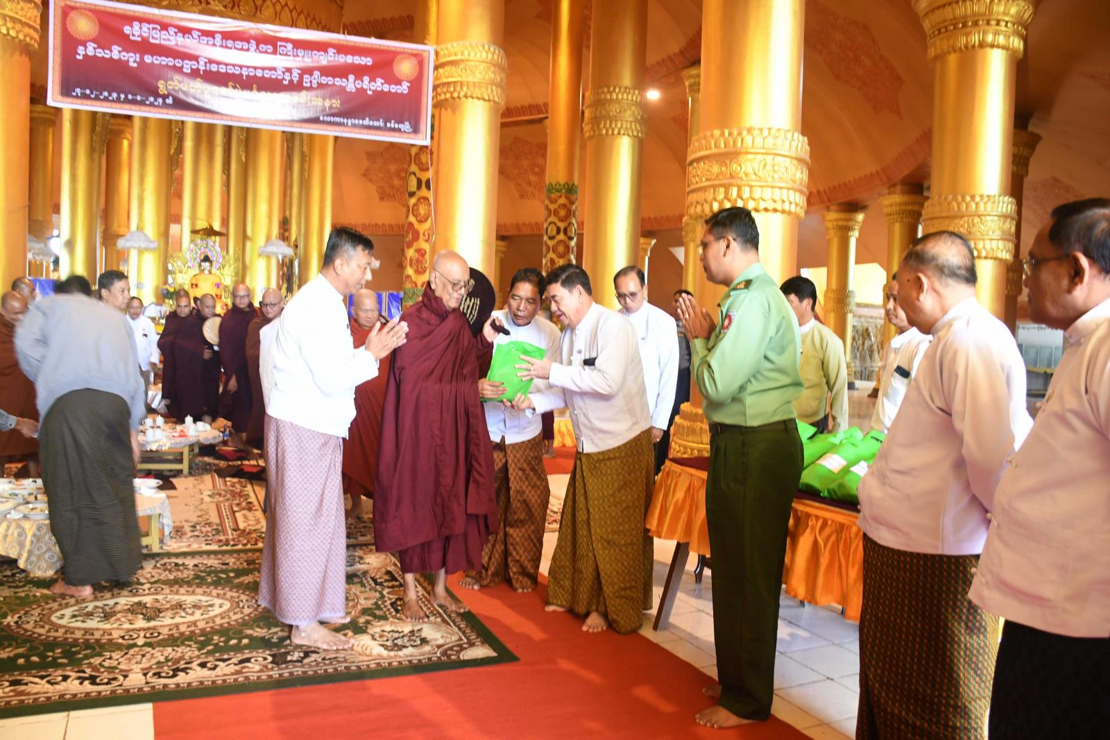ရှေးဦးစွာ ပြည်နယ်ဝန်ကြီးချုပ်နှင့် တက်ရောက်လာကြသူများက နမောတဿသုံးကြိမ်ရွတ်ဆို ကန်တော့၍ အခမ်းအနားကိုဖွင့်လှစ်ပြီး ပြည်နယ်ဩဝါဒါစရိယ၊ စစ်တွေမြို့ နန္နာရာမပရိယတ္တိစာသင်တိုက် ပဓာနနာယက၊ အဂ္ဂမဟာပဏ္ဍိတ၊ အဂ္ဂမဟာဂန္ထဝါစကပဏ္ဍိတ ဆရာတော်ဘဒ္ဒန္တနန္ဒသိရီ မဟာထေရ်မြတ်ထံမှ ပြည်နယ်ဝန်ကြီးချုပ်နှင့် ပရိသတ်များက ငါးပါးသီလခံယူဆောက်တည်ကြသည်။ ထို့နောက် သံဃာတော်အရှင်သူမြတ်များက မေတ္တသုတ်ပရိတ်တရားတော်များ ရွတ်ပွားသရဇ္စျာယ်ချီးမြှင့်တော်မူ၍ စစ်တွေမြို့ လောကာနန္ဒာစေတီတော် ဂေါပကအဖွဲ့၏ ဩဝါဒါစရိယ၊ စစ်တွေမြို့ ဒက္ခိဏာရာမ ပရိယတ္တိစာသင်တိုက် ဦးစီးပဓာနနာယက၊ မဟာဂန္ထဝါစကပဏ္ဍိတ၊ ဘဒ္ဒန္တမေဃိယက အနုမောဒနာဂါထာဖတ်ကြားပြီး ပြည်နယ်ဝန်ကြီးချုပ်နှင့်အဖွဲ့သည် ပရိယတ္တိစာသင်တိုက်များနှင့် ကျောက်းတိုက်အသီးသီးတို့အား ဆွမ်းဆန်တော်များ ဆက်ကပ်လှူဒါန်းခြင်းနှင့် သံဃာတော်အရှင်သူမြတ်များအား လှူဖွယ်ပစ္စည်းများ ဆက်ကပ်လှူဒါန်းကြသည်။