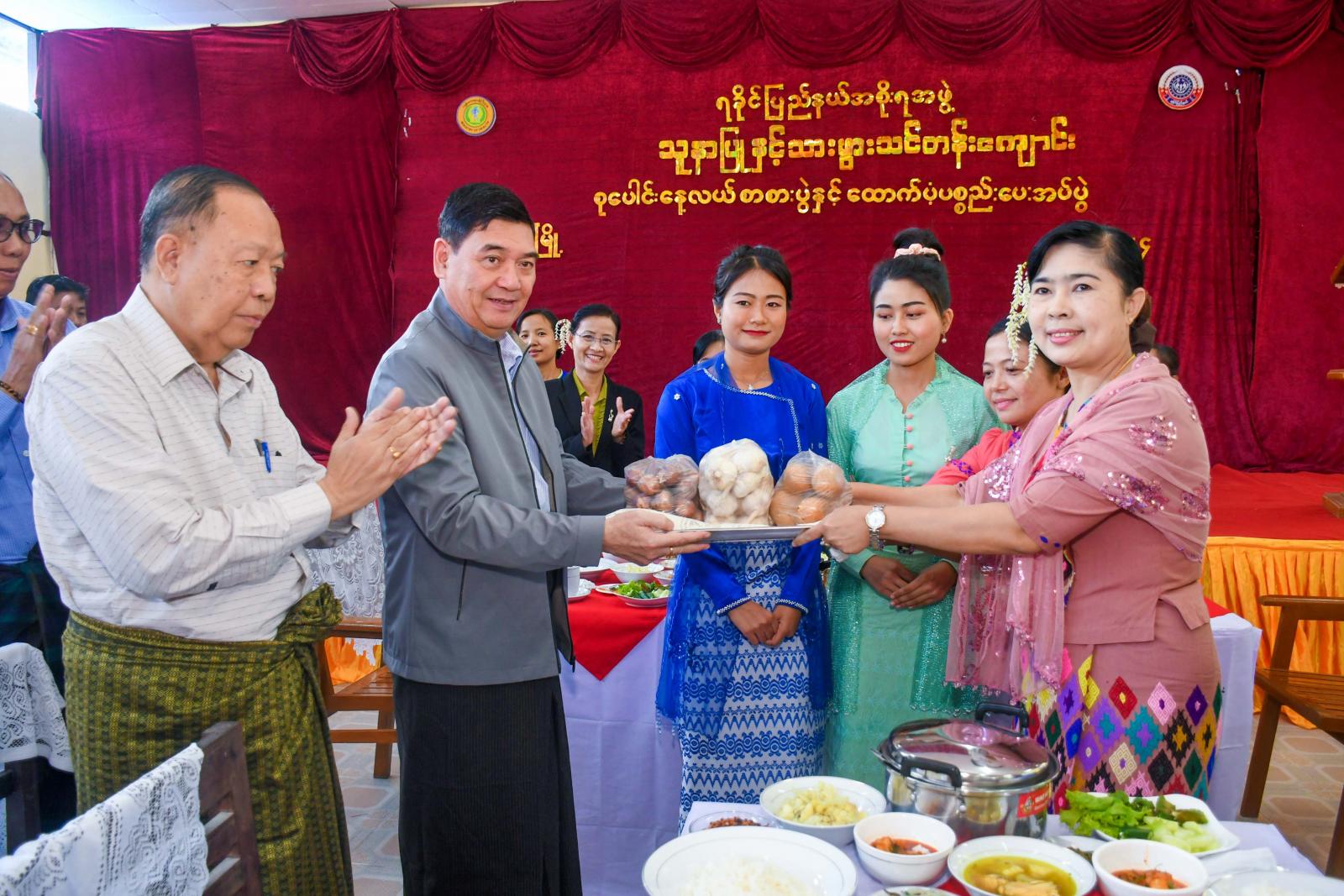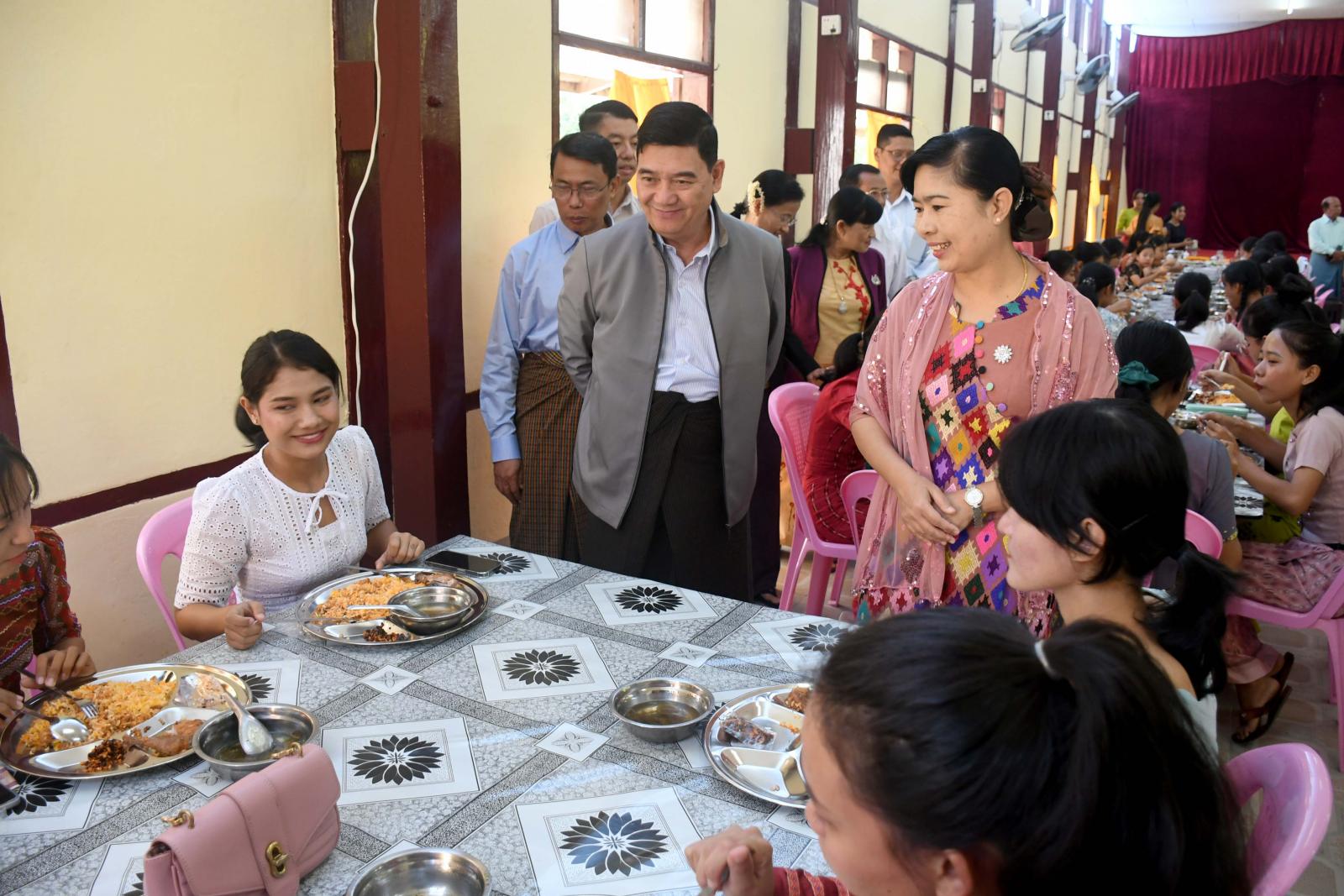 ဦးစွာ ရခိုင်ပြည်နယ်ဝန်ကြီးချုပ် ဦးထိန်လင်းနှင့်ဇနီး ပြည်နယ်အမျိုးသမီးရေးရာအဖွဲ့နာယက ဒေါ်ဆွေဆွေမြတ်တို့က ရခိုင်ပြည်နယ်အစိုးရအဖွဲ့မှ သူနာပြုနှင့်သားဖွားသင်တန်းကျောင်းသို့ပေးအပ်သည့် အခြေခံစားသုံးကုန်ပစ္စည်းများကို ထောက်ပံ့ပေးအပ်ကြသည်။ ဆက်လက်၍ပြည်နယ်ဝန်ကြီးချုပ်နှင့် ဇနီးတာဝန်ရှိသူများသည် ဆရာ၊ ဆရာမများ၊ ကျောင်းသား၊ ကျောင်းသူများ စုပေါင်းနေ့လယ်စာ စားသောက်နေမှုအား လှည့်လည်ကြည့်ရှုအားပေးကြပြီး ကျောင်းသား၊ ကျောင်းသူများနှင့်အတူ နေ့လယ်စာကို အတူတကွသုံးဆောင်ကြသည်။