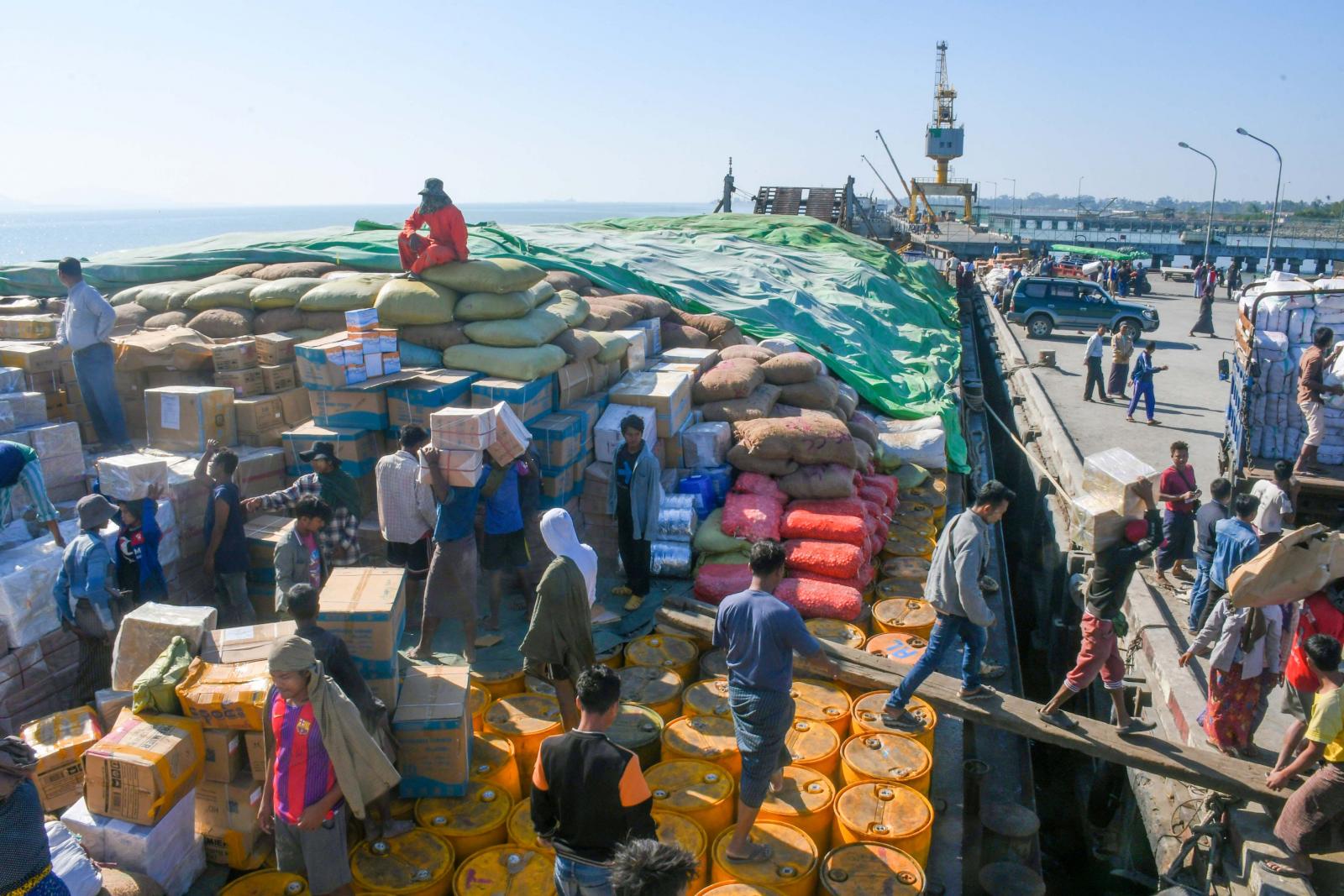 အဆိုပါပစ္စည်းများအား လူအင်အား၊ စက်ယန္တရားအင်အားများ အသုံးပြုကာ ကုန်တင်ကုန်ချ ပြုလုပ်နေမှုအားရခိုင်ပြည်နယ်ဝန်ကြီးချုပ် ဦးထိန်လင်းနှင့် တာဝန်ရှိသူများက သွားရောက်ကြည့်ရှုစစ်ဆေးကြပြီး ပြည်နယ်ဝန်ကြီးချုပ်က ရောက်ရှိလာသောကုန်ပစ္စည်းများအား စနစ်တကျ အတင်အချပြုလုပ်နိုင်ရေး၊ ကုန်ပစ္စည်းများ ပျက်စီးဆုံးရှုံးမှုမဖြစ်စေရေး၊ သိုလှောင်ထိန်းသိမ်း ရောင်းချခြင်းမပြုစေ ရေး၊ လိုအပ်မှုမရှိသော နေရာများသို့ မရောက်ရှိစေနိုင်ရေးနှင့် ဘေးအန္တရာယ်ကင်းရှင်းစွာ ဆောင်ရွက်နိုင်ရေးတို့ကိုမှာကြားပြီး လိုအပ်သည်များကို တာဝန်ရှိသူများနှင့် ပေါင်းစပ်ညှိနှိုင်းပေးခဲ့သည်။