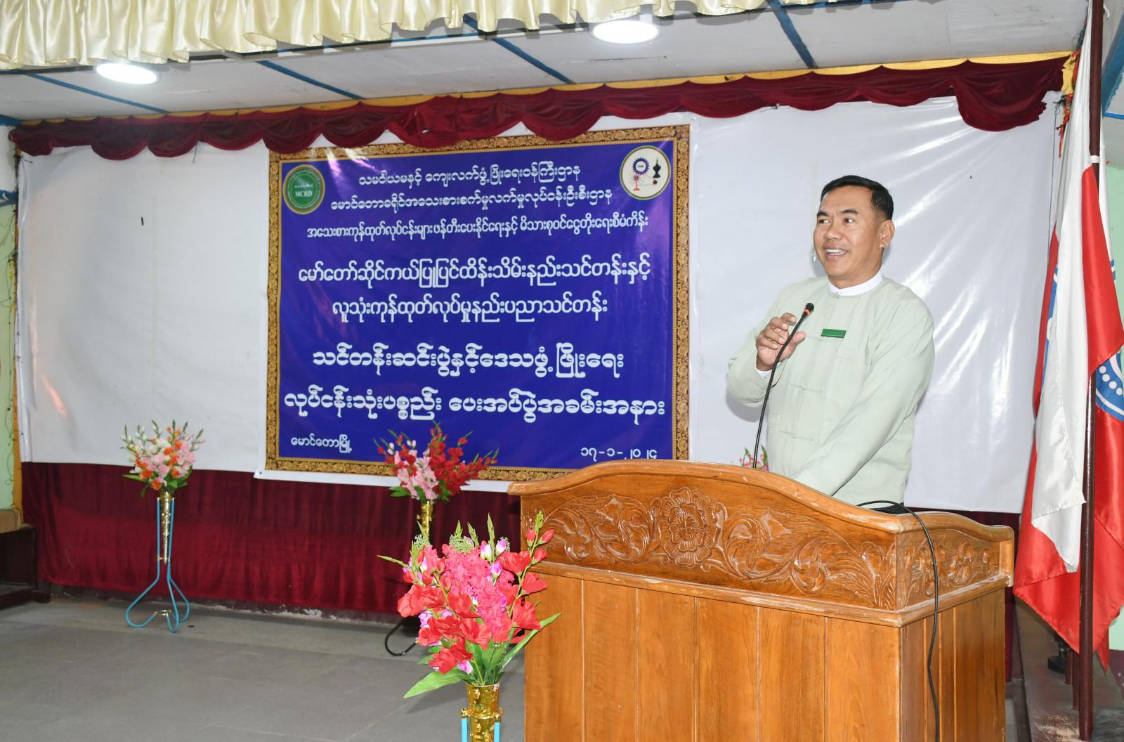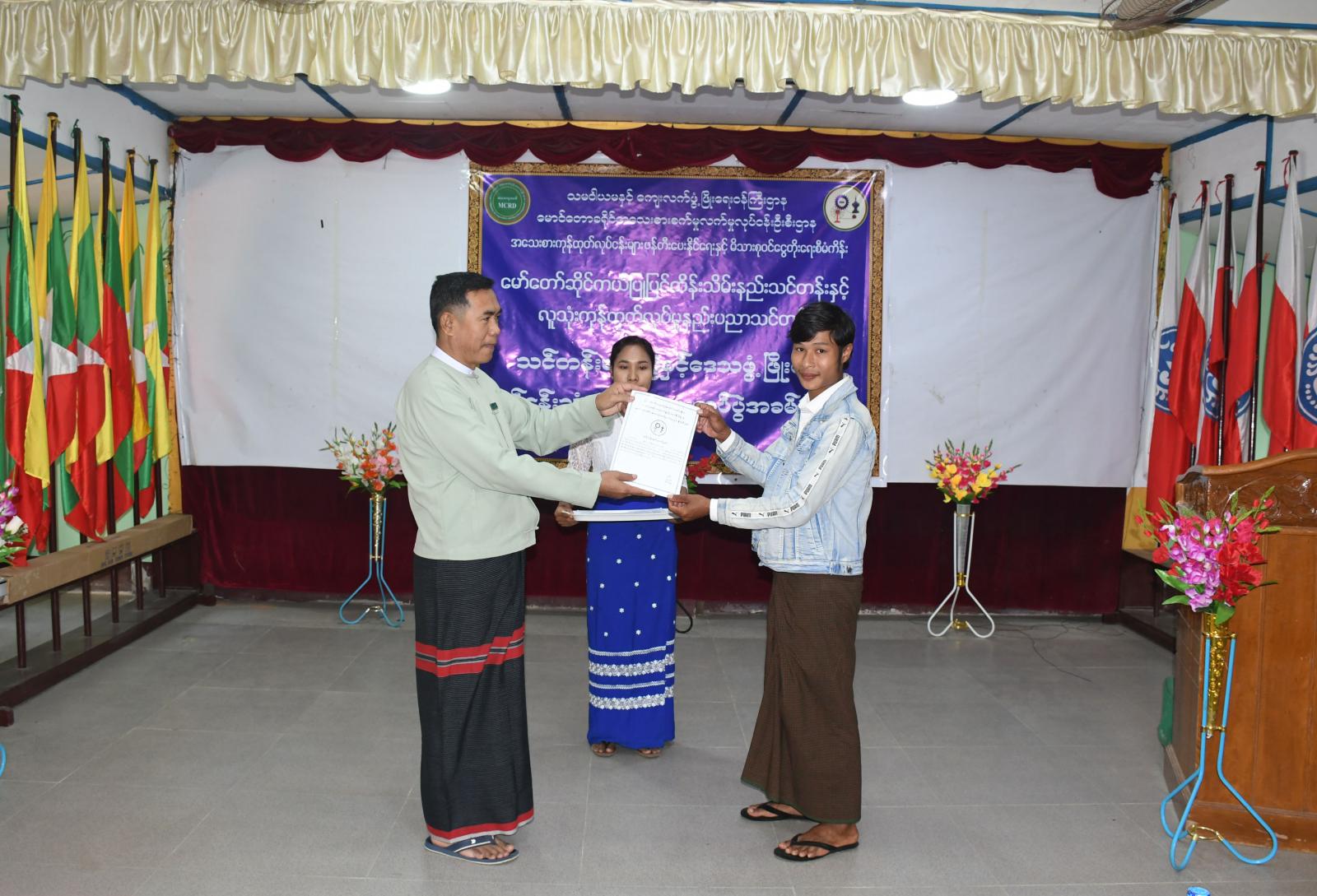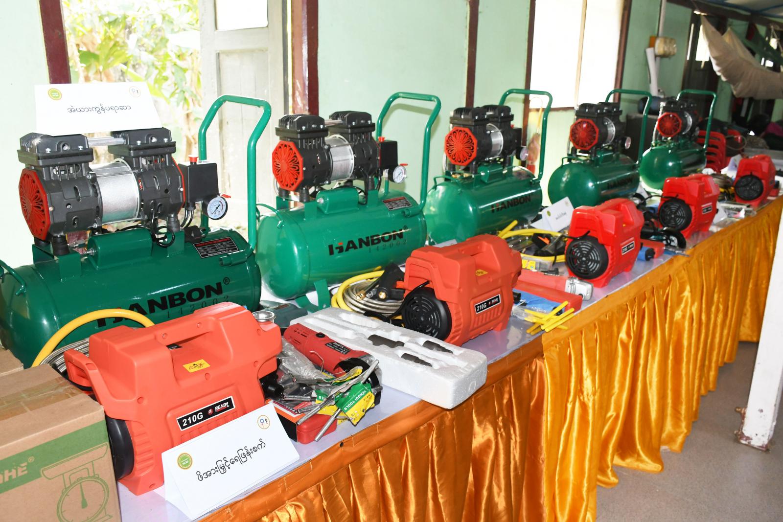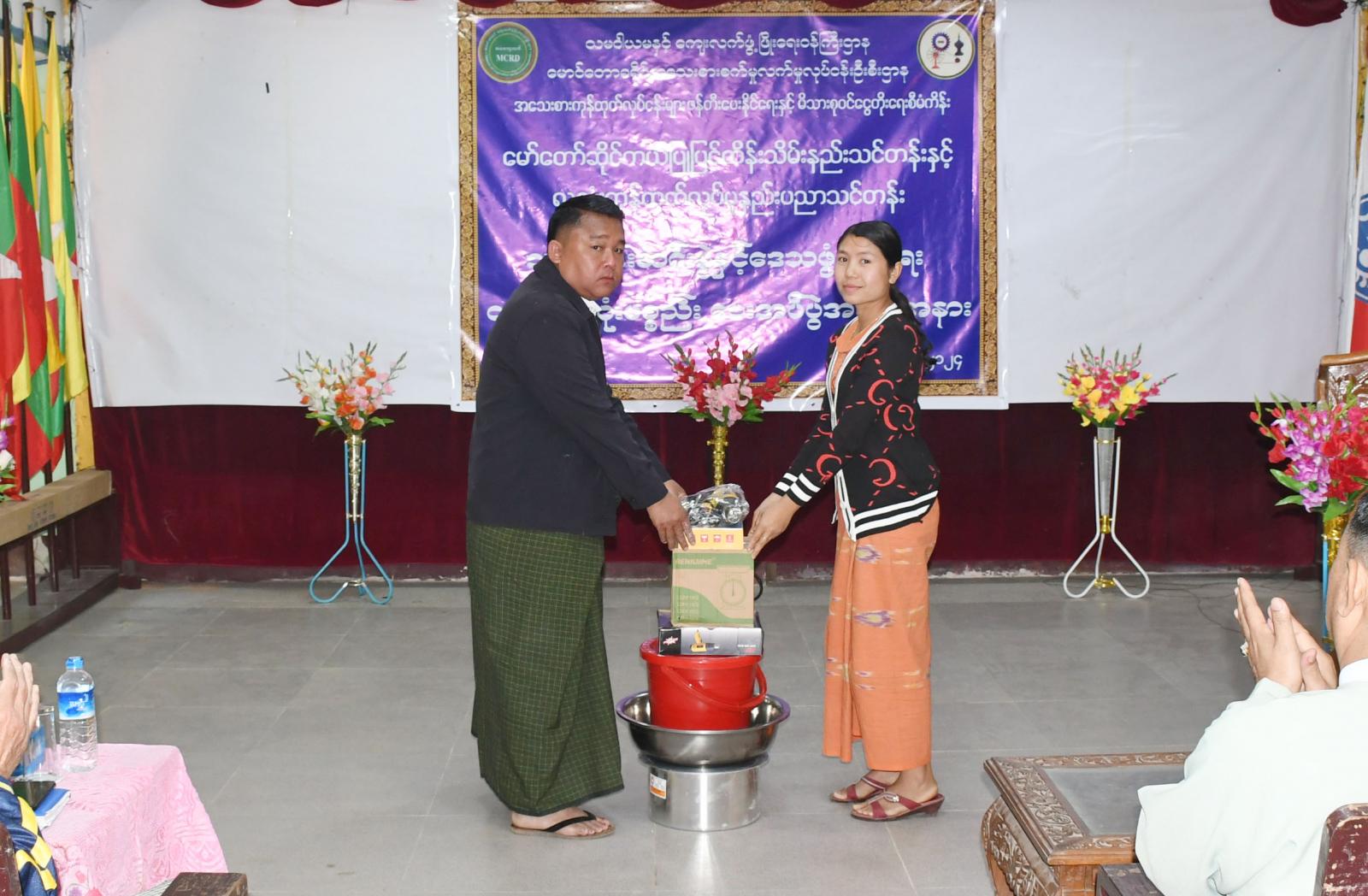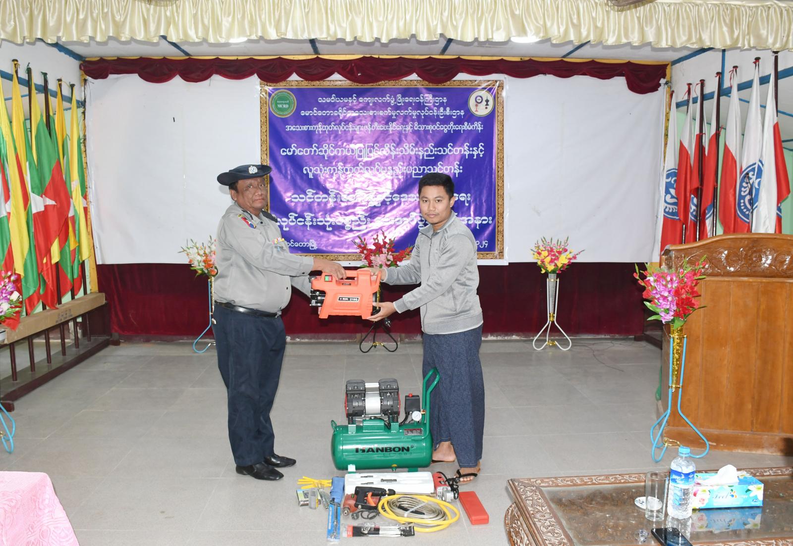 ရခိုင်ပြည်နယ်၊ မောင်တောခရိုင်၊ မောင်တောမြို့၌ သမဝါယမနှင့် ကျေးလက်ဖွံ့ဖြိုးရေးဝန်ကြီးဌာန၊ ခရိုင်အသေးစားစက်မှုလက်မှုလုပ်ငန်းဦးစီးဌာနမှ ၂၀၂၃-၂၀၂၄ ဘဏ္ဍာရေးနှစ် အသေးစားကုန်ထုတ် လုပ်ငန်းများ ဖန်တီးပေးနိုင်ရေးနှင့် ကျေးလက်နေ မိသားစုဝင်ငွေ တိုးတက်ရေးစီမံကိန်း အစီအစဉ်ဖြင့် အကောင်အထည်ဖော် ဆောင်ရွက်ခဲ့သည့် မော်တော် ဆိုင်ကယ် ပြုပြင်ထိန်းသိမ်းနည်းသင်တန်းနှင့် လူသုံးကုန်ထုတ်လုပ်မှု နည်းပညာသင်တန်းတွင် ထူးချွန်ခဲ့သူများအား ဒေသဖွံ့ဖြိုးရေးလုပ်ငန်းသုံးပစ္စည်းများ ပေးအပ်ခြင်းကို ယမန်နေ့ နံနက် ၁၁ နာရီအချိန် မြို့နယ်အထွေထွေအုပ်ချုပ်ရေးဦးစီးဌာန ရုံးအစည်းအဝေးခန်းမတွင် ကျင်းပပြုလုပ်ခဲ့သည်။
