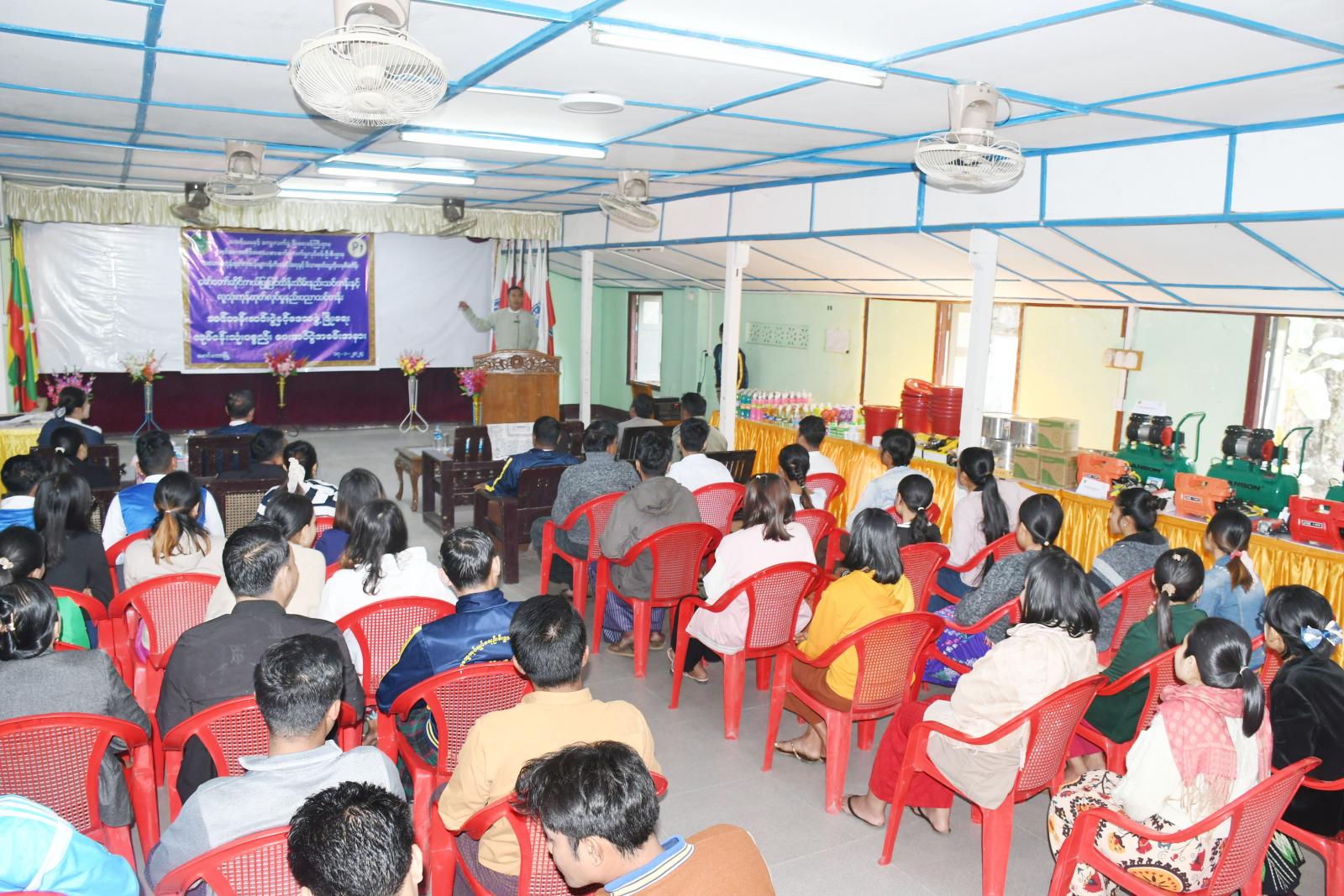 ရှေးဦးစွာ မြို့နယ်စီမံအုပ်ချုပ်ရေးအဖွဲ့ဥက္ကဋ္ဌ ဦးကံထွန်းအောင်က အမှာစကား ပြောကြားရာတွင် သင်တန်းသူ/သားများအနေဖြင့် အသက်မွေးဝမ်းကျောင်း အတတ်ပညာတစ်ခု တတ်မြောက်ခြင်းအားဖြင့် လူငယ်များ လမ်းမှားမရောက်စေဘဲ၊ ပညာရေးတစ်ပိုင်းတစ်စဖြင့် အနာဂါတ်ဘဝများ မပပျောက်စေရေးနှင့် အလုပ်အကိုင် အခွင့်အလမ်းများ ရရှိလာစေခြင်းကြောင့် မိသားစုတစ်ပိုင်တစ်နိုင် ဝင်ငွေတိုးပွားလာနိုင်မည့် ဖြစ်ကြောင်း စသည်တို့ကို မှာကြားခဲ့သည်။ ဆက်လက်၍ ခရိုင်အသေးစား စက်မှုလက်မှုလုပ်ငန်းဦးစီးဌာနမှ ခရိုင်ဦးစီးမှူး ဒေါ်ဥမ္မာထွန်းက မော်တော်ဆိုင်ကယ်ပြုပြင်ထိန်းသိမ်းနည်းသင်တန်းနှင့် လူသုံး ကုန်ထုတ်လုပ်မှု နည်းပညာသင်တန်းတွင် ထူးချွန်သူများအား ဒေသဖွံ့ဖြိုးရေးလုပ်ငန်းသုံး ပစ္စည်းများ ပေးအပ်ရခြင်းများနှင့် ပတ်သက်၍ ရှင်းလင်းပြောကြားခဲ့သည်။ ထို့နောက် မြို့နယ်စီမံအုပ်ချုပ်ရေးအဖွဲ့ဥက္ကဋ္ဌ ဦးကံထွန်းအောင်နှင့် အဖွဲ့၀င်များ၊ ခရိုင်အသေးစားစက်မှုလက်မှု လုပ် ငန်း ဦးစီးဌာနမှ ခရိုင်ဦးစီးမှူး ဒေါ်ဥမ္မာထွန်းနှင့် တာဝန်ရှိသူများက မော်တော်ဆိုင်ကယ်ပြုပြင် ထိန်းသိမ်းနည်းသင်တန်းနှင့် လူသုံးကုန်ထုတ်လုပ်မှု နည်းပညာသင်တန်းများတွင် ထူးချွန်ခဲ့သူများအား ဒေသဖွံ့ဖြိုးရေးလုပ်ငန်းသုံးပစ္စည်းများအား ထောက်ပံ့ပေးအပ်ခဲ့ကြပြီး တက်ရောက်လာကြသူများက ခင်းကျင်းပြသထားသော ထူးချွန်သင်တန်းသား/သူများအား ပေးအပ်မည့် ဒေသဖွံ့ဖြိုးရေးလုပ်ငန်းသုံးပစ္စည်းများအား လှည့်လည်ကြည့်ရှုအားပေးခဲ့ကြကြောင်း သိရသည်။