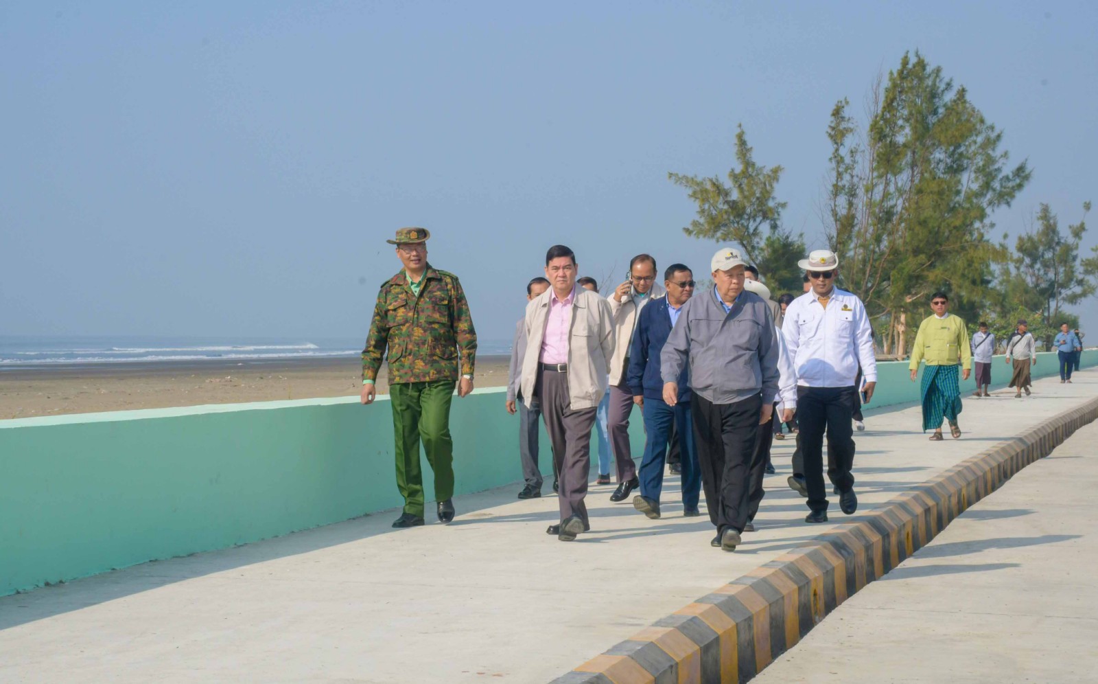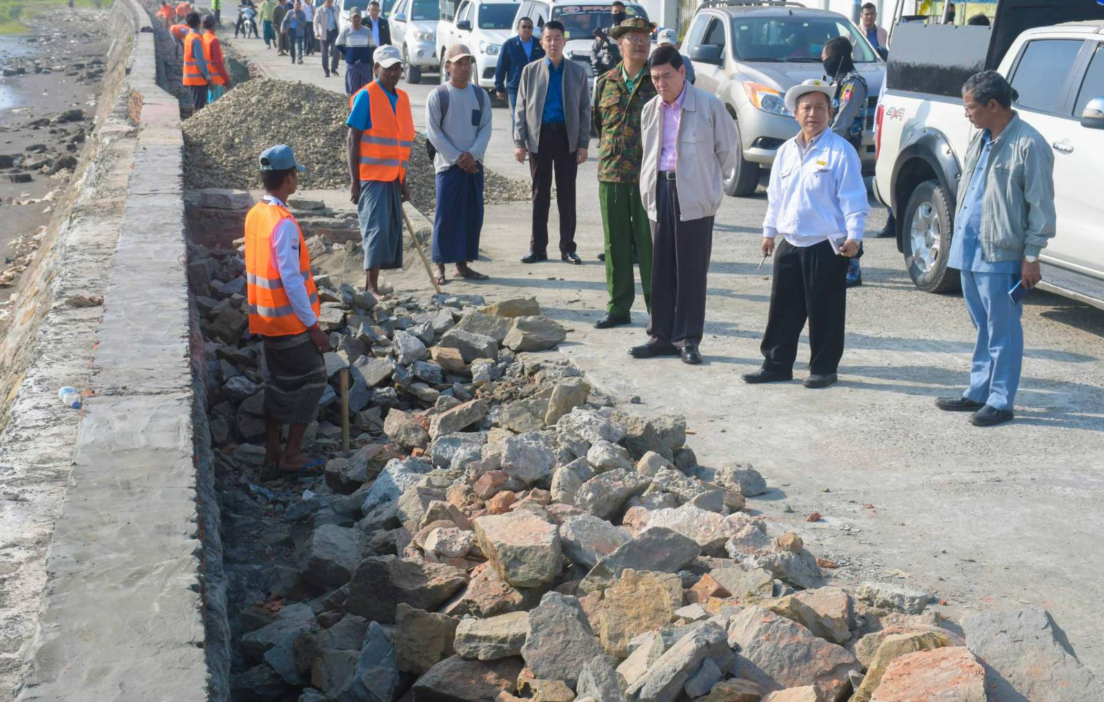 ထို့နောက် ပြည်နယ်ဝန်ကြီးချုပ်နှင့်အဖွဲ့သည် ပွိုင့်မှ စစ်တွေဟိုတယ်လမ်းဆုံအတွင်း ရေတားနံရံတည်ဆောက်ခြင်း၊ ကွန်ကရစ်လမ်းတိုးချဲ့တည်ဆောက်ခြင်း၊ ပျက်စီးသွားသောကွန်ကရစ်လမ်းအား ပြန်လည်ခင်းပေးခြင်းနှင့် ပလက်ဖောင်တည်ဆောက်ခြင်းလုပ်ငန်းများ ဆောင်ရွက်ပြီးစီးမှုတို့ကို လှည့်လည်ကြည့်ရှုစစ်ဆေးကြသည်။ ဆက်လက်၍ ပြည်နယ်ဝန်ကြီးချုပ်နှင့်အဖွဲ့သည် ရှုခင်းသာ လမ်း စာတိုက်လမ်းဆုံမှ ပွိုင့်အတွင်း ပျက်စီးသွားသော လမ်းများအား ပြန်လည်ပြုပြင်နေမှုတို့ကို လှည့်လည် ကြည့်ရှုစစ်ဆေးကြပြီး လိုအပ်သည်များကို တာဝန်ရှိသူများအား မှာကြားခဲ့သည်။