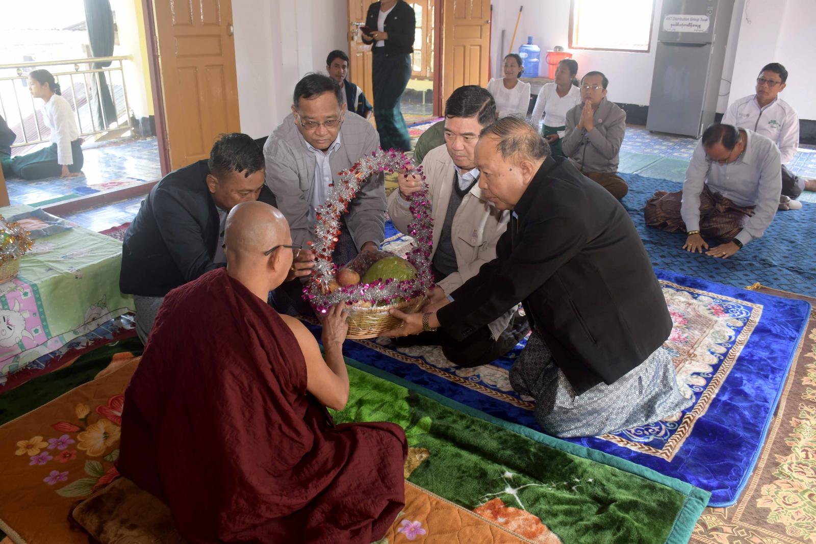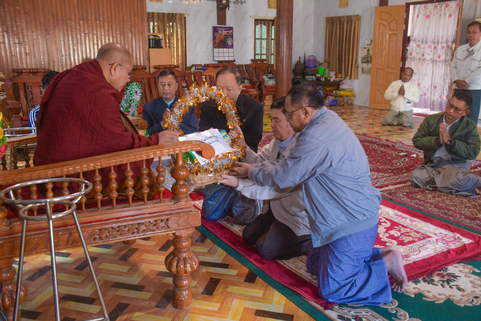 ရခိုင်ပြည်နယ်ဝန်ကြီးချုပ်ဦးထိန်လင်းသည် ပြည်နယ်အစိုးရအဖွဲ့ဝင်များ၊ ဌာနဆိုင်ရာတာဝန်ရှိသူများနှင့်အတူ ယနေ့နံနက်ပိုင်းက စစ်တွေမြို့ပေါ်ရှိ ဆရာတော်ကြီးများအား သွားရောက်ဖူးမြော်ပြီး လှူဖွယ်ဝတ္ထုများ ဆက်ကပ်လှူဒါန်းကြသည်။