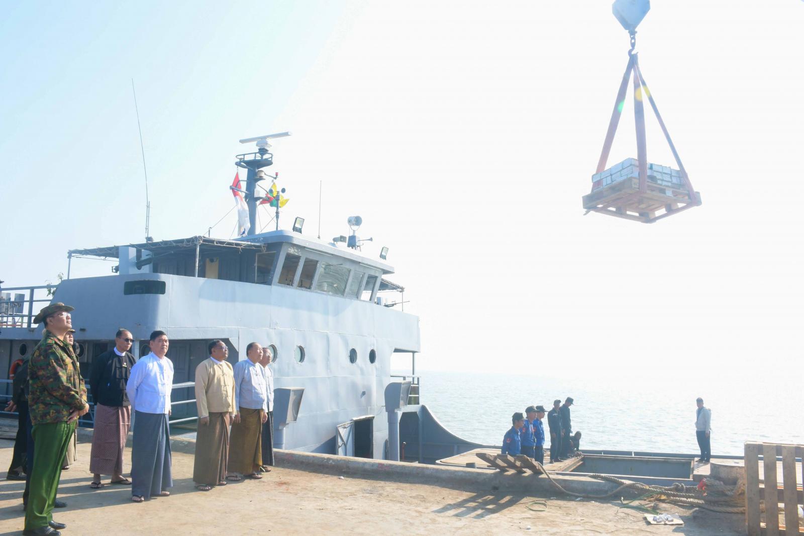 ထို့နောက် ပြည်နယ်ဝန်ကြီးချုပ်နှင့်အဖွဲ့သည် မြန်မာ့ဆိပ်ကမ်းအာဏာပိုင် ဖောင်တော်ကြီးဆိပ်ကမ်းသို့ သွားရောက်ပြီး အမ်ဗွီ-ရဲမာန်အောင်သင်္ဘောပေါ်မှ နေပူခံကျောက်ပြားများကို လူအင်အား၊ စက်ယန္တရားအင်အားများ အသုံးပြုကာ အတင်အချပြုလုပ်နေမှုကိုကြည့်ရှုစစ်ဆေးကြပြီး လိုအပ်သည်များကို တာဝန်ရှိသူများအား မှာကြားခဲ့သည်။
