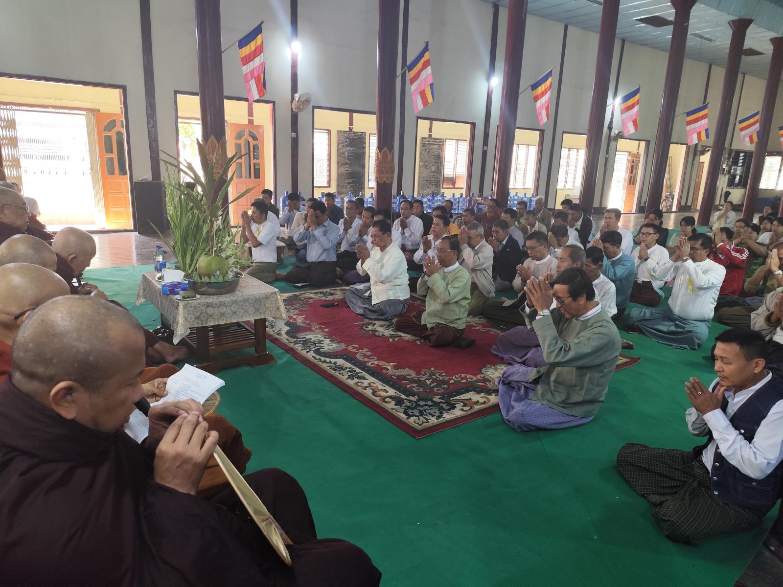 ရှေးဦးစွာ အခမ်းအနားကို နမောတဿ(၃)ကြိမ်ရွတ်ဆိုဘုရားကန်တော့၍ ဖွင့်လှစ်ပြီးနောက် နိုင်ငံတော်ဩဝါဒစရိယ အဘိဓဇ အဂ္ဂမဟာသဒ္ဓမ္မဇောတိက ဘဒ္ဒန္တ သူရိယဓဇ အရှင်သူမြတ်ထံမှ ငါးပါးသီလခံယူတည်ဆောက်သည်။