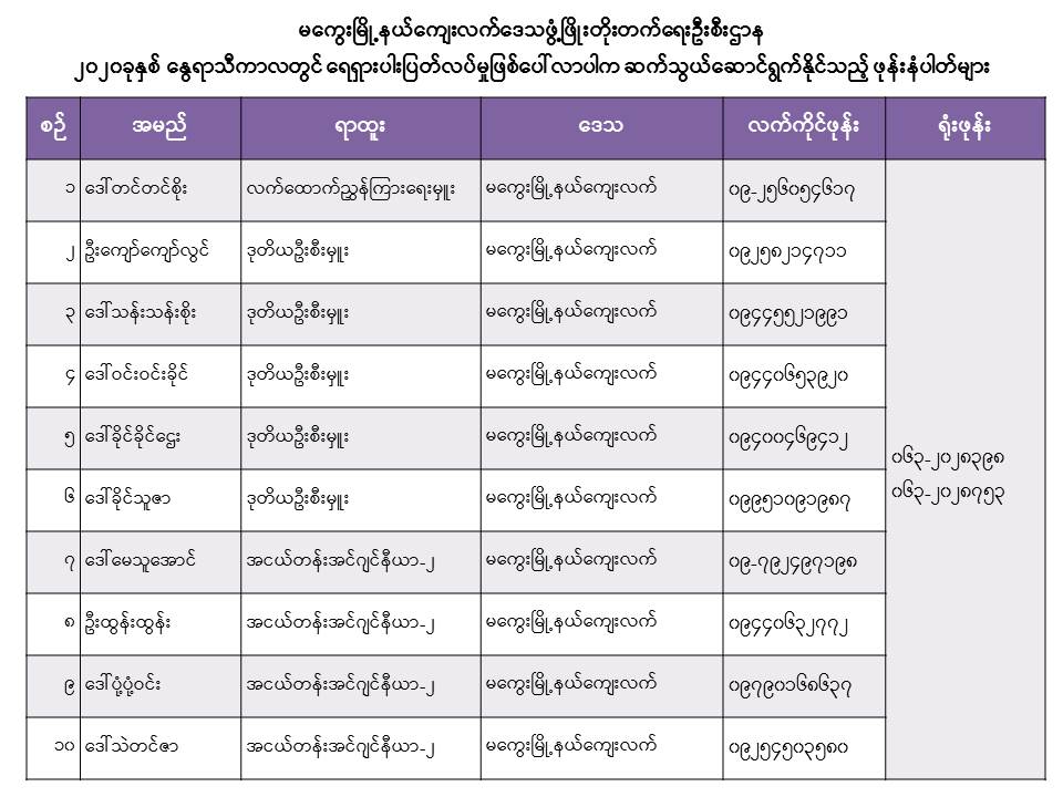 မကွေးတိုင်းဒေသကြီး၊ မကွေးမြို့နယ်အတွင်းရှိ ကျေးရွာများ နွေရာသီကာလ သောက်သုံးရေ ရှားပါး ပြတ်လပ်မှုများ ဖြစ်ပေါ်ပါက မကွေးမြို့နယ် ကျေးလက်ဒေသဖွံ့ဖြိုးတိုးတက်ရေးဦးစီးဌာနသို့ လူကိုယ်တိုင်ဖြစ်စေ၊ ဖော်ပြပါဖုန်းနံပါတ်များသို့ ဖြစ်စေ ဆက်သွယ်အကြောင်းကြား၍ အကူအညီ တောင်းခံနိုင်ကြောင်း အဆိုပါဦးစီးဌာန တာဝန်ရှိသူထံမှ သိရသည်။