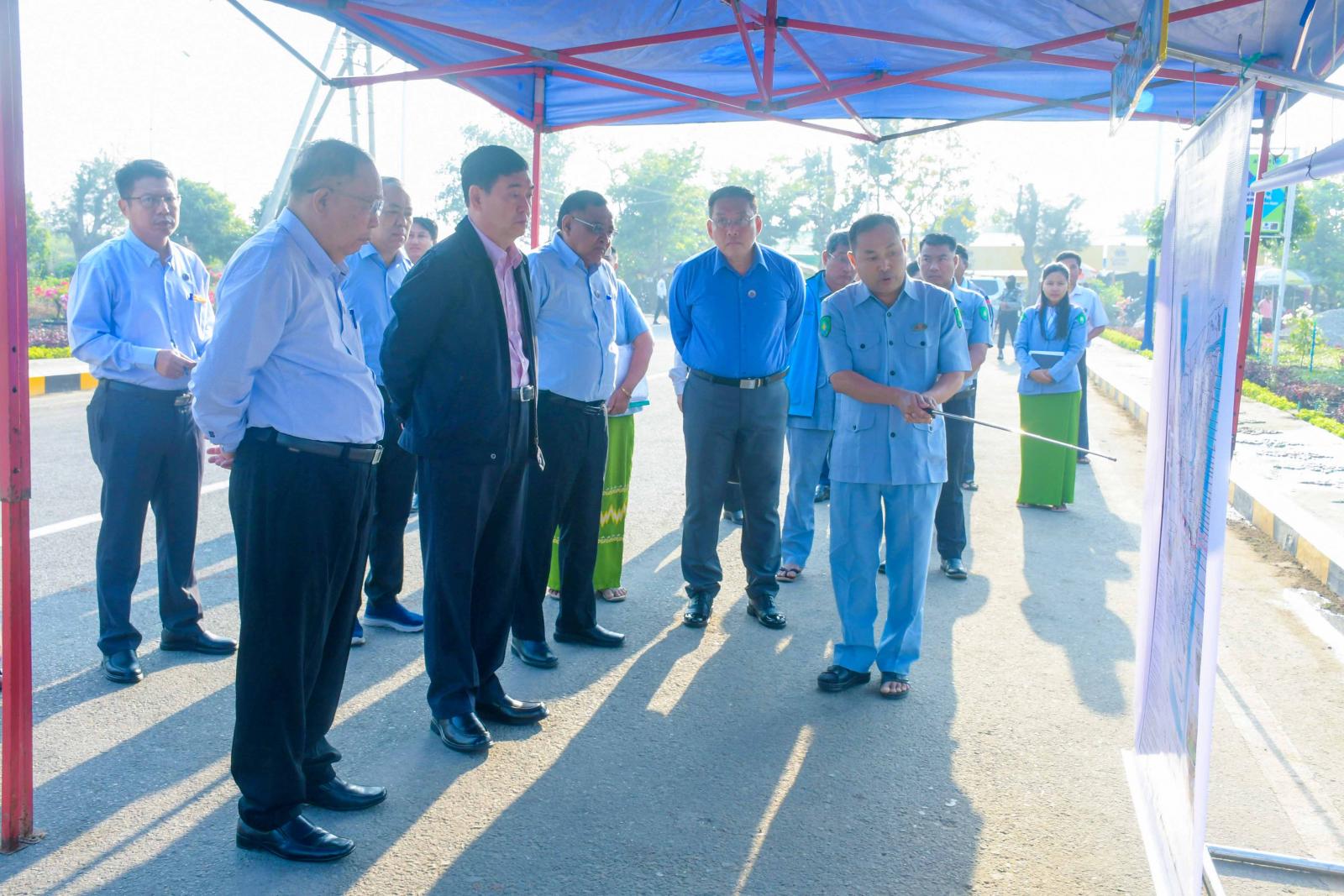 ဦးစွာ ပြည်နယ်ဝန်ကြီးချုပ်နှင့်အဖွဲ့သည် စစ်တွေလေဆိပ်အထွက်လမ်းဘေးဝဲယာရှိလုပ်ငန်းများ ဆောင်ရွက်နေမှုကို သွားရောက်ကြည့်ရှုစစ်ဆေးကြရာ ရှင်းလင်းဆောင်၌ ပြည်နယ်စည်ပင်သာယာရေးအဖွဲ့ ညွှန်ကြား ရေးမှူး ဦးကျော်မိုးက ပတ်ဝန်းကျင်စိမ်းလန်းစိုပြည်ရေးနှင့် မြေယာရှုခင်းများ ဆောင်ရွက်ပြီးစီးနေမှု၊ ပန်းအလှပင်များ စိုက်ပျိုးနေမှုတို့ကို ရှင်းလင်းတင်ပြသည်။ တင်ပြချက်များအပေါ် ပြည်နယ်အစိုးရအဖွဲ့ဝင်များက ဖြည့်စွက်အကြံပြုဆွေးနွေး တင်ပြကြပြီး ပြည်နယ်ဝန်ကြီးချုပ်ကလိုအပ်သည်များကို မှာကြားခဲ့သည်။ ဆက်လက်၍ ပြည်နယ်ဝန်ကြီးချုပ်နှင့်အဖွဲ့သည် လေဆိပ်အထွက် လမ်းဘေးဝဲယာရှိ မြေယာရှုခင်းများ ဆောင်ရွက်နေမှုနှင့် လျှပ်စစ်မီးတိုင်များစိုက်ထူထားရှိမှုတို့ကို လှည့်လည်ကြည့်ရှုစစ်ဆေးကြကာ လိုအပ်သည်များကို တာဝန်ရှိသူများအားမှာကြားခဲ့သည်။