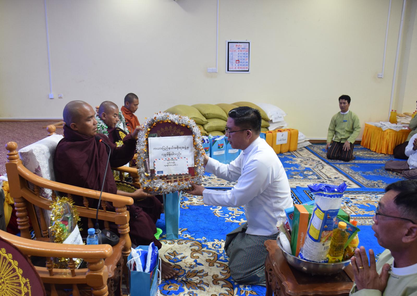 ကယားပြည်နယ်၊ လွိုင်ကော်မြို့ပေါ်ရှိ ဘုန်းတော်ကြီးကျောင်းတိုက်များနှင့် သီလရှင်ကျောင်းတိုက်များသို့ ဆန် ၊ ဆီ ၊ ဆား၊ ပဲစသောလှူဖွယ်ဝတ္တုများ ဆက်ကပ်လှူဒါန်းခြင်းအခမ်းအနားကို ယနေ့နံနက်(၁၀:၀၀)နာရီအချိန်တွင် ကယားပြည်နယ်အစိုးရအဖွဲ့ရုံး၌ ကျင်းပပြုလုပ်ရာ ပင့်ဖိတ်ထားသော သံဃာတော်များ၊ ကယားပြည်နယ်ဝန်ကြီးချုပ် ဦးဇော်မျိုးတင်၊ ပြည်နယ်အစိုးရအဖွဲ့ဝင်များ ၊ ဌာနဆိုင်ရာများနှင့် ဖိတ်ကြားထားသော ဧည့်သည်တော်များ တက်ရောက်ခဲ့ကြသည်။