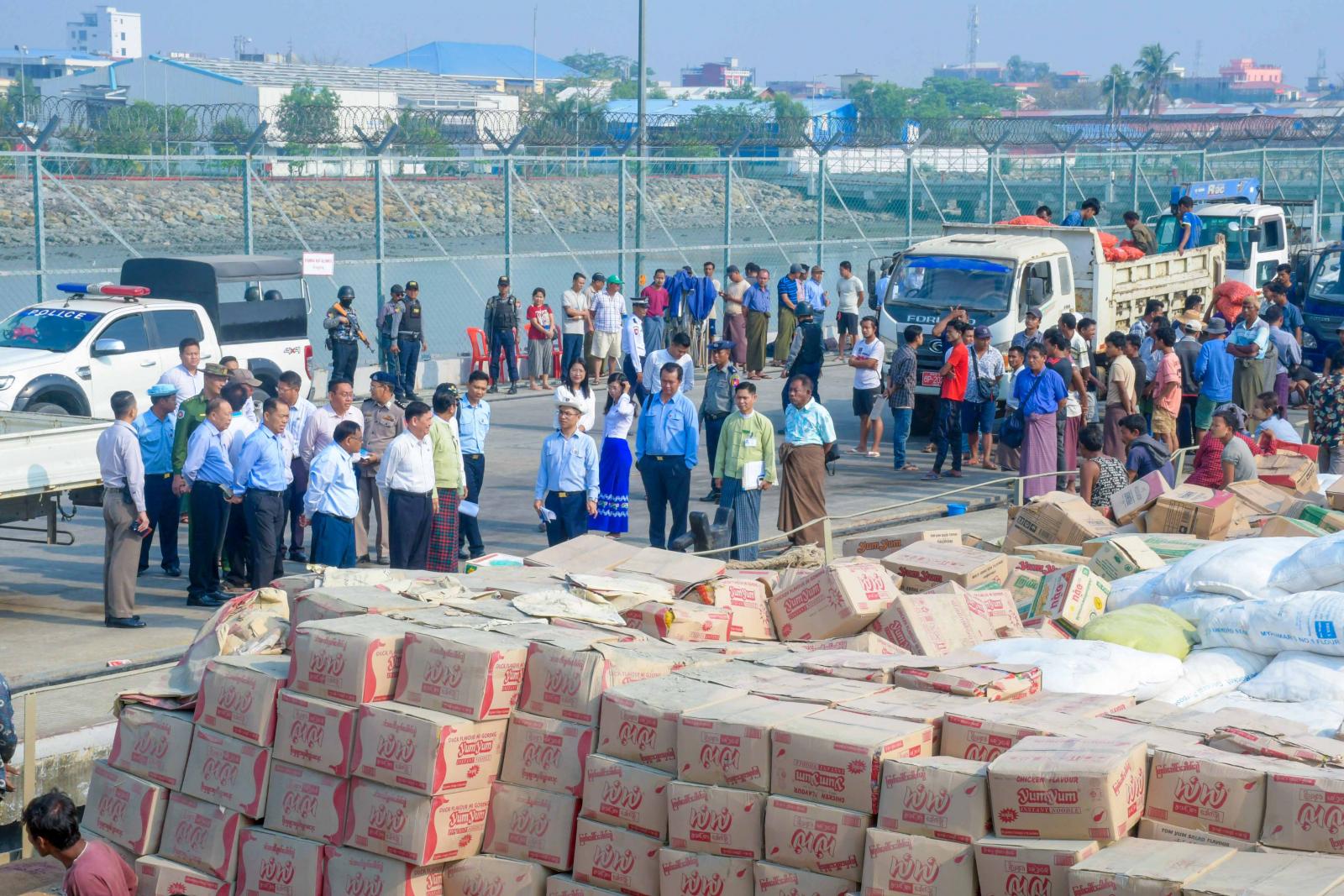အမျိုးသားသဘာဝဘေးအန္တရာယ်ဆိုင်ရာ စီမံခန့်ခွဲမှုကော်မတီ၏ လမ်းညွှန်မှုအရ ပို့ဆောင်ဆက်သွယ်ရေး လုပ်ငန်းကော်မတီ၏ စီစဉ်ကြီးကြပ်မှုဖြင့် ရခိုင်ပြည်နယ်သို့ ပြန်လည်ထူထောင်ရေးပစ္စည်းများကို ပို့ဆောင်ပေးလျက်ရှိရာ MV SUN SHINE သင်္ဘောဖြင့် စစ်တွေမြို့ဘက်စုံသုံးဆိပ်ကမ်းတွင် ရန်ကုန်မြို့မှ လူသုံးကုန်ပစ္စည်းနှင့် တည်ဆောက်ရေးပစ္စည်းများ ရောက်ရှိလာမှု ရခိုင်ပြည်နယ်ဝန်ကြီးချုပ် ဦးထိန်လင်း၊ ပြည်နယ်အစိုးရအဖွဲ့ဝင်များ၊ ဌာနဆိုင်ရာတာဝန်ရှိသူများသည် ယနေ့နံနက်ပိုင်းက ကြည့်ရှုစစ်ဆေးကြသည်။