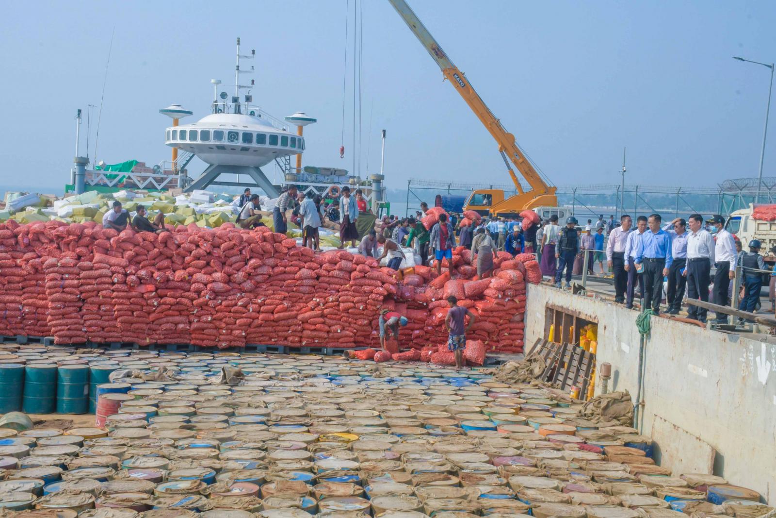 ထိုသို့ သွားရောက်ကြည့်ရှုစဉ် ပြည်နယ်ဝန်ကြီးချုပ်က ရောက်ရှိလာသောကုန်ပစ္စည်းများအား စနစ်တကျအတင်အချ ပြုလုပ်နိုင်ရေး၊ ကုန်ပစ္စည်းများပျက်စီးဆုံးရှုံးမှုမဖြစ်စေရေး၊ သိုလှောင်ထိန်းသိမ်း ရောင်းချခြင်း မပြုစေရေး၊ လိုအပ်မှုမရှိသော နေရာများသို့ မရောက်ရှိစေနိုင်ရေးနှင့် ဘေးအန္တရာယ် ကင်းရှင်းစွာ ဆောင်ရွက်နိုင်ရေးတို့ကိုမှာကြားပြီး လိုအပ်သည်များကို တာဝန်ရှိသူများနှင့် ပေါင်းစပ်ညှိနှိုင်းပေးခဲ့သည်။