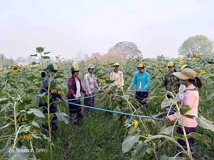 "ယနေ့ခေတ် လယ်ယာကဏ္ဍသီးနှံစိုက်ပျိုးထုတ်လုပ်ရာတွင် ဓါတုဓါတ်မြေဩဇာများကို အလွန်အကျွံ သုံးစွဲခြင်းကြောင့် မြေဆီလွှာပျက်စီးခြင်း၊ သဘာဝပတ်ဝန်းကျင်ထိခိုက်ပျက်စီးခြင်း၊ ဓါတု ဓါတ်ကြွင်းကျန်ခြင်းနှင့် အခြားသောဘေးထွက်ဆိုးကျိုးများကို နောက်ဆက်တွဲအနေဖြင့် ခံစားကြရပြီး ၎င်းပြဿနာများကို ကုစားဖြေရှင်းပေးနိုင်သည့် နည်းလမ်းကောင်းတစ်ခု အနေဖြင့် သဘာဝမြေဩဇာအသုံးပြု တောင်သူအသိ ပညာပေးစံပြစိုက်ခင်း ဆောင်ရွက်ခြင်းဖြစ်ကြောင်း၊ နေကြာရိတ်သိမ်းပြီးပါက သဘာဝမြေဩဇာအသုံးပြု၍ နှမ်းနက်ဆင်းရတနာ-၃ မျိုးများကို ဆက်လက်စိုက်ပျိုး၍ သီးထပ်သီးညှပ်စိုက်ပျိုးမှု တောင်သူအသိပညာပေး ကွင်းသရုပ်ပြပွဲ ပြုလုပ် ပေးသွားမည်ဖြစ်ကြောင်း" မြို့နယ်စိုက်ပျိုးရေးဦးစီးမှူး ဦးမြင့်လင်းကပြောသည်။
