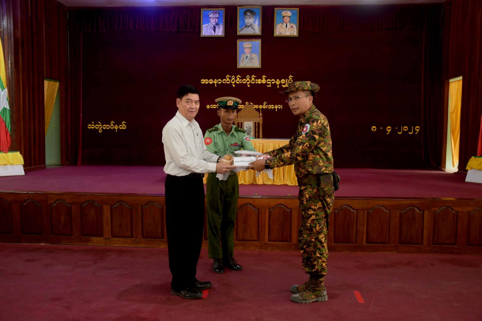 ဆက်လက်၍ ပြည်နယ်ဝန်ကြီးချုပ်နှင့်အဖွဲ့သည် နယ်မြေခံတပ်ရင်းခန်းမ၌ သံတွဲတပ်နယ်မှ တပ်မိသားစုဝင်များအား ထောက်ပံ့ငွေနှင့်ပစ္စည်းများပေးအပ်ပွဲသို့ တက်ရောက်ကြသည်။