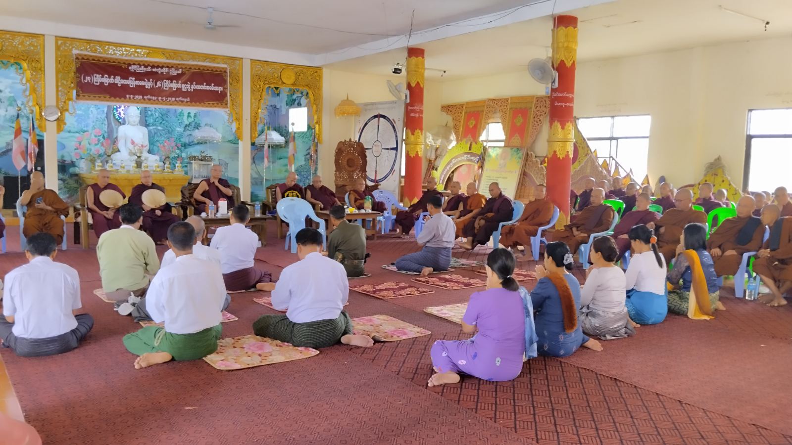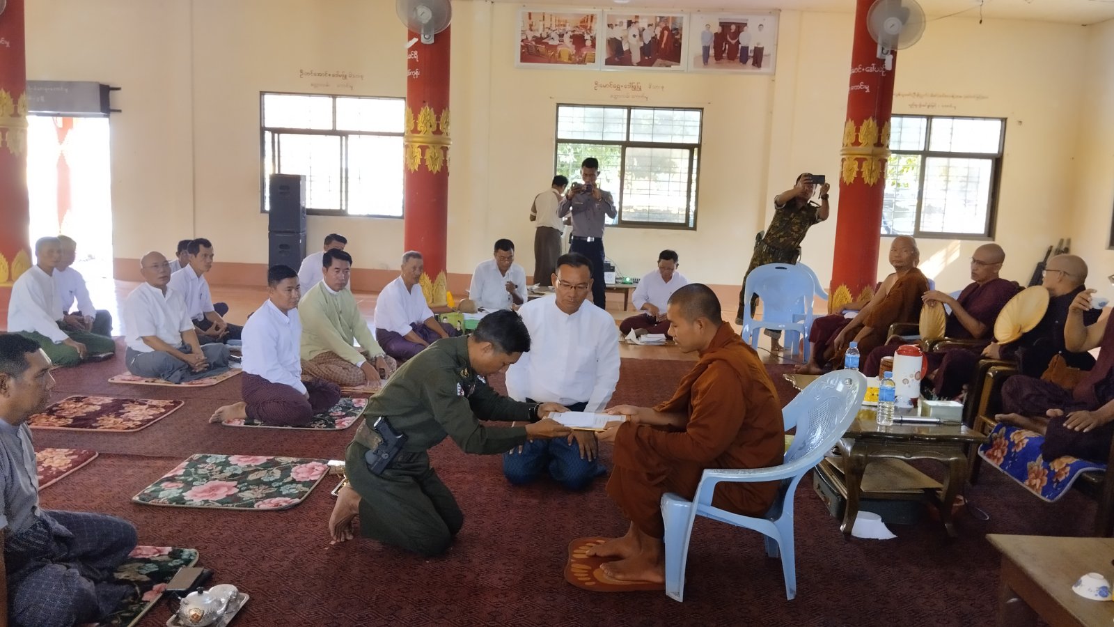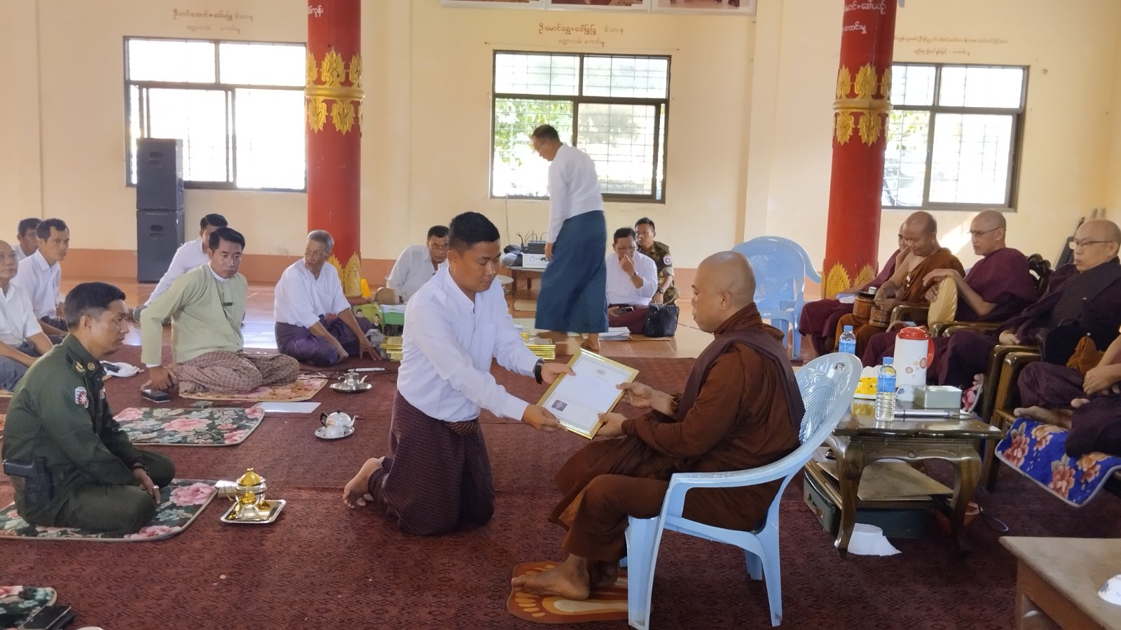 ဆက်လက်၍ ဒုတိယမြို့နယ်အုပ်ချုပ်ရေးမှူး ဦးကျော်လင်းက သာသနာတော်ဆိုင်ရာ ကိစ္စရပ်များအား လျှောက်ထားခဲ့ပြီး အစိုးရပါဠိပထမပြန်စာမေးပွဲ စာအောင်သံဃာတော်(၃၁)ပါးအား နည်းဗျူဟာမှူး၊ ယာယီဗိုလ်မှူးကြီးစောနောင်၊ မြို့နယ်စီမံအုပ်ချုပ်ရေးအဖွဲ့ဝင်များ၊ မြို့နယ်အထွေထွေအုပ်ချုပ်ရေးဦးစီးဌာနမှ ဒုတိယမြို့နယ်အုပ်ချုပ်ရေးမှူးနှင့် မြို့နယ်ဌာနဆိုင်ရာအကြီးအကဲများ၊ ဆွမ်းကွမ်းဆက်ကပ်ရေးကော်မတီဥက္ကဋ္ဌနှင့် အလှူရှင်များက စာအောင်ဆုဂုဏ်ပြုလွှာများနှင့် လှူဖွယ်ဝတ္ထုငွေများ ဆက်ကပ်လှူဒါန်းပေးခဲ့ကြပြီး၊ လှူဒါန်းမှုအစုစုတို့အတွက် ရေစက်သွန်းချအမျှပေးဝေကာ အခမ်းအနားကို ဗုဒ္ဓသာသနံစိရံတိဋ္ဌတု သုံးကြိမ်ရွတ်ဆို ရုပ်သိမ်းခဲ့ကြောင်း သိရသည်။