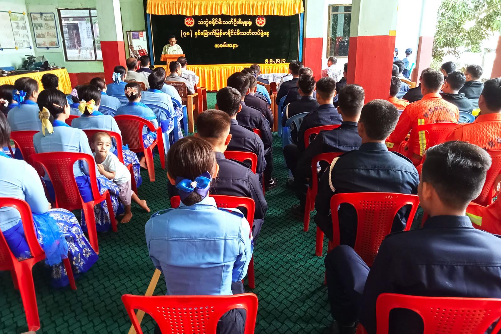 အခမ်းအနားတွင် ခရိုင်စီမံအုပ်ချုပ်ရေးအဖွဲ့ဥက္ကဋ္ဌဦးမျိုးချစ်က (၇၈)နှစ်မြောက် မြန်မာနိုင်ငံမီးသတ်တပ်ဖွဲ့နေ့အထိမ်းအမှတ်မိန့်ခွန်းကို ဖတ်ကြားခဲ့သည်။ ထို့နောက်ခရိုင်စီမံအုပ်ချုပ်ရေးအဖွဲ့ဥက္ကဋ္ဌနှင့် တာဝန်ရှိသူများသည် အရေးပေါ်မီးငြှိမ်းသတ်ရေးနည်းစနစ်များ သရုပ်ပြခြင်းနှင့် ခင်းကျင်းပြသထားသည့် မီးငြှိမ်းသတ်ပစ္စည်း ကိရိယာများနှင့် ရှာဖွေကယ်ဆယ်ရေးသုံးမီးငြှိမ်းသတ်ပစ္စည်း ကိရိယာများကို လှည့်လည်ကြည့်ရှု အားပေးခဲ့ကြကြောင်း သိရသည်။