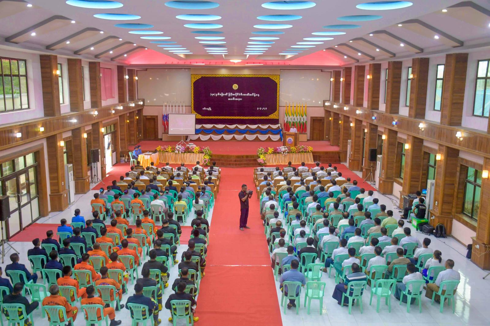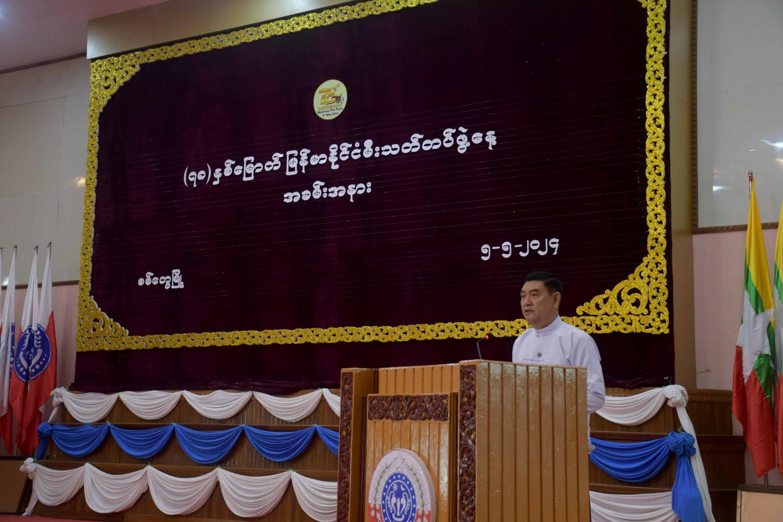 (၇၈)နှစ်မြောက် မြန်မာနိုင်ငံမီးသတ်တပ်ဖွဲ့နေ့ အခမ်းအနားကို ယနေ့နံနက်ပိုင်းက ရခိုင်ပြည်နယ်၊ စစ်တွေမြို့၊ ခိုင်သဇင်ခန်းမ၌ကျင်းပရာ ရခိုင်ပြည်နယ်ဝန်ကြီးချုပ်ဦးထိန်လင်း၊ ပြည်နယ်အစိုးရအဖွဲ့ဝင်များ၊ စစ်တွေတပ်နယ်မှ တပ်မတော်အရာရှိကြီးများ၊ ဌာနဆိုင်ရာဝန်ထမ်းများ၊ မီးသတ်တပ်ဖွဲ့ဝင်များ၊ မြို့မိမြို့ဖများ၊ လူမှုရေးအသင်းအဖွဲ့များနှင့် ဖိတ်ကြားထားသူများ တက်ရောက်ကြသည်။