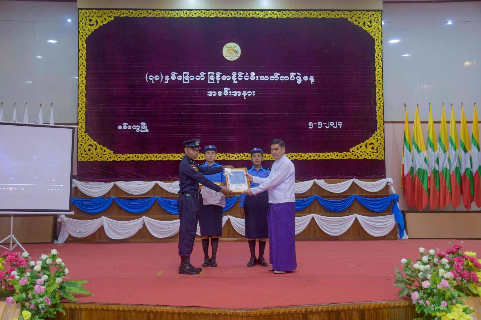အခမ်းအနားတွင် ပြည်နယ်ဝန်ကြီးချုပ် ဦးထိန်လင်းက မီးသတ်တပ်ဖွဲ့သည် ပြည်ထဲရေးဝန်ကြီးဌာန၏ ဦးဆောင်လမ်းညွှန်မှုများနှင့်အညီ မီးဘေးလုံခြုံရေး၊ သဘာဝဘေးအန္တရာယ်ကာကွယ်ရေး၊ ရှာဖွေကယ်ဆယ်ရေးနှင့် ပြည်သူ့အကျိုးပြုဆောင်ရွက်ရေးစသည့် ရည်မှန်းချက်တာဝန်(၄)ရပ်ချမှတ် ဆောင်ရွက်လျက်ရှိကြောင်း၊ ရခိုင်ပြည်နယ်တွင် နှစ်စဉ်မီးလောင်မှုများ ဖြစ်ပွားလျက်ရှိရာ ၂၀၁၄ ခုနှစ်မှ ၂၀၂၃ ခုနှစ်အထိ (၁၀)နှစ်တာကာလအတွင်း မီးလောင်မှုအကြိမ်ပေါင်း(၈၈၉) ခန့်ဖြစ်ပွားခဲ့ပြီး ပြည်နယ်တစ်ခုလုံး ပျမ်းမျှအားဖြင့် တစ်နှစ်အတွင်းအကြိမ်ရေ (၈၈) ကြိမ်ခန့်ဖြစ်ပွားခဲ့ပြီး ဆုံးရှုံးမှုအနေဖြင့် နှစ်စဉ်(၄၀၉) သန်းခန့်ဆုံးရှုံးနေသည်ကိုတွေ့ရကြောင်း၊ ပြည်သူများအနေဖြင့်လည်း မီးဘေးအန္တရာယ်ကကင်းဝေးအောင် အသိ၊ သတိနှင့်မပေါ့မဆကြရန် ကြိုတင်ကာကွယ်မှုများနှင့် ပူးပေါင်းဆောင်ရွက်သွားကြရန် တိုက်တွန်းမှာကြား လိုကြောင်း၊ စိတ်ဓာတ်နှင့်စည်းကမ်းကောင်းမွန်မှု၊ အမိန့်နာခံတတ်မှုတို့နှင့် တည်ဆောက်ထားသည့် မီးသတ်တပ်ဖွဲ့သည် ပြည်သူကိုအလုပ်အကျွေးပြုနိုင်ပြီး ပြည်သူလူထုကချစ်ခင်လေးစားအားကိုး ယုံကြည်ရသည့် တပ်ဖွဲ့တစ်ခု ထာဝရဖြစ်နေစေရေးအတွက် တပ်ဖွဲ့ဝင်တိုင်းက မဆုတ်မနစ်သော ဇွဲ၊ လုံ့လ၊ ဝီရိယနှင့် ပြည်သူကိုအလုပ်အကျွေးပြုကြရန် ပြောကြားသည်။ ဆက်လက်၍ ပြည်နယ်ဝန်ကြီးချုပ် ဦးထိန်လင်းက ပေးအပ်သည့်တာဝန်များကို ကျေပွန်စွာထမ်းဆောင်ခဲ့ကြသည့် တပ်ဖွဲ့ဝင်များအား ဂုဏ်ပြုမှတ်တမ်းလွှာနှင့် ချီးမြှင့်ငွေများကိုပေးအပ်သည်။