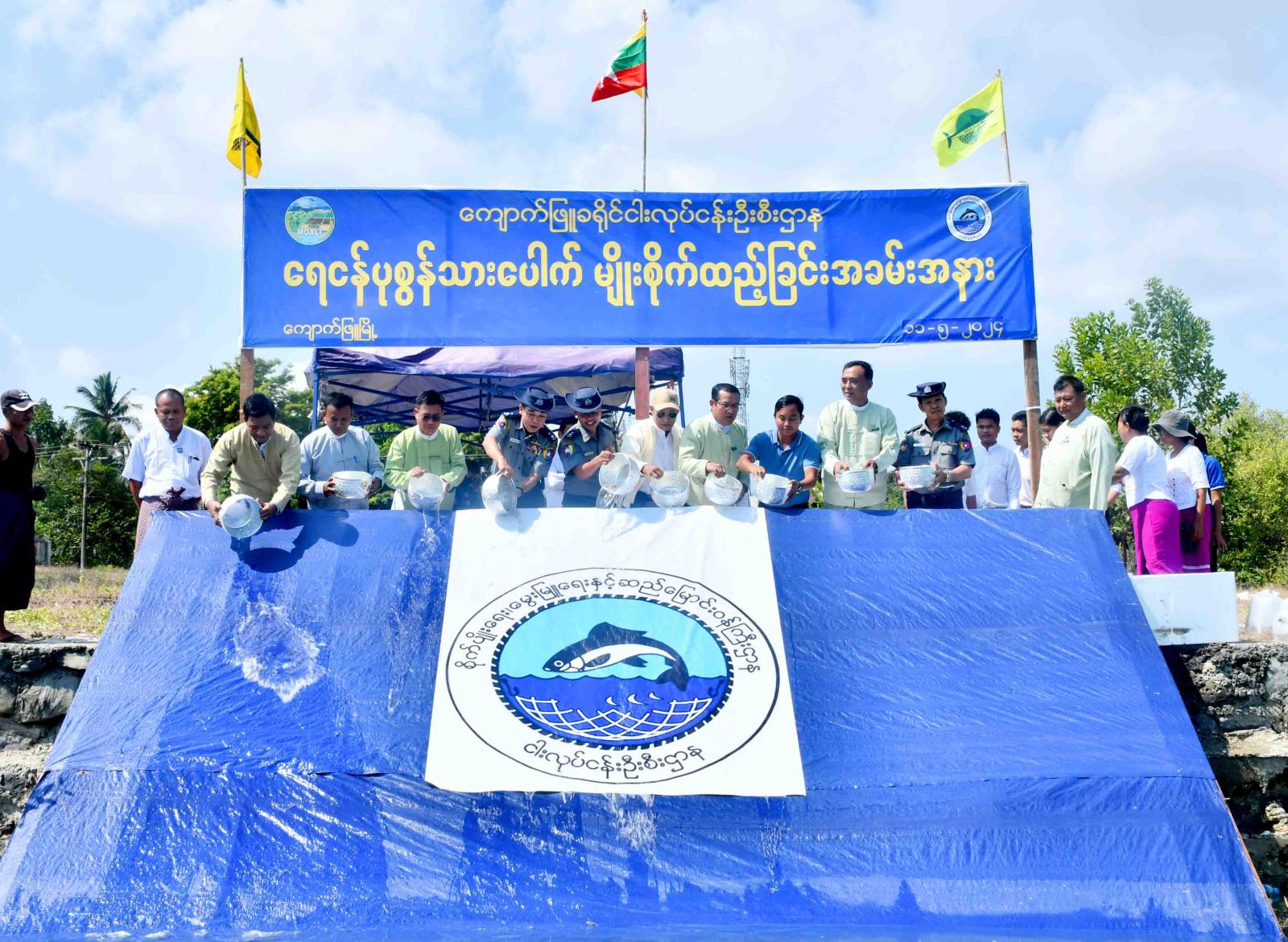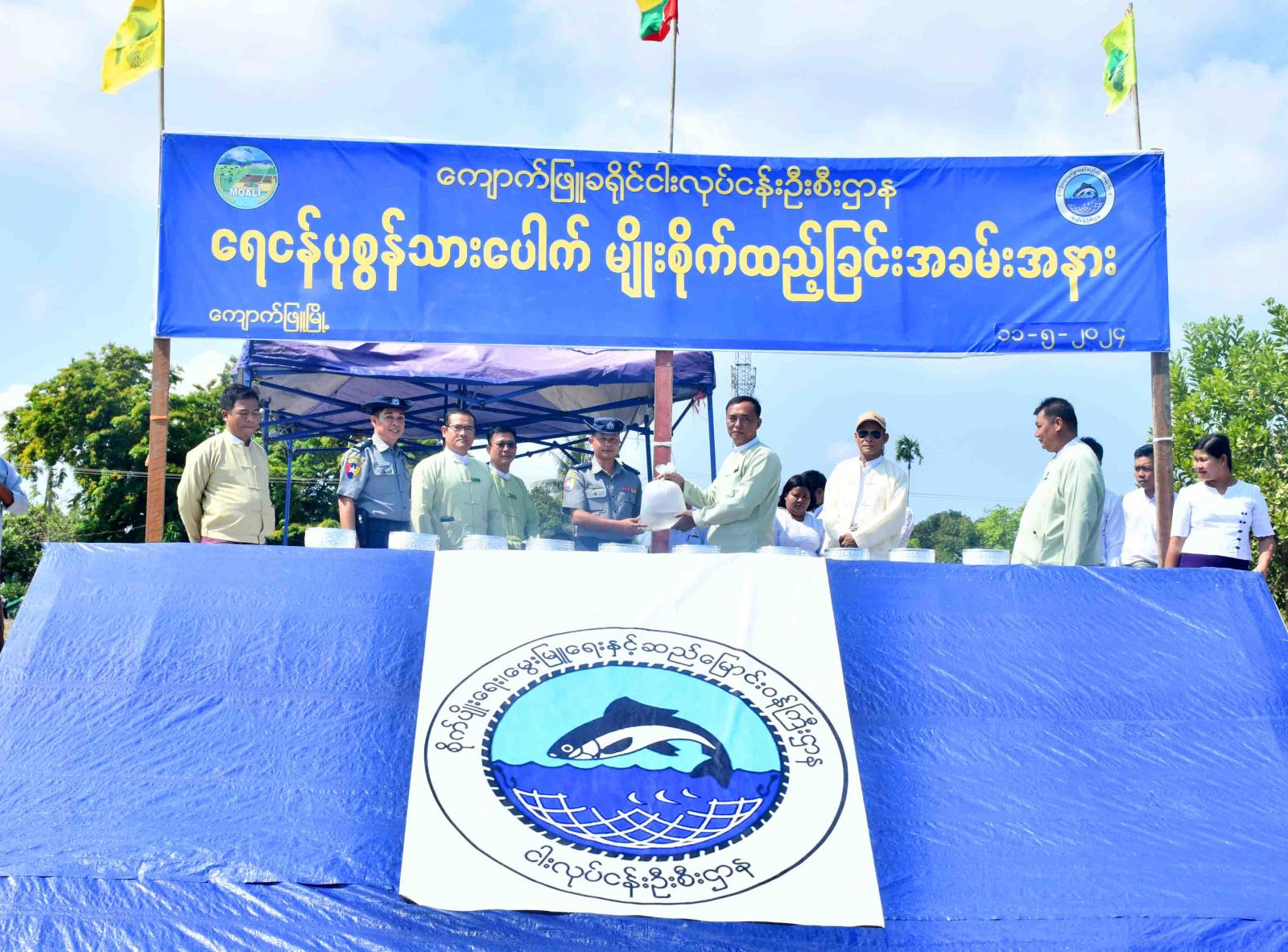 ရှေးဦးစွာ ခရိုင်ငါးလုပ်ငန်းဦးစီးဌာနမှူး ဦးကြည်ဝင်းက အခမ်းအနားတက်ရောက်လာသည့် ခရိုင်စီမံအုပ်ချုပ်ရေးအဖွဲ့ဝင်များ၊ မြို့နယ်စီမံအုပ်ချုပ်ရေးအဖွဲ့ ဥက္ကဋ္ဌနှင့်အဖွဲ့ဝင်များ၊ ဌာနဆိုင်ရာတာဝန် ရှိသူများကို မျိုးစိုက်ထည့်မည့် ရေငန်ပုစွန်သားပေါက်များအား ပေးအပ်ပြီး ငလပွေ့ချောင်းအတွင်းသို့ ရေငန်ပုစွန်သားပေါက်ကောင်ရေ ငါးသိန်းကို မျိုးစိုက်ထည့်ကြသည်။