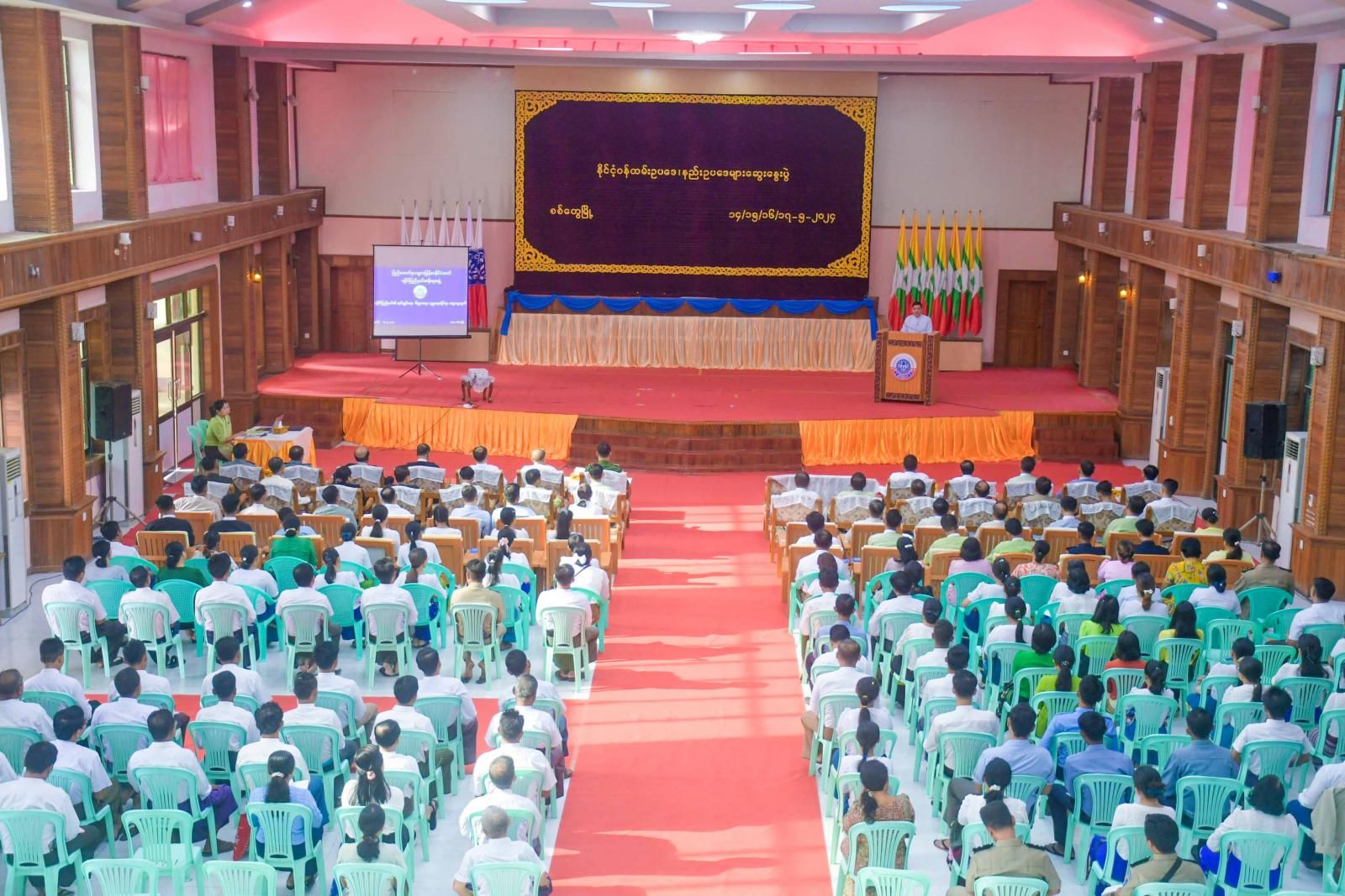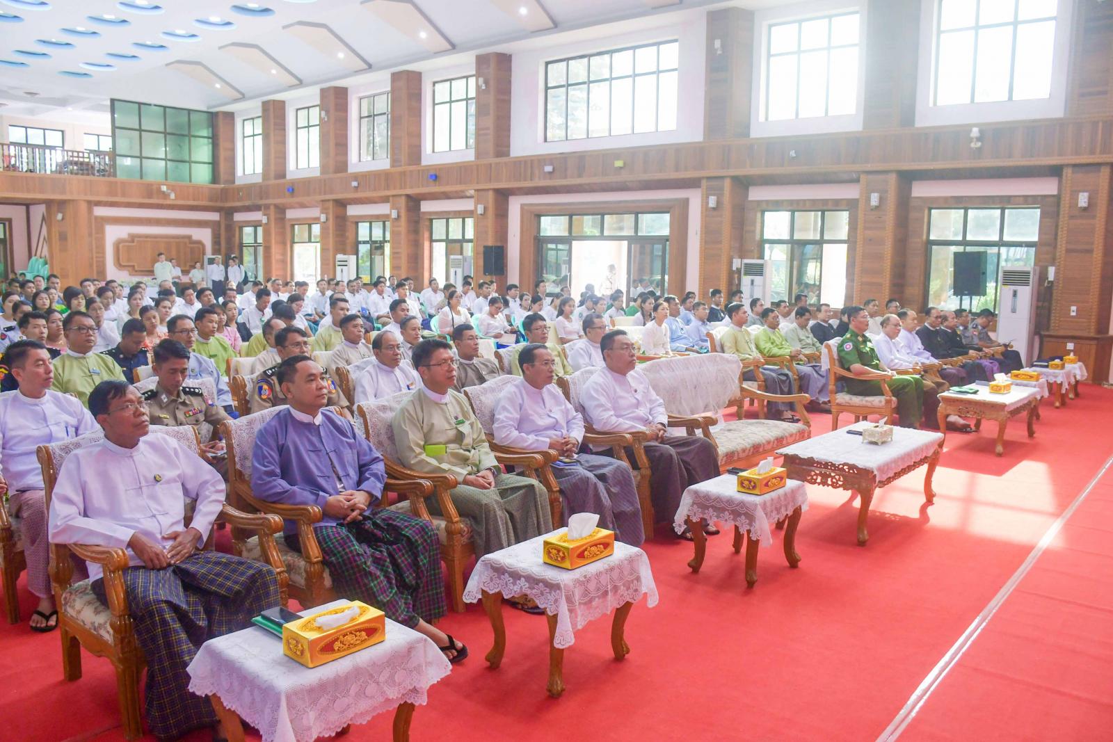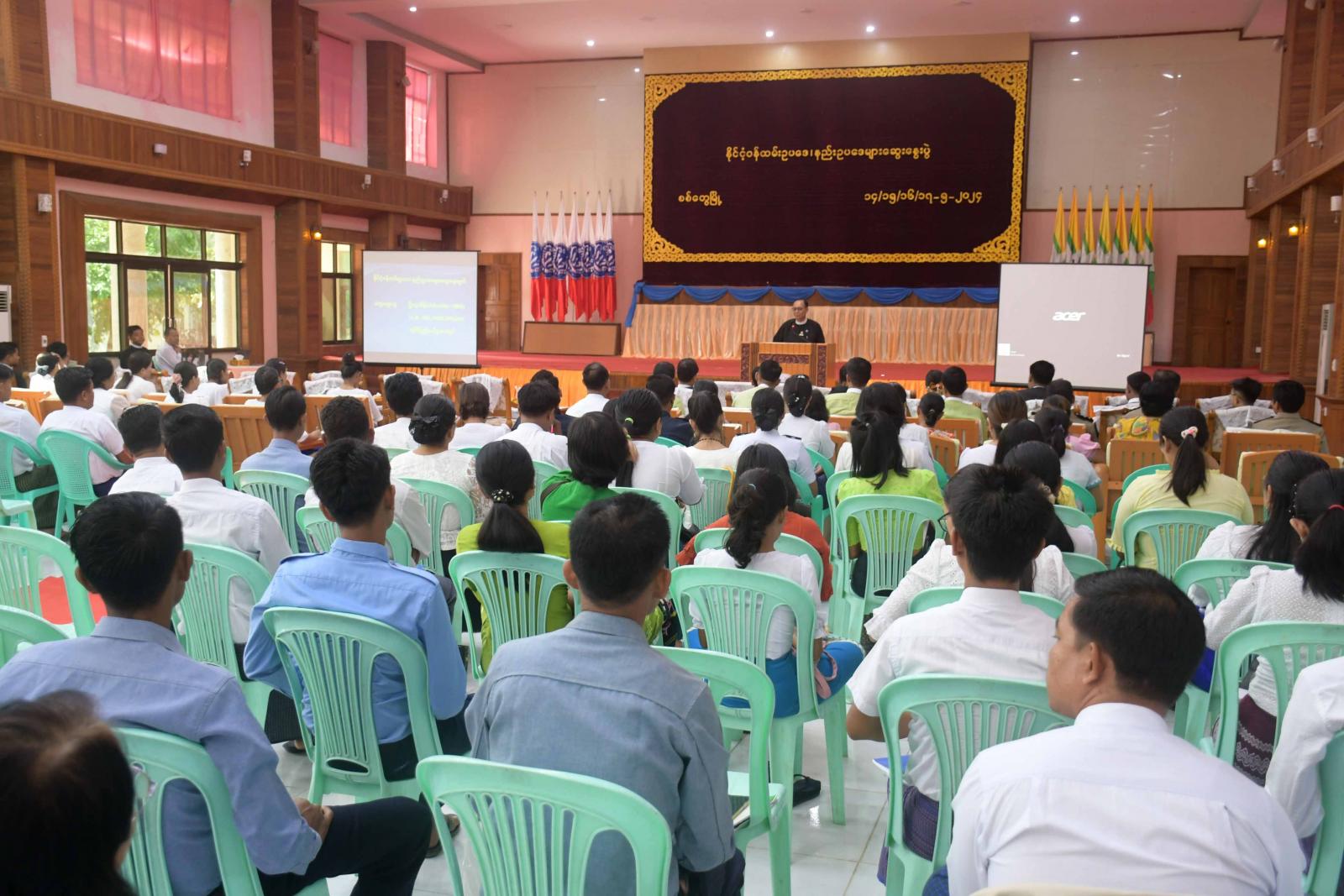 နိုင်ငံ့ဝန်ထမ်းဥပဒေ၊ နည်းဥပဒေများဆွေးနွေးပွဲကို ယနေ့နံနက်ပိုင်းက စစ်တွေမြို့၊ ခိုင်သဇင်ခန်းမ၌ ကျင်းပရာ ရခိုင်ပြည်နယ်ဝန်ကြီးချုပ် ဦးထိန်လင်း၊ ပြည်နယ်အစိုးရအဖွဲ့ဝင်များ၊ ပြည်နယ် အဆင့်ဌာနဆိုင်ရာများနှင့် သင်တန်းသား၊ သင်တန်းသူများ တက်ရောက်ကြသည်။