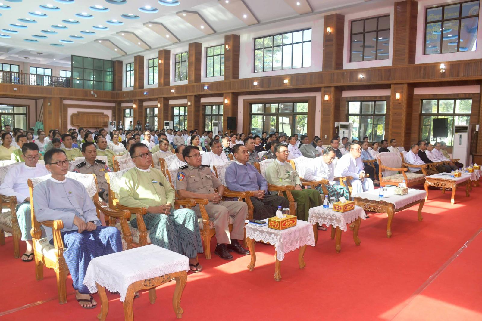 နိုင်ငံ့ဝန်ထမ်းဥပဒေ၊ နည်းဥပဒေများဆွေးနွေးပွဲ ပိတ်ပွဲကို မေလ ၁၇ ရက်နေ့ ညနေပိုင်းက စစ်တွေမြို့၊ ခိုင်သဇင်ခန်းမ၌ကျင်းပရာ ရခိုင်ပြည်နယ်ဝန်ကြီးချုပ် ဦးထိန်လင်း၊ ပြည်နယ်အစိုးရအဖွဲ့ ဝင်များ၊ ပြည်နယ်အဆင့်ဌာနဆိုင်ရာများနှင့် သင်တန်းသား၊ သင်တန်းသူများ တက်ရောက်ကြသည်။
