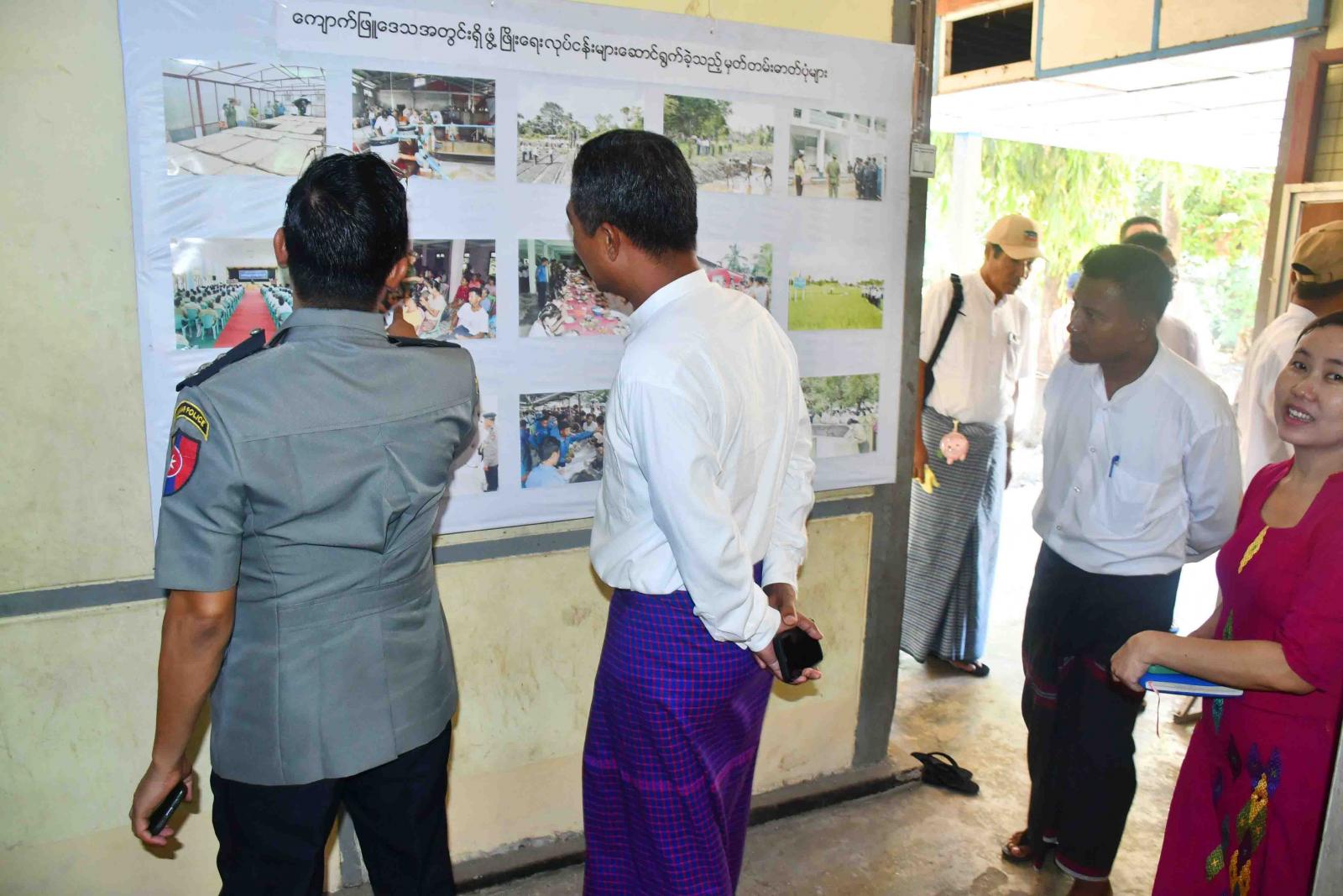 ထိုသို့လှည့်လည်ကြည့်ရှုရာတွင် ခရိုင်စီမံအုပ်ချုပ်ရေးအဖွဲ့ဥက္ကဋ္ဌ ဦးနေမင်းသူနှင့် အဖွဲ့ဝင်များ၊ မြို့နယ်စီမံအုပ်ချုပ်ရေးအဖွဲ့ဥက္ကဋ္ဌ ဦးမျိုးမင်းထွဏ်းနှင့်အဖွဲ့ဝင်များ၊ ဌာနဆိုင်ရာတာဝန်ရှိသူများက ပြန်ကြားရေးနှင့်ပြည်သူ့ဆက်ဆံရေးဦးစီးဌာန၊ လူထုအခြေပြုဗဟိုဌာန Community Centre ခန်းမသို့ သွားရောက်ပြီး အဆိုပါခန်းမ၌ အခြေခံအင်္ဂလိပ်စာသင်တန်းနှင့် ပန်းချီသင်တန်းပြသနေမှုတို့အား ကြည့်ရှုအားပေးပြီး သင်တန်းနည်းပြဆရာများနှင့် သင်တန်းသား၊ သင်တန်းသူများကို ရင်းရင်းနှီးနှီးတွေ့ဆုံကာ လိုအပ်သည်များကို ပေါင်းစပ်ညှိနှိုင်းဆောင်ရွက်ပေးသည်။ ထို့နောက် ခရိုင်စီမံအုပ်ချုပ်ရေးအဖွဲ့ဥက္ကဋ္ဌနှင့် အဖွဲ့ဝင်များ တာဝန်ရှိသူများသည် ပြန်ကြားရေးနှင့်ပြည်သူ့ဆက်ဆံရေးဦးစီးဌာန၌ ပြသထားသည့် အသိပညာပေးနံရံကပ်စာစောင်များ၊ ဒေသဖွံ့ဖြိုးရေးလှုပ်ရှားမှုဓာတ်ပုံများအား စိတ်ပါဝင်စားစွာဖြင့် ကြည့်ရှုအားပေးခဲ့ကြသည်။