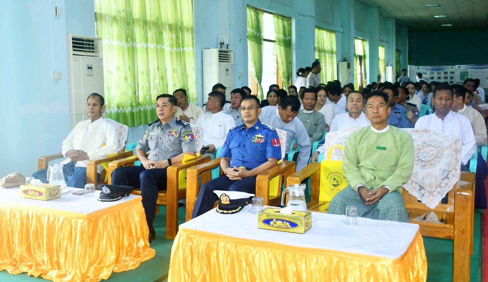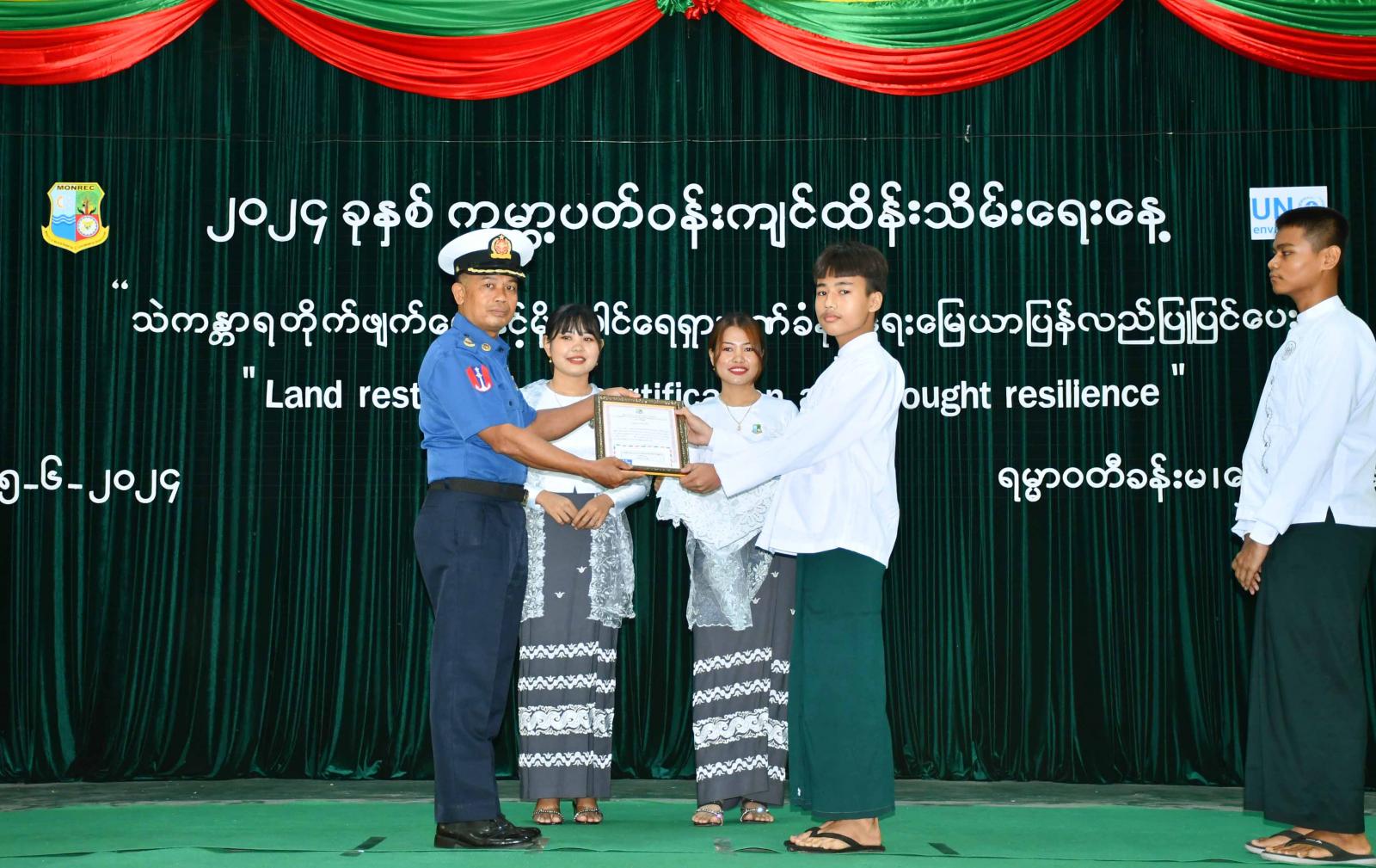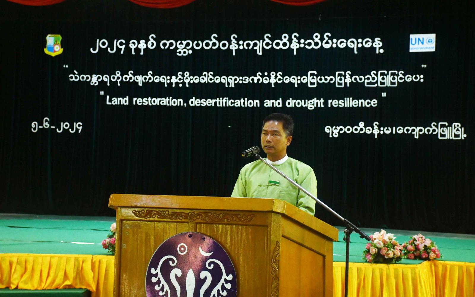 ၂၀၂၄ ခုနှစ်၊ ဇွန်လ (၅) ရက်နေ့တွင် ကျရောက်သည့် ကမ္ဘာ့ပတ်ဝန်းကျင်ထိန်းသိမ်းရေးနေ့ “သဲကန္တာရတိုက်ဖျက်ရေးနှင့် မိုးခေါင်ရေရှား ဒဏ်ခံနိုင်ရေး မြေယာပြန်လည်ပြုပြင်ပေး” အထိမ်းအမှတ် အခမ်းအနားကို ယနေ့ နံနက်ပိုင်းက အစိုးရရပ်ကွက်ရှိ ရမ္မာဝတီခန်းမ၌ ကျင်းပပြုလုပ်ရာ ခရိုင်စီမံအုပ်ချုပ်ရေးအဖွဲ့ဥက္ကဋ္ဌနှင့် အဖွဲ့ဝင်များ၊ ခရိုင်/မြို့နယ်အဆင့် ဌာနဆိုင်ရာများ၊ ပတ်ဝန်းကျင်ထိန်းသိမ်းရေးဦးစီးဌာနမှ ခရိုင်ဦးစီးမှူးနှင့် ဝန်ထမ်းများ၊ ဆရာ၊ဆရာမများနှင့် ဆုရကျောင်းသား၊ကျောင်းသူများ တက်ရောက်ကြသည်။