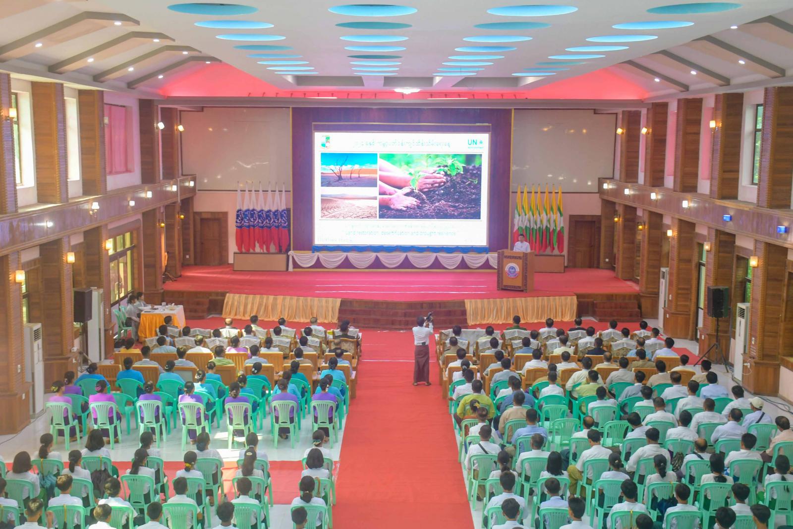 အခမ်းအနားတွင် ရခိုင်ပြည်နယ်ဝန်ကြီးချုပ် ဦးထိန်လင်းက ကမ္ဘာ့ပတ်ဝန်းကျင် ထိန်းသိမ်းရေးနေ့သည် ကမ္ဘာလုံးဆိုင်ရာ ပတ်ဝန်းကျင်ထိန်းသိမ်းရေးအတွက် အလွန်ထူးခြားလေးနက်သည့်နေ့ဖြစ်ပြီး နှစ်စဉ်နှစ်တိုင်း ကမ္ဘာ့နိုင်ငံအသီးသီးတွင် အမျိုးသားအဆင့်နှင့်ဒေသအဆင့် ပတ်ဝန်းကျင်ထိန်းသိမ်းရေး ဆိုင်ရာ လှုပ်ရှား ဆောင်ရွက်မှုများကို ကျင်းပပြုလုပ်ခဲ့ကြကြောင်း၊ ၂၀၂၄ ခုနှစ်၊ နိုင်ငံတကာအဆင့် ကမ္ဘာ့ပတ်ဝန်းကျင် ထိန်းသိမ်းရေးနေ့ အခမ်းအနားကို ဆော်ဒီအာရေဗျနိုင်ငံက အိမ်ရှင်နိုင်ငံအဖြစ် လက်ခံကျင်းပလျက်ရှိပြီး မြန်မာနိုင်ငံတွင် နေပြည်တော်၊ MICC-2 မှာ ယနေ့အခမ်းအနားဖြင့် တစ်ပြိုင်တည်း ကျင်းပလျက်ရှိကြောင်း၊ ကမ္ဘာ့နိုင်ငံအသီးသီးမှ ပြည်သူများ ပတ်ဝန်းကျင်ထိန်းသိမ်းရေး လုပ်ငန်းများအပေါ် အာရုံစူးစိုက်မိလာစေရန်၊ ကမ္ဘာ့ပတ်ဝန်းကျင်ဆိုင်ရာ ထိခိုက်ပျက်စီးနေမှု ပြဿနာများအနက် အခြေအနေနှင့် အချိန်အခါပေါ်မူတည်ပြီး နှစ်အလိုက်ဖြစ်ပွားပေါ်ပေါက်နေသည့် အရေးကြီး ပြဿနာရပ်များ၊ အဓိကစိန်ခေါ်နေမှုများကို ပိုမိုသိရှိကာ အလေးထားဖြေရှင်းဆောင်ရွက်လာကြစေရန် ရည်ရွယ်ပြီး ကမ္ဘာ့ပတ်ဝန်းကျင်ထိန်းသိမ်းရေးနေ့ အထိမ်းအမှတ် ဆောင်ပုဒ်များကို ၁၉၇၄ ခုနှစ်မှစ၍ နှစ်စဉ်ထုတ်ပြန် သတ်မှတ်ပေးခဲ့ပြီး ၁၉၈၇ ခုနှစ်မှစ၍ အပြည်ပြည်ဆိုင်ရာ အခမ်းအနားများကိုပါ ကမ္ဘာ့နိုင်ငံအသီးသီးရှိ မြို့ကြီးများမှာ နှစ်စဉ်လှည့်လည် ကျင်းပခဲ့ကြောင်း၊ မြန်မာနိုင်ငံ အပါအဝင် ကမ္ဘာ့နိုင်ငံအများအပြားအနေဖြင့် လက်ရှိရင်ဆိုင်ကြုံတွေ့နေရသည့် ပတ်ဝန်းကျင်ယိုယွင်းပျက်စီး မှုဆိုင်ရာ စိန်ခေါ်မှုပြဿနာများထဲမှာ “သဲကန္တာရတိုက်ဖျက်ရေးနဲ့ မိုးခေါင်ရေရှားမှုဒဏ်ခံနိုင်ရည်ရှိရေး” သည်လည်း အဓိကအရေးကြီးသော ပြဿနာဖြစ်လာသည့်အတွက် ယခုနှစ်ကမ္ဘာ့ပတ်ဝန်းကျင် ထိန်းသိမ်းရေးနေ့ အထိမ်းအမှတ်နေ့ ဆောင်ပုဒ်ကိုလည်း “သဲကန္တာရတိုက်ဖျက်ရေးနှင့် မိုးခေါင်ရေရှားဒဏ်ခံနိုင်ရေး မြေယာပြန်လည်ပြုပြင်ပေး (Land restoration, desertification and drought resilience)” ဟု သတ်မှတ်ခဲ့ခြင်း ဖြစ်ကြောင်း၊ ကမ္ဘာ့ပတ်ဝန်းကျင်ထိန်းသိမ်းရေးနေ့ အထိမ်းအမှတ် အခမ်းအနားကို ကျင်းပခြင်းအားဖြင့် ပြည်သူ များအကြား ပတ်ဝန်းကျင်ထိန်းသိမ်းရေးဆိုင်ရာမှာ စိတ်ပါဝင်စားမှုများ မြင့်မားလာစေပြီး ပတ်ဝန်းကျင် ထိန်းသိမ်းရေးလုပ်ငန်းများတွင် ကိုယ်တိုင်ပူးပေါင်းပါဝင် ဆောင်ရွက်လိုစိတ်များ တိုးတက်ဖြစ်ပေါ်လာစေနိုင်မည်ဖြစ်ကြောင်းနှင့် ယနေ့အခမ်းအနားကိုတက် ရောက်လာကြသူများနှင့် ပြည်သူများအားလုံးအနေဖြင့် ပတ်ဝန်းကျင်ထိန်းသိမ်းရေးကို အထောက်အကူဖြစ်စေမည့် မိမိတို့၏နေ့စဉ်ပြုမူနေထိုင်မှုပုံစံများကို ပြုပြင
