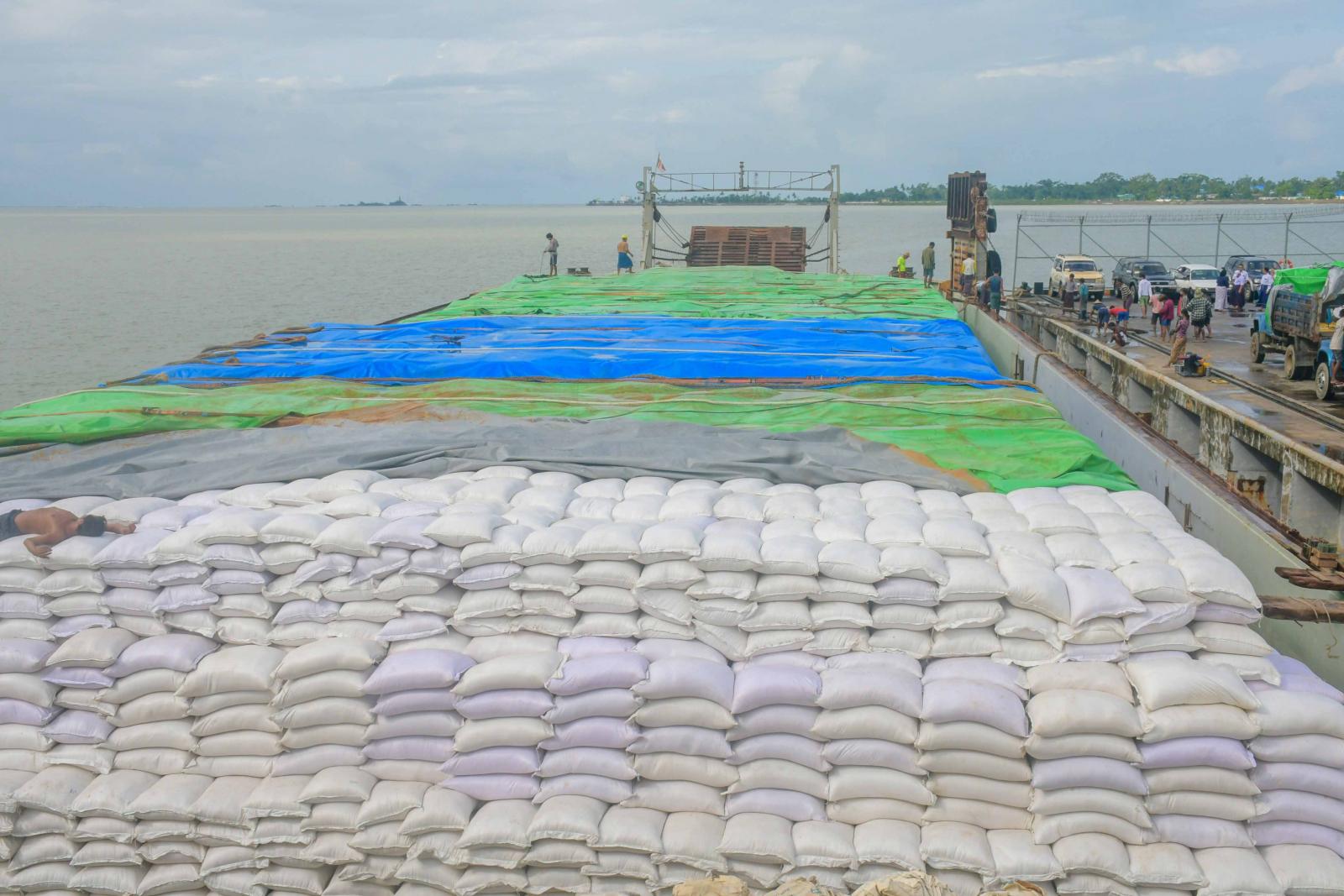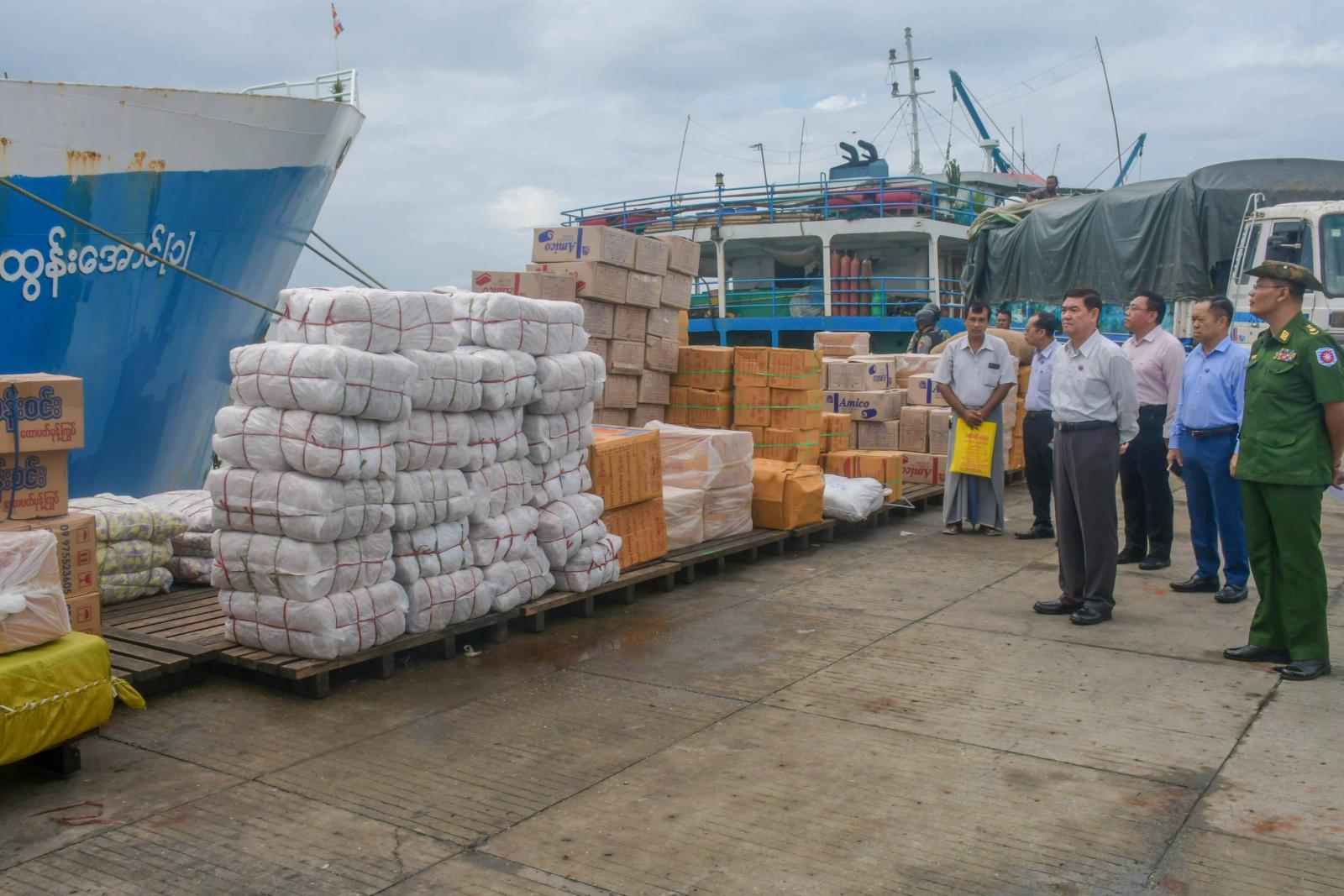 အဆိုပါပစ္စည်းများအား လူအင်အား၊ စက်ယန္တရားအင်အားများအသုံးပြုကာ ကုန်တင်ကုန်ချပြုလုပ်နေမှုအား ရခိုင်ပြည်နယ်ဝန်ကြီးချုပ် ဦးထိန်လင်းနှင့် တာဝန်ရှိသူများက သွားရောက်ကြည့်ရှုစစ်ဆေးကြပြီး ပြည်နယ်ဝန်ကြီးချုပ်က ရောက်ရှိလာသော ကုန်ပစ္စည်းများအား စနစ်တကျ အတင်အချပြုလုပ်နိုင်ရေး၊ ကုန်ပစ္စည်းများ ပျက်စီးဆုံးရှုံးမှုမဖြစ်စေရေး၊ သိုလှောင်ထိန်းသိမ်းရောင်းချခြင်းမပြုစေရေး၊ လိုအပ်မှုမရှိသောနေရာများသို့ မရောက်ရှိစေနိုင်ရေးနှင့် ဘေးအန္တရာယ်ကင်းရှင်းစွာ ဆောင်ရွက်နိုင်ရေးတို့ကို မှာကြားပြီး လိုအပ်သည်များကို တာဝန်ရှိသူများနှင့် ပေါင်းစပ်ညှိနှိုင်းပေးခဲ့သည်။