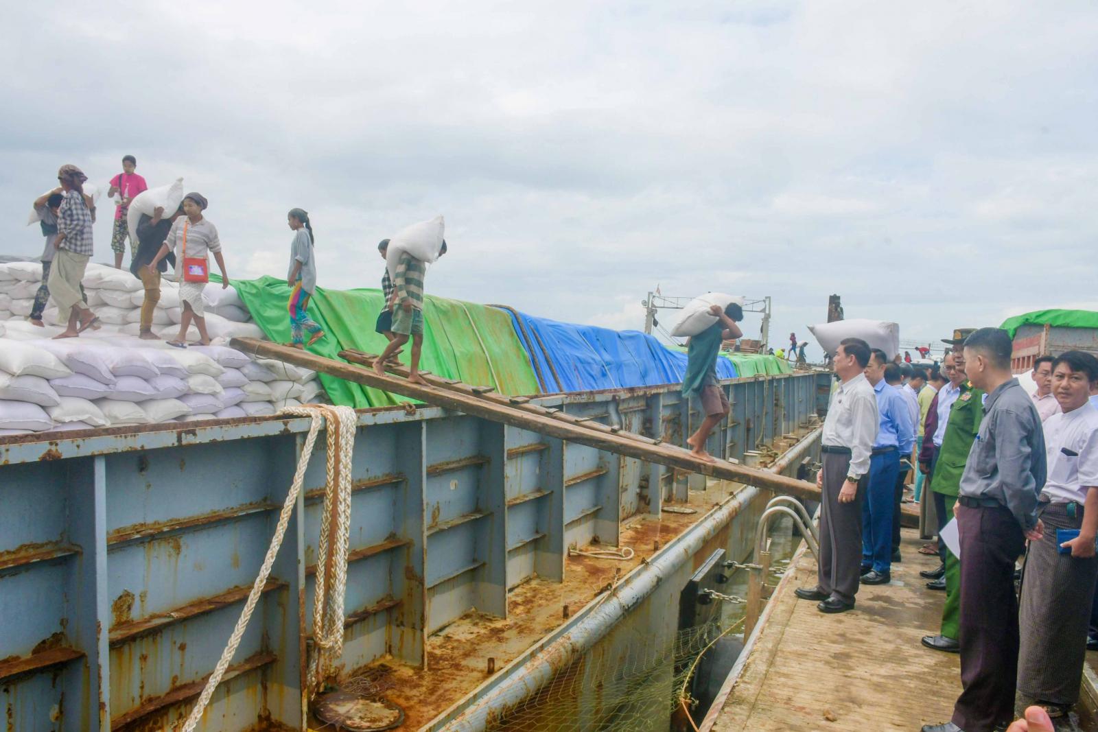 ဆက်လက်၍ ပြည်နယ်ဝန်ကြီးချုပ်နှင့်အဖွဲ့သည် အဆိုပါဆိပ်ကမ်း၌ အမ်ဗွီ-ရဲထွန်းအောင်၊ အမ်ဗွီ-အောင်ရတနာ သင်္ဘောတို့မှ ဆန်နှင့်စားသောက်ကုန်ပစ္စည်းများအား အတင်အချပြုလုပ်နေမှုကို သွားရောက်ကြည့်ရှုစစ်ဆေးကြပြီး လိုအပ်သည်များကို တာဝန်ရှိသူများနှင့် ပေါင်းစပ်ညှိနှိုင်းပေးခဲ့သည်။