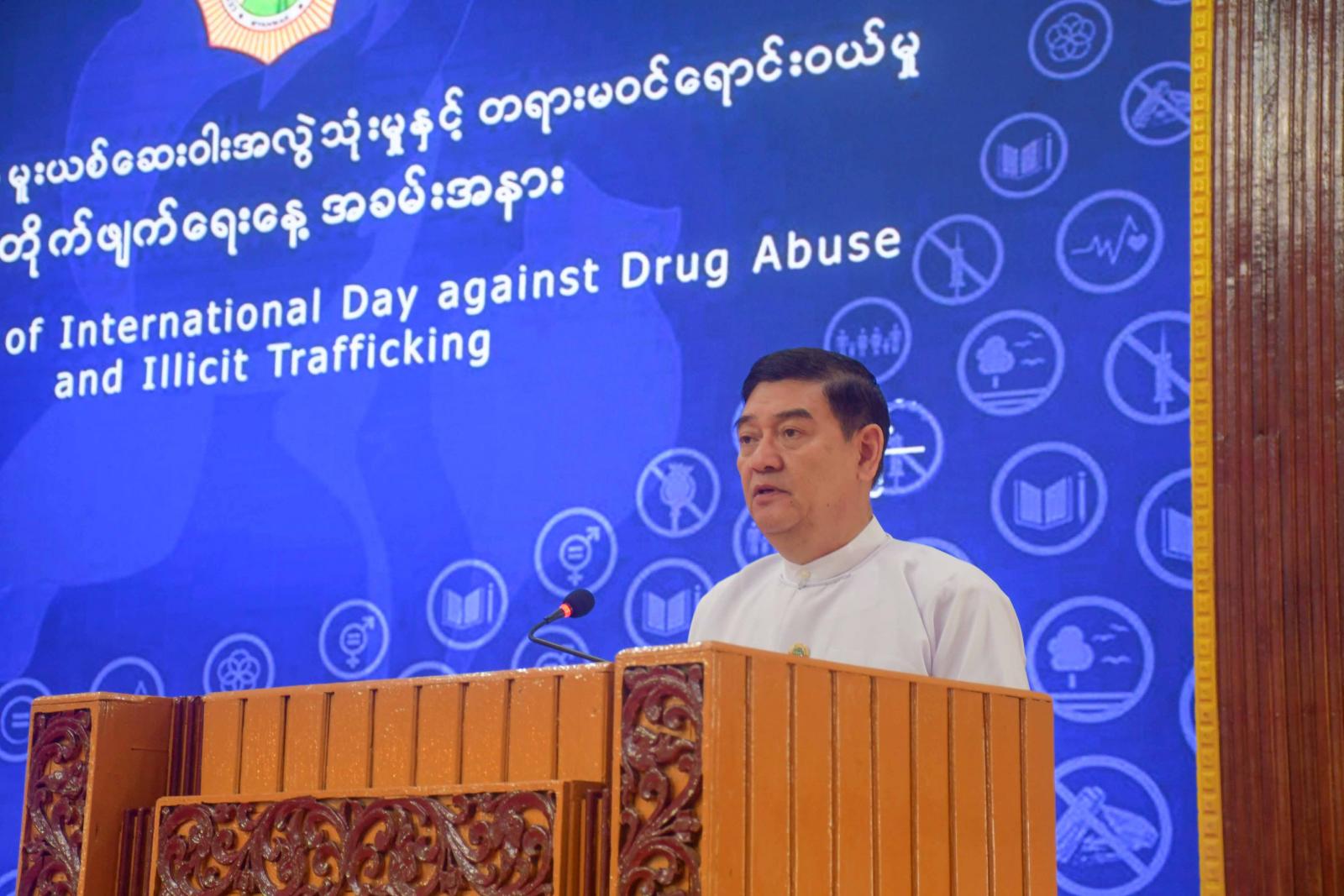 အခမ်းအနားတွင် ရခိုင်ပြည်နယ် ဝန်ကြီးချုပ် ဦးထိန်လင်းက မူးယစ်ဆေးဝါး အလွဲသုံးမှုနှင့် တရားမဝင် ရောင်းဝယ်မှု တိုက်ဖျက်ရေးနေ့ကို ၁၉၈၇ ခုနှစ်၊ ဒီဇင်ဘာလ (၇) ရက်နေ့တွင် ပြုလုပ်ခဲ့သည့် ကုလသမဂ္ဂအထွေထွေညီလာခံက ဆုံးဖြတ်ချက်ချမှတ်ခဲ့ပြီး နှစ်စဉ်ဇွန်လ (၂၆) ရက်နေ့ ရောက်ရှိတိုင်း ယခုကဲ့သို့ အခမ်းအနားကို ကမ္ဘာ့နိုင်ငံအသီးသီး၌ ကျင်းပလျက်ရှိကြောင်း၊ မြန်မာနိုင်ငံတစ်ဝှမ်းလုံးတွင်လည်း ကျင်းပလျက်ရှိရာ (၃၇) ကြိမ်မြောက်ရှိပြီဖြစ်ကြောင်း၊ မူယစ်ဆေးဝါးပြဿနာသည် နိုင်ငံတစ်နိုင်ငံ၊ လူမျိုး တစ်မျိုးအနေဖြင့် ရင်ဆိုင်ဖြေရှင်းနေရသည့် ပြဿနာမျိုးမဟုတ်ဘဲ နိုင်ငံတိုင်း၊ လူမျိုးတိုင်း၊ လူသားမျိုးနွယ် တစ်ရပ်လုံး ရင်ဆိုင်ဖြေရှင်းနေရသည့် ပြဿနာဖြစ်ကြောင်း၊ မြန်မာနိုင်ငံအနေဖြင့် မူးယစ်ဆေးဝါး တားဆီးနှိမ်နင်းရေး လုပ်ငန်းများကို စစ်ဆင်ရေးတစ်ရပ်အသွင်ဖြင့် ၂၀၀၃ ခုနှစ်မှစ၍ ဆောင်ရွက်ခဲ့ရာ ယခုနှစ်အထိ (၂၁)နှစ်တာကာလအတွင်း စစ်ဆင်ရေး (၃၉)ခုဖြင့် ဆောင်ရွက်လျက်ရှိကြောင်း၊ ရခိုင်ပြည်နယ် မူးယစ်ဆေးဝါးနှင့် စိတ်ကိုပြောင်းလဲစေသော ဆေးဝါးများ အန္တရာယ်တားဆီးကာကွယ်ရေးအဖွဲ့အနေဖြင့် မူးယစ်တားဆီးကာကွယ်ရေးဗဟိုအဖွဲ့၏ လမ်းညွှန်ချက်များအပေါ် လိုက်နာဆောင်ရွက်ပြီး ပြည်နယ်ရဲတပ်ဖွဲ့ အနေဖြင့် ၂၀၂၃ ခုနှစ်တွင် မူးယစ်ဆေးဝါးမှု (၁၀၁)မှု၊ စိတ်ကြွရူးသွပ်ဆေးပြား၊ အိုက်(စ်)၊ ဆေးခြောက်၊ အက်တာစီ၊ အယ်ပရာဇိုလမ်၊ ကတ်တမင်း၊ ဒိုင်ယာဇီပင်တို့ကို ဖော်ထုတ်ဖမ်းဆီးနိုင်ခဲ့ပြီး တရားခံ (၁၄၃) ဦးတို့အား ဖမ်းဆီးရမိခဲ့ကြောင်း၊ အလားတူ ၂၀၂၄ ခုနှစ်တွင် မူးယစ်ဆေးဝါးမှု (၁၀)မှု၊ စိတ်ကြွရူးသွပ်ဆေးပြား၊ အိုက်(စ်)၊ ဆာလဖြူရစ်အက်စစ်တို့ကို ဖော်ထုတ်ဖမ်းဆီးနိုင်ခဲ့ပြီး တရားခံ (၁၆)ဦးတို့အား ဖမ်းဆီးရမိခဲ့ကြောင်း၊ ၂၀၂၄ ခုနှစ်၊ အပြည်ပြည်ဆိုင်ရာ မူးယစ်ဆေးဝါးအလွဲသုံးမှုနှင့် တရားမဝင် ရောင်းဝယ်မှု တိုက်ဖျက်ရေးနေ့ အထိမ်းအမှတ်အဖြစ် ကုလသမဂ္ဂအရှေ့တောင်အာရှနှင့် ပစိဖိတ်ဒေသဆိုင်ရာ မူးယစ်ဆေးဝါးနှင့် မှုခင်းဆိုင်ရာရုံး (UNODC)မှ ပေးပို့သည့် ဆောင်ပုဒ်တွင် မူးယစ်အန္တရာယ် ကင်းစင်ရေးဘက်စုံ ကြိုတင်ကာကွယ်ပေးဆိုသည့်အတိုင်း မူးယစ်ဆေးဝါး ပြဿနာသည် လူသားထုတစ်ရပ်လုံး၏ ပြဿနာဖြစ်သည့်အတွက် အမျိုးသားမူးယစ်ဆေးဝါး ထိန်းချုပ်ရေးကို လူ့အသိုင်းအဝိုင်းတစ်ရပ်လုံးပါဝင်သည့် ချဉ်းကပ်မှုပုံစံဖြင့် လူပုဂ္ဂိုလ်တစ်ဦးချင်းစီမှ မိသားစုများ၊ လူ့အသိုင်းအဝိုင်းများ၊ လူမှုအဖွဲ့အစည်းများ၊ ဌာနဆိုင်ရာများ၊ ပြည်နယ်အစိုးရ၊ ပြည်ထောင်စုအစိုးရစသည်ဖြင့် ကဏ္ဍပေါင်းစုံပါဝင်ပြီး အဆင့်ဆင့် ပေါင်းစပ်ဆောင် ရွက်သွားရမည်ဖြစ်ကြောင်း ပြောကြားသည်။