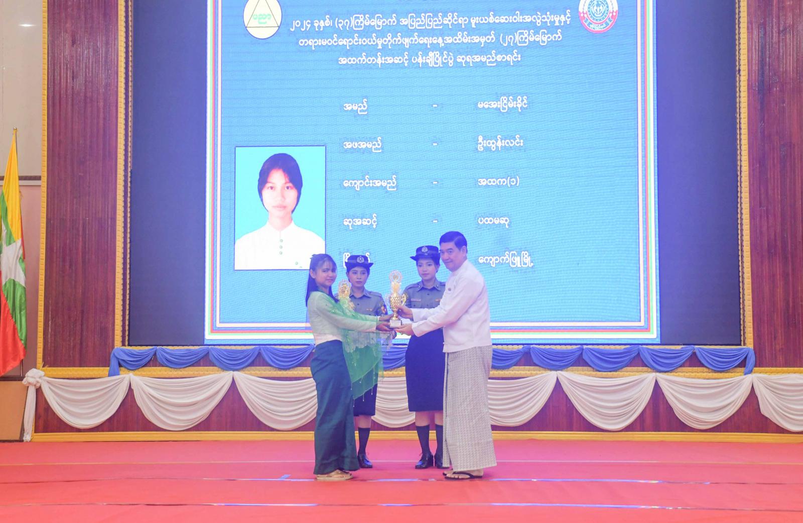 ထို့နောက် ရခိုင်ပြည်နယ်ဝန်ကြီးချုပ် ဦးထိန်လင်း၊ ပြည်နယ်တရားလွှတ်တော် တရားသူကြီးချုပ်၊ ပြည်နယ်ဝန်ကြီးများနှင့် တာရှိသူများက (၃၇)ကြိမ်မြောက် အပြည်ပြည်ဆိုင်ရာ မူးယစ်ဆေးဝါးအလွဲ သုံးမှုနှင့် တရားမဝင်ရောင်းဝယ်မှု တိုက်ဖျက်ရေးနေ့အထိမ်းအမှတ် ပြည်နယ်အဆင့် ပန်းချီး၊ ကာတွန်း၊ ပိုစတာပြိုင်ပွဲများတွင် ဆုရရှိကြသည့် ကျောင်းသား၊ ကျောင်းသူများကို ဆုများပေးအပ်ချီးမြှင့်ကြသည်။