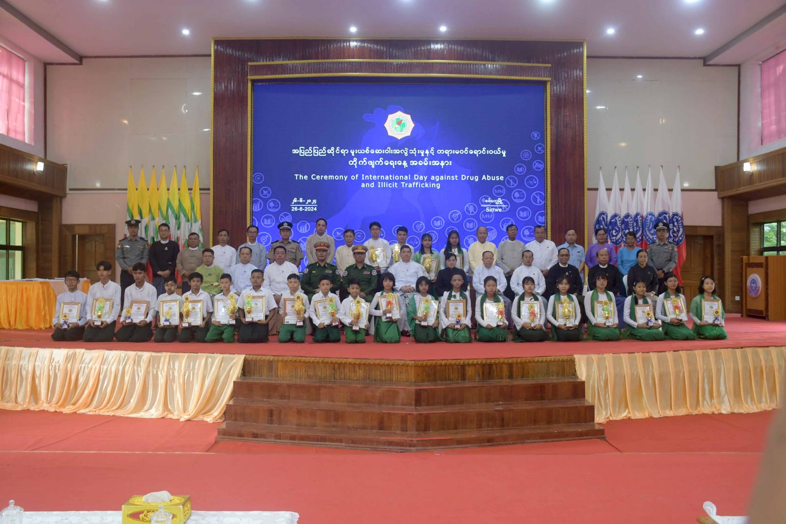 (၃၇) ကြိမ်မြောက် အပြည်ပြည်ဆိုင်ရာ မူးယစ်ဆေးဝါး အလွဲသုံးမှုနှင့် တရားမဝင် ရောင်းဝယ်မှု တိုက်ဖျက်ရေးနေ့ အထိမ်းအမှတ် အခမ်းအနားကို ယနေ့ နံနက်ပိုင်းက စစ်တွေမြို့၊ ခိုင်သဇင်ခန်းမ၌ ကျင်းပရာ ရခိုင်ပြည်နယ်ဝန်ကြီးချုပ် ဦးထိန်လင်း၊ ပြည်နယ်တရားလွှတ်တော် တရားသူကြီးချုပ်၊ ပြည်နယ်အစိုးရ အဖွဲ့ဝင်များ၊ စစ်တွေတပ်နယ်မှ တပ်မတော်အရာရှိကြီးများ၊ ဌာနဆိုင်ရာများ၊ ဆရာ၊ ဆရာမများ၊ ကျောင်းသား၊ ကျောင်းသူများ၊ ဖိတ်ကြားထားသူများ တက်ရောက်ကြသည်။