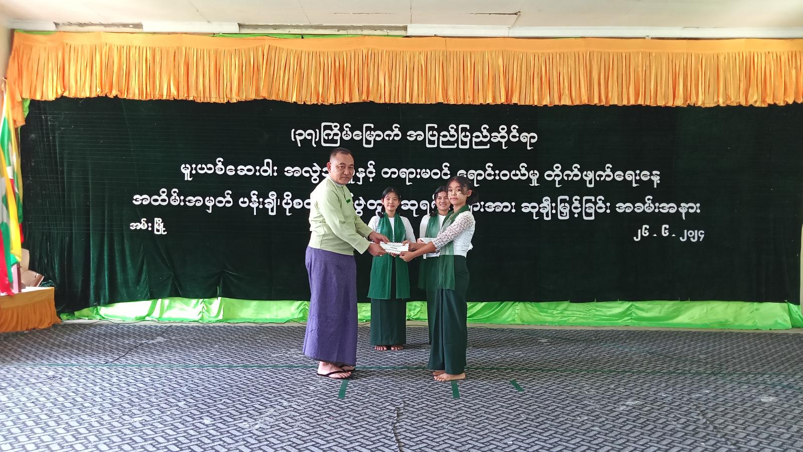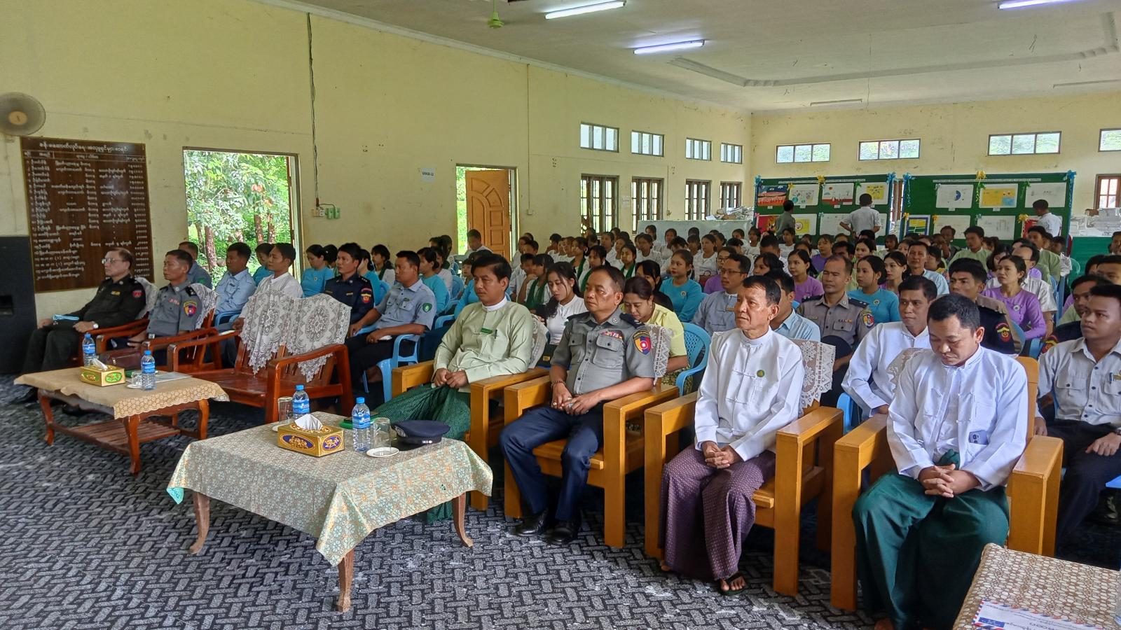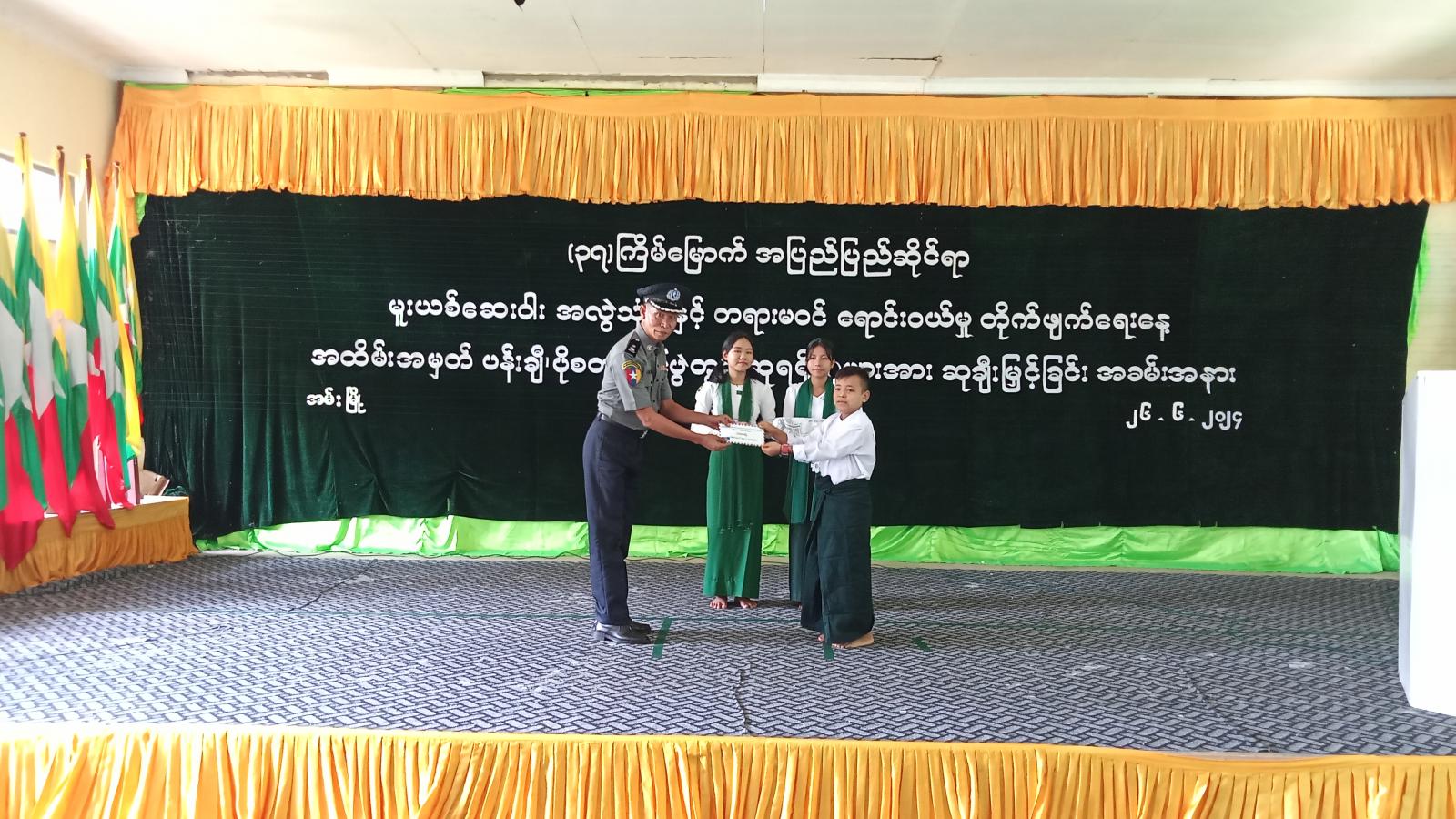 (၃၇)ကြိမ်မြောက် အပြည်ပြည်ဆိုင်ရာမူးယစ်ဆေးဝါးအလွဲသုံးမှုနှင့် တရားမ၀င်ရောင်း၀ယ်မှုတိုက်ဖျက်ရေးနေ့အထိမ်းအမှတ် ပန်းချီ၊ ကာတွန်း၊ ပိုစတာပြိုင်ပွဲတွင် အခြေခံပညာအထက်တန်းအဆင့် ပထမဆုရရှိသည့် ကျောင်းသူမဇင်မာထွန်းနှင့် မဝင်းကြယ်ဇင်တို့အား ခရိုင်စီမံအုပ်ချုပ်ရေးအဖွဲ့ဥက္ကဋ္ဌ ဦးအောင်ဇော်ထက်က ဆုချီးမြှင့်ပေးအပ်ခဲ့သည်။ ထို့နောက် အခြေခံပညာအထက်တန်း၊ အလယ်တန်းနှင့် မူလတန်းအဆင့် ဆုရရှိသည့်ကျောင်းသား၊ ကျောင်းသူများအား ခရိုင်ရဲတပ်ဖွဲ့မှူး(ယာယီ) ဒုတိယရဲမှူးကြီးဝင်းနိုင်နှင့် ခရိုင်စီမံအုပ်ချုပ်ရေးအဖွဲ့ အဖွဲ့၀င်များ၊ မြို့နယ်စီမံအုပ်ချုပ်ရေးအဖွဲ့ဥက္ကဋ္ဌ ဦးစိုးမင်းထက်၊ မြို့နယ်ရဲတပ်ဖွဲ့မှူး ရဲမှူးမင်းဦး၊ မြို့နယ်စီမံအုပ်ချုပ်ရေးအဖွဲ့အဖွဲ့၀င်များ၊ ခရိုင်၊ မြို့နယ်အဆင့်ဌာနဆိုင်ရာများက ဆုချီးမြှင့်ပေးအပ်ခဲ့ကြသည်။