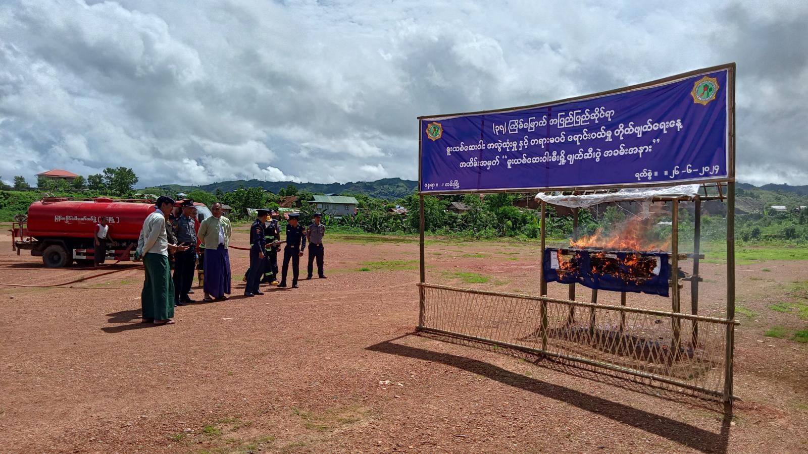 ဆက်လက်၍ (၃၇)ကြိမ်မြောက် အပြည်ပြည်ဆိုင်ရာမူးယစ်ဆေးဝါးအလွဲသုံးမှုနှင့် တရားမ၀င်ရောင်း၀ယ်မှုတိုက်ဖျက်ရေးနေ့အထိမ်းအမှတ် မူးယစ်ဆေးဝါးမီးရှို့ဖျက်ဆီးပွဲသို့ ခရိုင်စီမံအုပ်ချုပ်ရေးအဖွဲ့ဥက္ကဋ္ဌ ဦးအောင်ဇော်ထက်၊ ခရိုင်ရဲတပ်ဖွဲ့မှူး(ယာယီ) ဒုတိယရဲမှူးကြီးဝင်းနိုင်နှင့် ခရိုင်စီမံအုပ်ချုပ်ရေးအဖွဲ့အဖွဲ့၀င်များ၊ မြို့နယ်စီမံအုပ်ချုပ်ရေးအဖွဲ့ ဥက္ကဋ္ဌဦးစိုးမင်းထက်၊ မြို့နယ်ရဲတပ်ဖွဲ့မှူး ရဲမှူးမင်းဦးနှင့် မြို့နယ်စီမံအုပ်ချုပ်ရေးအဖွဲ့အဖွဲ့၀င်များ၊ ခရိုင်၊ မြို့နယ်အဆင့်ဌာနဆိုင်ရာများ၊ ဆရာ၊ ဆရာမများ၊ မြို့နယ်မိခင်နှင့်ကလေး၊ အမျိူးသမီးရေးရာအဖွဲ့ အဖွဲ့ဝင်များတက်ရောက်၍ မူးယစ်ဆေးဝါးမီးရှို့ဖျက်ဆီးနေမှု့အား ကြည့်ရှုအားပေးကြကြောင်းသိရှိရသည်။