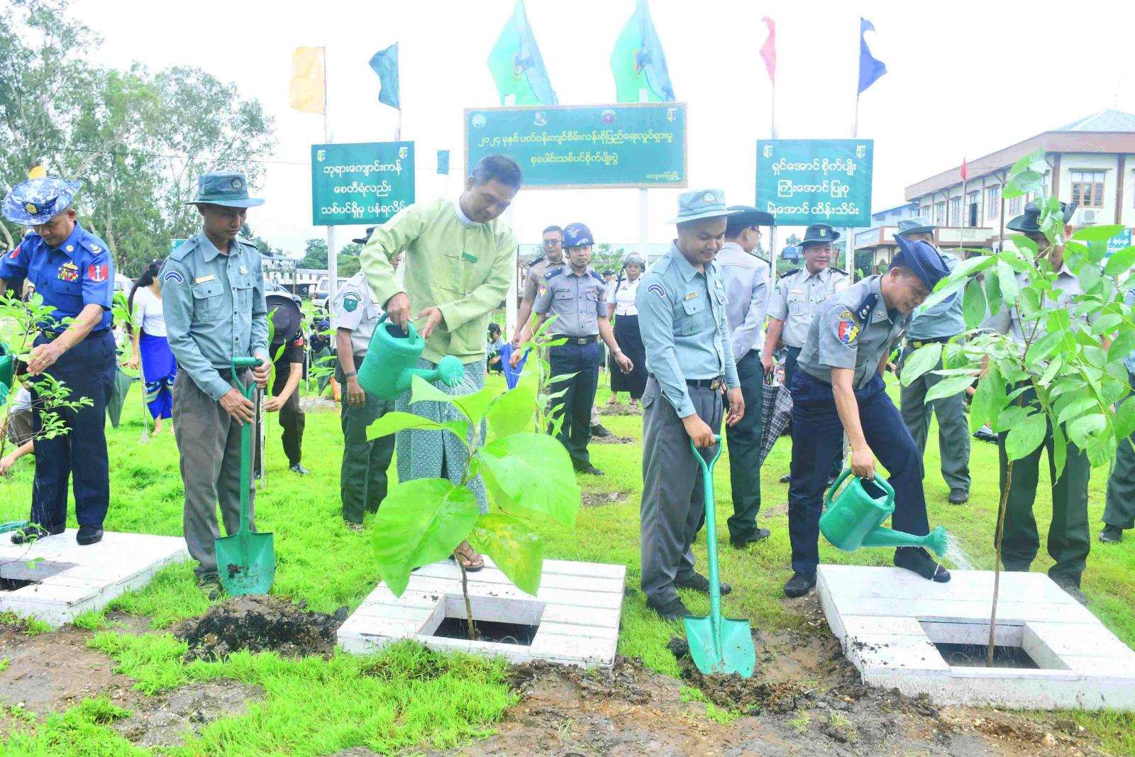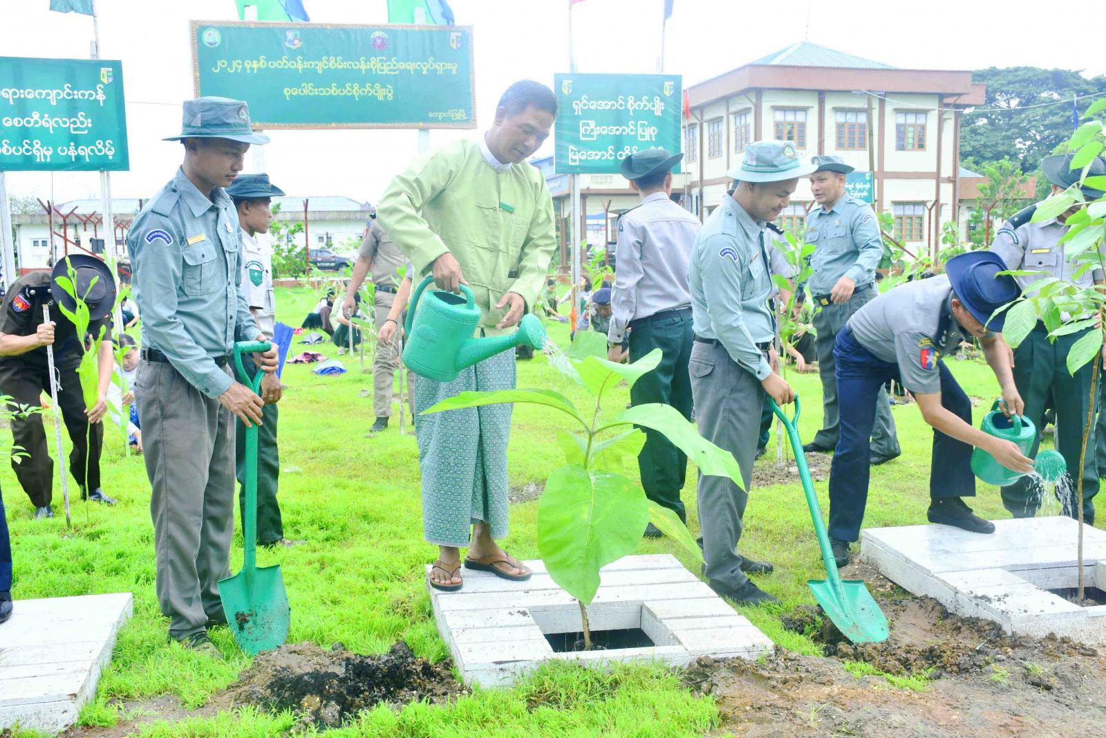 ရခိုင်ပြည်နယ်၊ ကျောက်ဖြူမြို့၌ ၂၀၂၄ ခုနှစ်၊ ပတ်ဝန်းကျင်စိမ်းလန်းစိုပြည်ရေးလှုပ်ရှားမှု စုပေါင်းသစ်ပင်စိုက်ပွဲကို ယနေ့နံနက်ပိုင်းက ကျောက်ဖြူခရိုင် ရဲတပ်ဖွဲ့မှူးရုံးခြံဝန်း၌ ကျင်းပပြုလုပ်ရာ ခရိုင်စီမံအုပ်ချုပ်ရေးအဖွဲ့ဥက္ကဋ္ဌနှင့်အဖွဲ့ဝင်များ၊ မြို့နယ်စီမံအုပ်ချုပ်ရေးအဖွဲ့ဥက္ကဋ္ဌနှင့် ဌာနဆိုင်ရာများ၊ မြန်မာနိုင်ငံရဲတပ်ဖွဲ့ဝင်များ၊ မီးသတ်တပ်ဖွဲ့ဝင်များ၊ မိခင်နှင့်ကလေးစောင့်ရှောက်ရေးဖွဲ့ဝင်များ၊ အမျိုးသမီးရေးရာအသင်းဝင်များ၊ ဆရာ၊ဆရာမများနှင့် ကျောင်းသား၊ ကျောင်းသူများ တက်ရောက်ကြသည်။