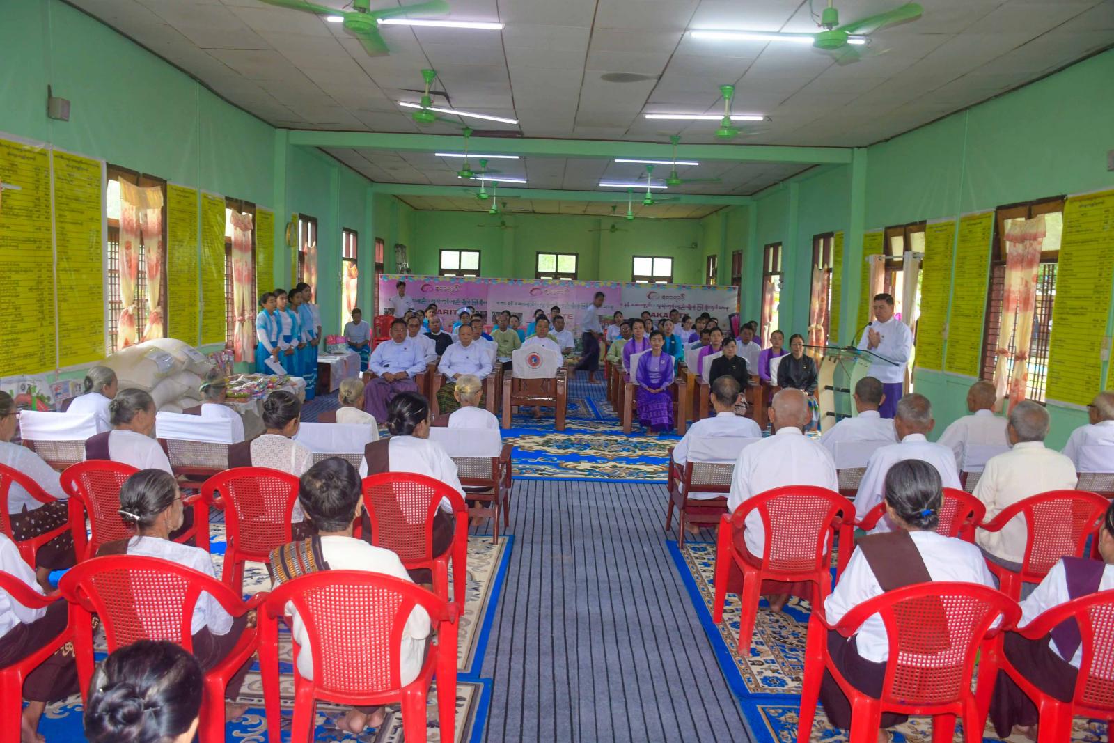 ဦးစွာ ရခိုင်ပြည်နယ်ဝန်ကြီးချုပ် ဦးထိန်လင်းက ယခုကဲ့သို့အဘိုးအဘွားများအား စုံစုံညီညီကျန်းကျန်းမာမာ ချမ်းချမ်းသာသာဖြင့် တွေ့ဆုံရသည့်အတွက် များစွာဝမ်းမြောက်မိပါကြောင်း၊ အဘိုးအဘွားများအနေဖြင့် ယခုကဲ့သို့ တရားဘာဝနာပွားများပြီး အေးအေးချမ်းချမ်းဖြင့် ပြည်နယ်အတွက် မေတ္တာဘာဝနာပွားများကာ မေတ္တာပို့သပေးနေကြသည်ဟုကြားသိရကြောင်း၊ ဘိုးဘွားများပို့သသည့် မေတ္တာဘာဝနာများကြောင့် ရခိုင်ပြည်နယ် ကြီးအေးချမ်းသာယာ ဖွံ့ဖြိုးတိုးတက်လာကာ ယခုထက်တည်ငြိမ်အေးချမ်းမှုရရှိပါစေကြောင်း ဆုမွန်ကောင်း တောင်းအပ်ပါကြောင်း၊ မိမိတို့ရခိုင်ပြည်နယ် အစိုးရအဖွဲ့အနေဖြင့် အဘိုးအဘွားများ စားရေရိက္ခာများ အဆင်ပြေစေရန်အတွက် ဆန်၊ ဆီနှင့် တစ်ကိုယ်ရေသုံးပစ္စည်းများကို လာရောက်လှူဒါန်းခြင်းဖြစ်ကြောင်း၊ မိမိတို့အနေဖြင့် အဘိုးအဘွားများကို မိဘများသဖွယ်လာရောက် လှူဒါန်းခြင်းဖြစ်ကြောင်း၊ အဘိုးအဘွားများအနေဖြင့်လည်း ကျန်းကျန်းမာမာချမ်းချမ်းသာသာဖြင့် မိမိတို့ပြည်နယ်၏အကျိုးအတွက် မေတ္တာပို့သကာ မိမိတို့အတွက် တရားဘာဝနာများပွားများ အားထုတ်နိုင်ပါစေကြောင်း ဂါရဝပြုနှုတ်ခွန်းဆက်ဆုတောင်းစကား ပြောကြားသည်။
