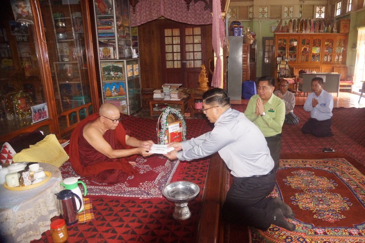 ဆက်လက်၍ ရှေးဟောင်းအမွေအနှစ် နှစ်(၁၀၀)ပြည့် မင်္ဂလာဟော်ကြီးပရိယတ္တိစာသင်တိုက် သို့သွားရောက်ကာ မင်္ဂလာဟော်ကြီးကျောင်းဆရာတော် ပြည်နယ်ဩဝါဒစရိယ၊ အဂ္ဂမဟာ သဒ္ဓမ္မဇောတိကဓဇ ဘဒ္ဒန္တစန္ဒိမာ အား သွားရောက်ဖူးမြှော်ကြည်ညိုခဲ့ပြီး စာသင်တိုက်အတွင်း ရေ၊ မီးရရှိရေး ဆောင်ရွက်ပေးမည့် အစီအမံများ၊ သံဃာတော်များ ဝါတွင်းကာလအတွင်း ပြန်လည်သီတင်းသုံးနိုင်ရေးနှင့် သာသနာရေးဆိုင်ရာများလျှောက်ထားကာ ဆွမ်းဆန်တော်၊ ဆီနှင့် လှူဖွယ်ဝတ္ထုပစ္စည်းများ ဆက်ကပ်လှူဒါန်းခဲ့သည်။