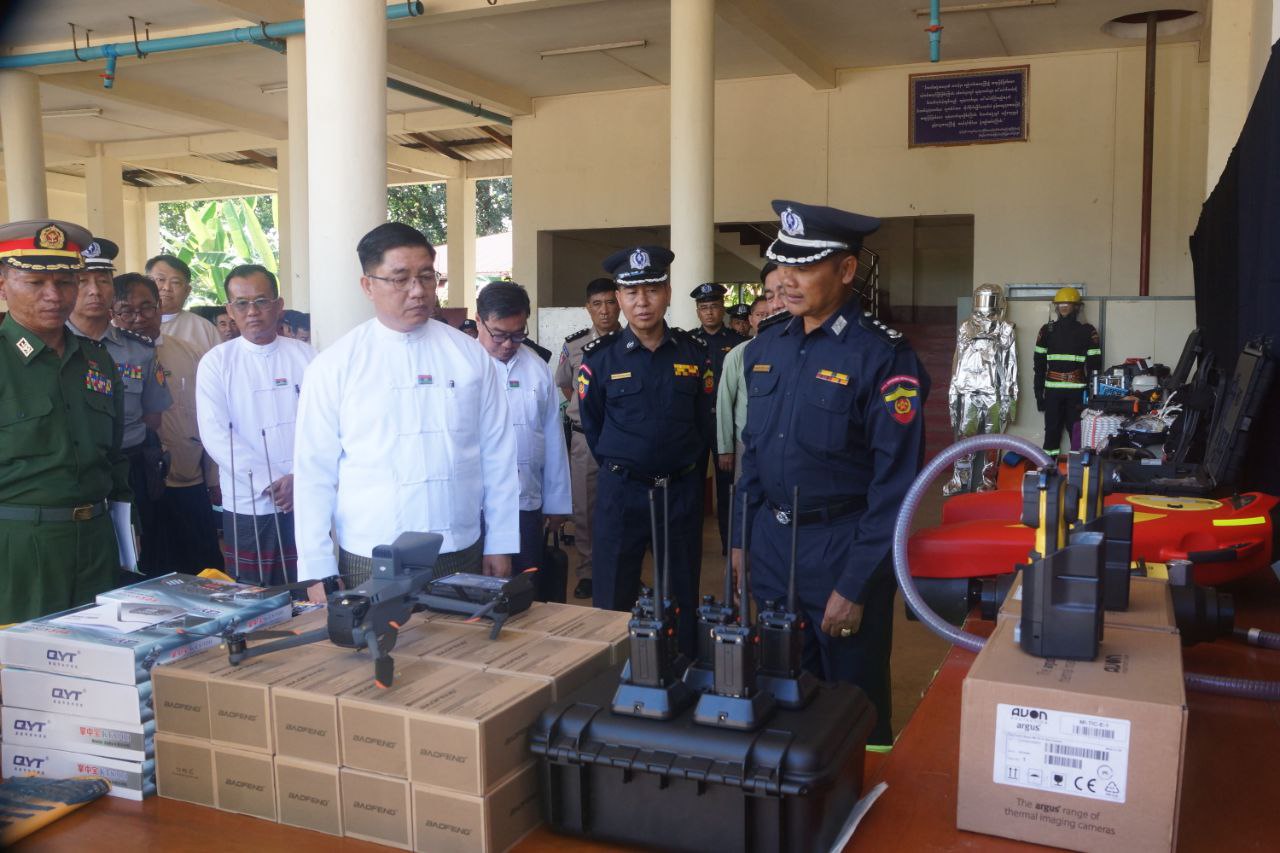 ယင်းနောက် ပြည်နယ်ဝန်ကြီးချုပ်နှင့်တာဝန်ရှိသူများက ပြည်နယ်မီးသတ်ဦးစီးမှူးရုံး၊ အစည်းအဝေးခန်းမတွင် ခင်းကျင်းပြသထားသော မီးငြှိမ်းသတ်ရေးပစ္စည်းများနှင့် ရှာဖွေကယ်ဆယ်ရေးသုံးပစ္စည်းများအား လိုက်လံကြည့်ရှုစစ်ဆေးခဲ့သည်။